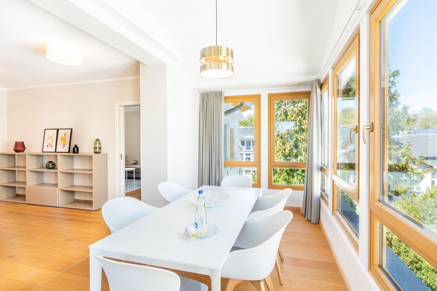 Lieblingsplatz wird der schöne Esstisch in der verglasten Veranda sein: hier haben Sie nicht nur einen schönen Rundumblick in eine stilvolle Umgebung, sondern auch viel Platz zum Essen oder Spielen. Hier lässt es sich sicherlich auch hervorragend und konzentriert arbeiten..... Spaß zu Kochen macht es in der mit Markengeräten ausgestatteten modernen Einbauküche. Wer will da noch ins Restaurant gehen? Im Wohnzimmer steht Ihnen ein großer Smart-TV zur Verfügung. So steht dem ausgiebigen Fernsehvergnügen nichts im Wege. Die Nutzung des WLAN ist kostenfrei. Im Keller stehen Ihnen eine Münzwaschmaschine sowie ein -trockner zur Verfügung. Fahrräder können am Haus oder im Abstellraum abgegestellt werden. Ein gebührenfreier PKW-Stellplatz am Haus ist vorhanden. Zusätzlich erhalten Sie 50% Rabatt auf den Eintrittspreis der Ostseetherme.