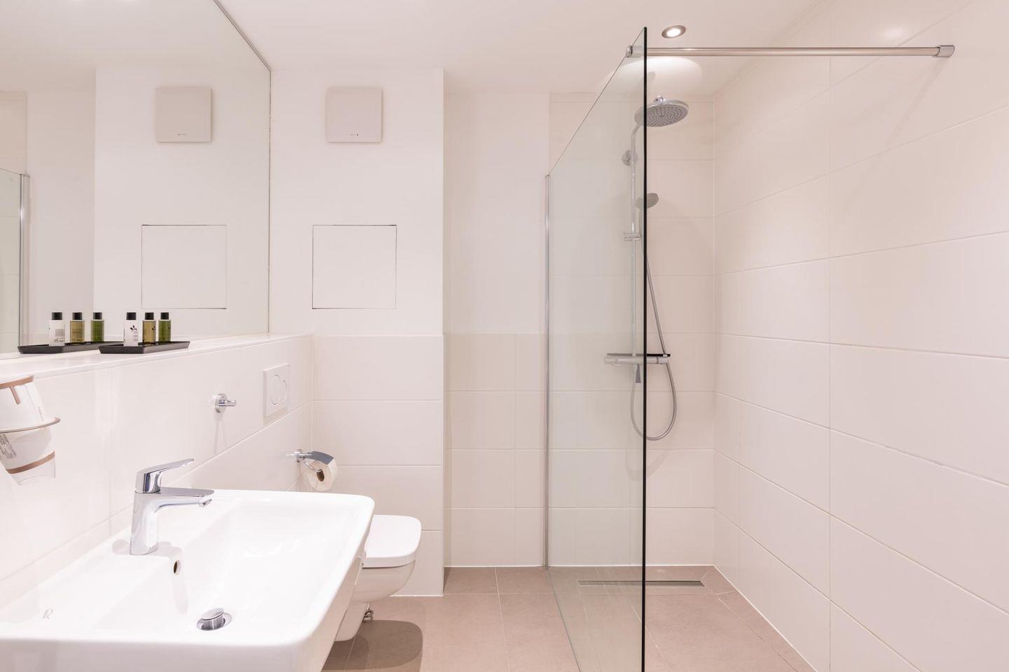 Im Badezimmer erwartet den Gast eine moderne "Walk-In-Dusche". Ein Handtuchhalter-Heizkörper sowie ein großer Wandspiegel ergänzen die komfortable Ausstattung. Im Badezimmer liegen neben Handtüchern auch Pflegeprodukte bereit.
