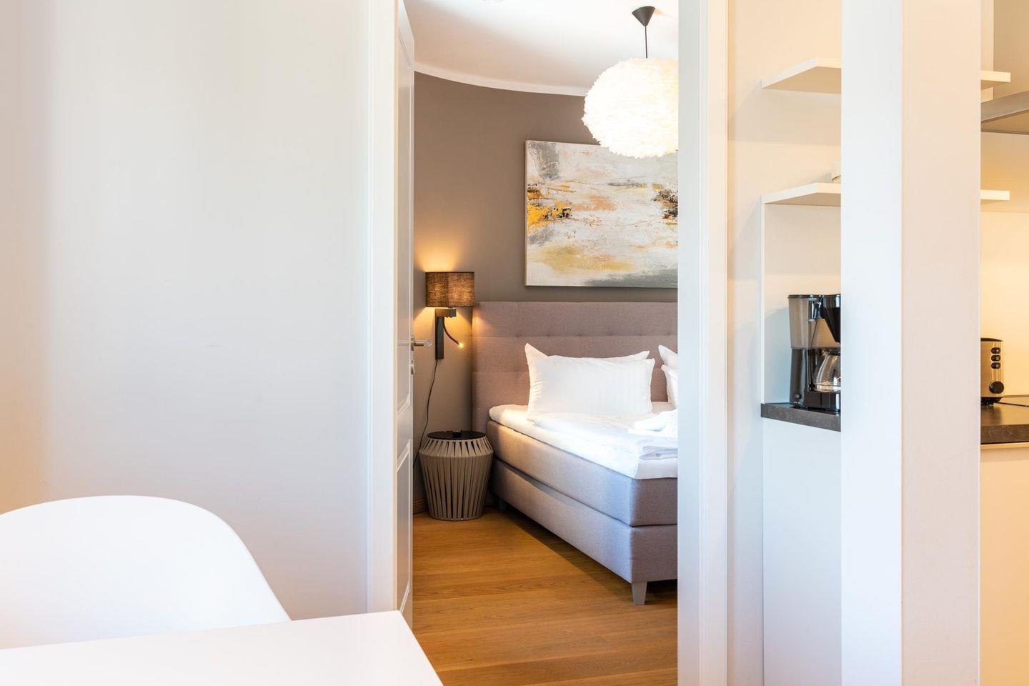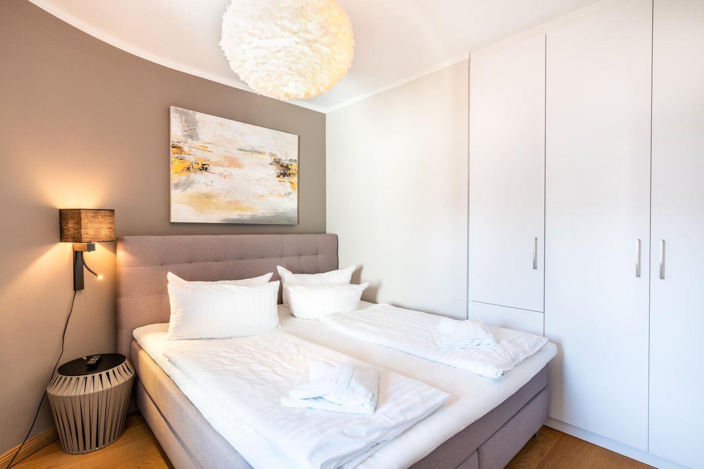 Im separaten Schlafzimmer stehen ein schönes Boxspring-Bett sowie ein großer Smart-TV zur Verfügung. Die Urlaubsgarderobe findet ihren Platz in dem eingebauten Wandschrank.