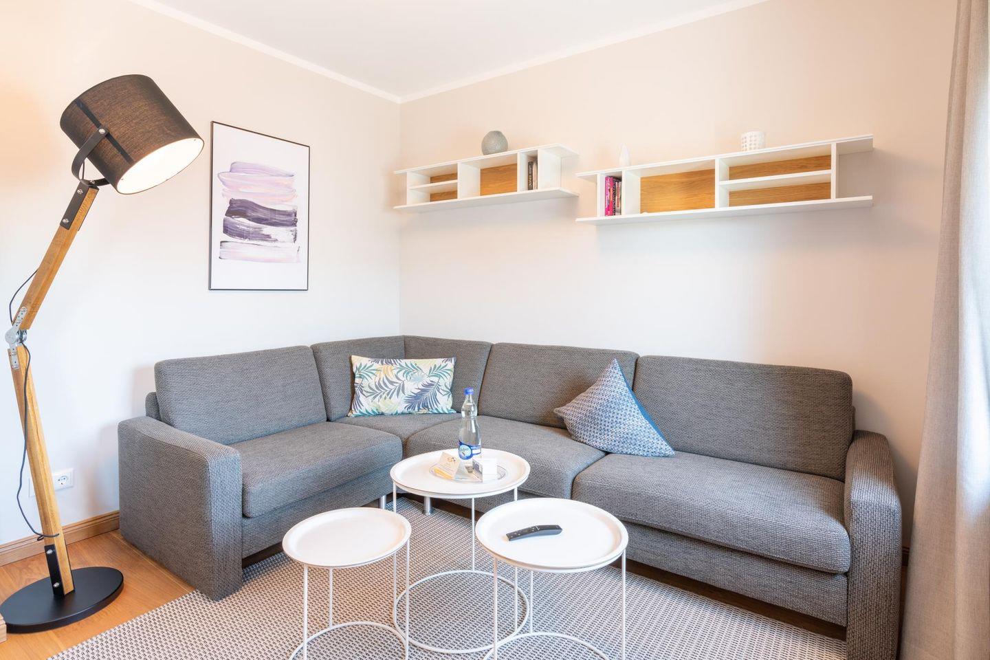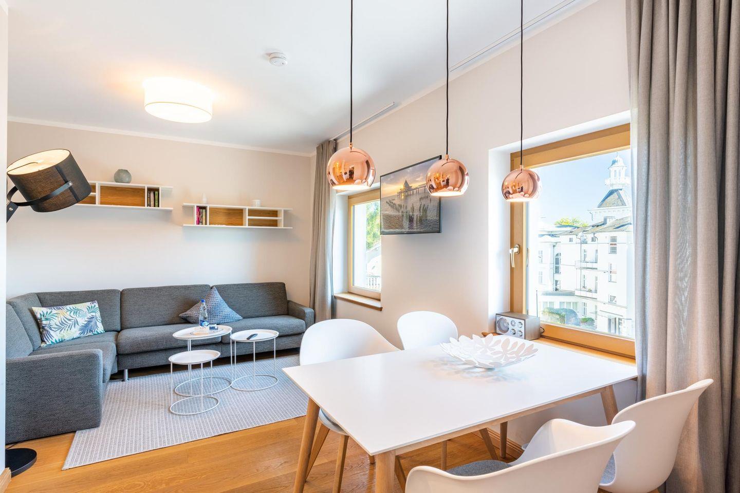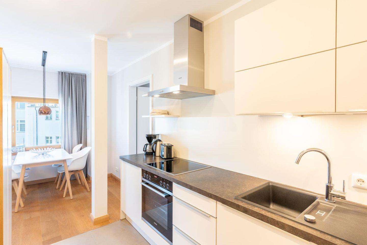 Wohn- und Essbereich sind kombiniert. Neben der mit Markengeräten ausgestatteten Küchenzeile gibt es einen schönen Essplatz am Fenster sowie eine hochwertige Sitzgarnitur. Wie im Schlafzimmer steht auch hier ein Smart-TV für ausgiebige Fernsehabende bereit.