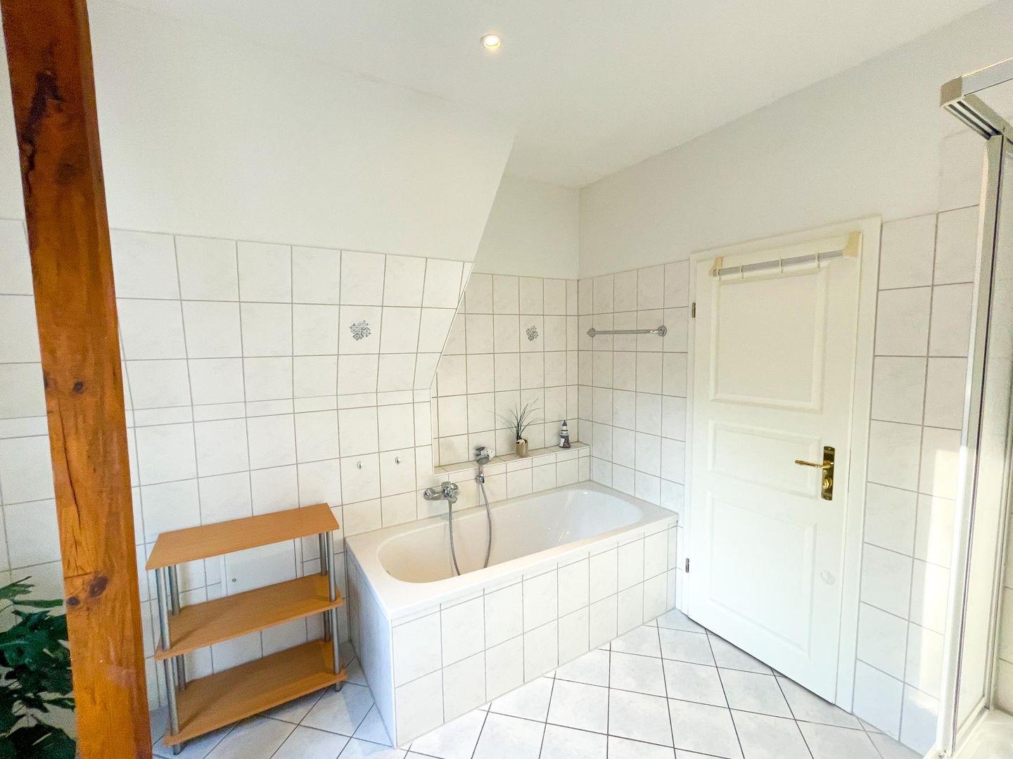 Das schöne Badezimmer mit Dusche, Wanne und WC sowie eigener Waschmaschine rundet diese attraktive Ferienwohnung ab.