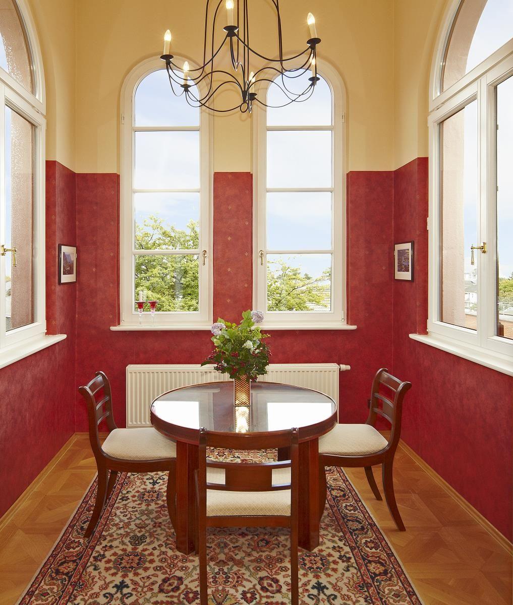 Als "Zeitsprung" beschrieb jüngst ein Gast seinen Aufenthalt in der knapp 70m² umfassenden Ferienwohnung. Die gediegenen hochwertigen Möbel erinnern in der Tat an die alte Zeit. Doch auch die moderne Technik von heute hat Einzug gehalten: neben zwei Flachbild-Fernsehern runden ein WLAN-Anschluss sowie eine moderne Musikanlage von Bose das Unterhaltungsangebot ab. Der großzügige Wohnbereich unterteilt sich in die gemütliche Sitzecke sowie in eine integrierte Küchenzeile mit Theke - und auch vom Küchenfenster genießen Sie den Meerblick. Vom Wohnraum aus betreten Sie das "herrschaftliche" Turmzimmer: hier kann gegessen, gelesen oder einfach nur geträumt werden... Die Wohnung befindet sich im 3. Obergeschoss des Hauses und ist daher für Gäste mit Gehbehinderungen oder für kleine Gäste nur bedingt geeignet. Hinter dem Haus befindet sich ein PKW-Stellplatz.