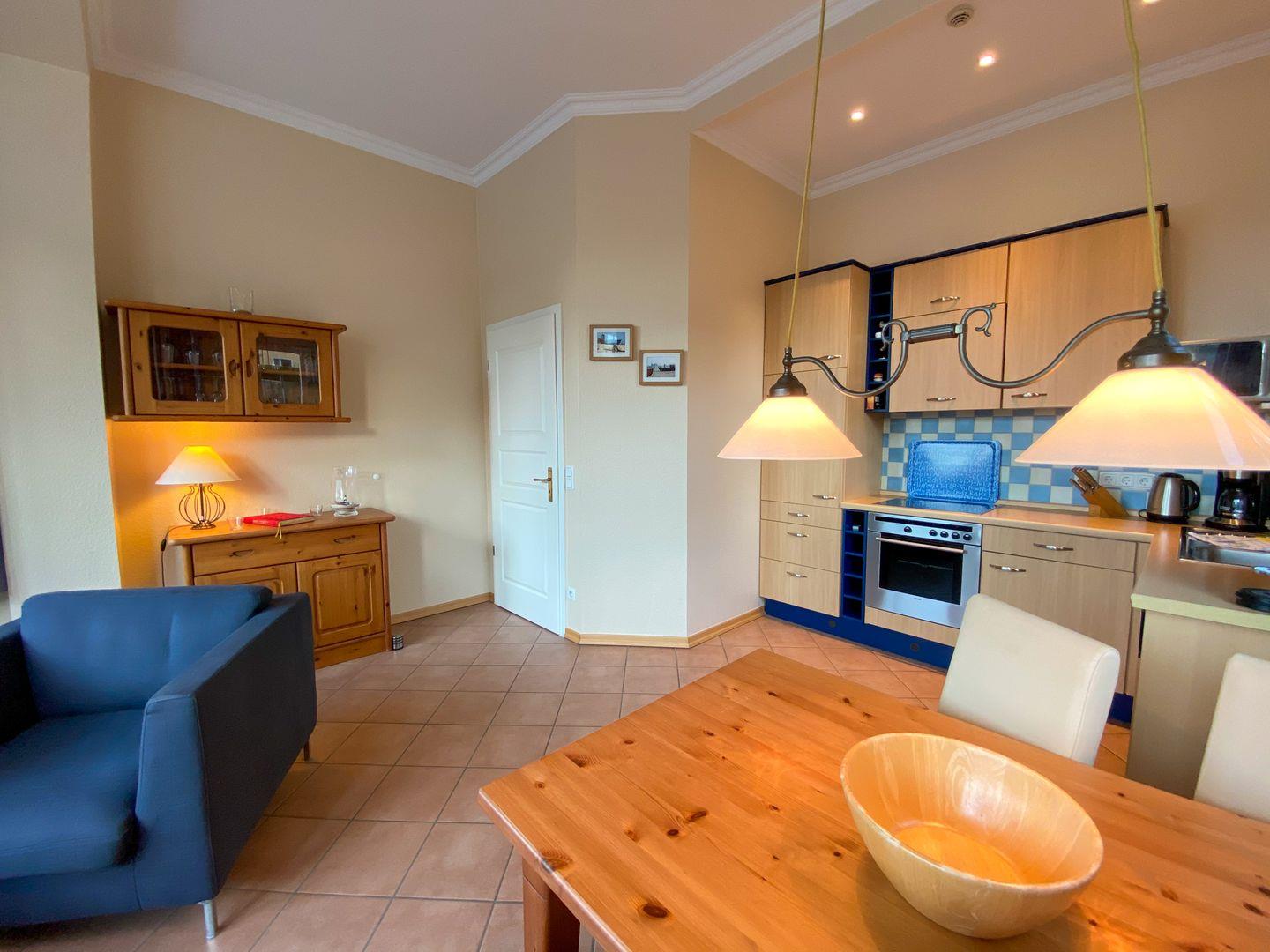 Die offene Einbauküche gibt dem Wohnzimmer durch den gemütlichen Esstisch eine besondere Note. Die Küche ist perfekt ausgestattet - sogar eine moderne Kaffee-Kapsel-Maschine steht für den ersten Genuss des Urlaubstages zur Verfügung. Vom Wohnzimmer aus genießt man durch die großflächigen Fenster des vorgebauten Erkers einen wunderschönen Blick in die Umgebung.