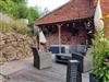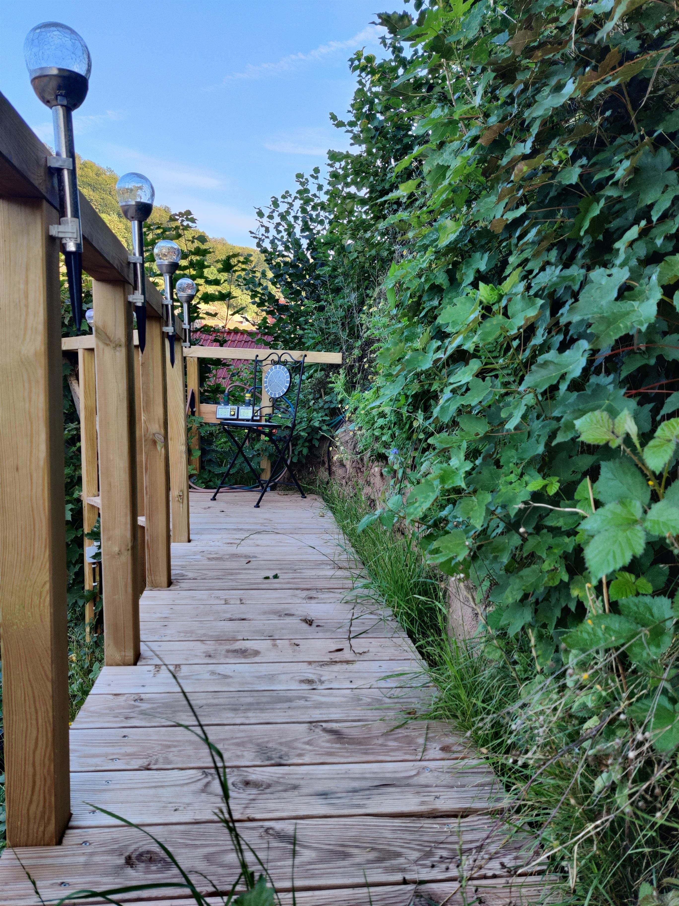 Das Haus liegt direkt am Hang. Eine mit Natursteinen eingefasster Außenbereich bietet eine tolle Terrasse mit Grillmöglichkeit und Feuerstelle. Hier kann man die Abendsonne mit schönen Sonnenuntergängen genießen. Auch Nachts kann man es dank gemütlicher Beleuchtung und Feuerschale lange auf der Terrasse aushalten.