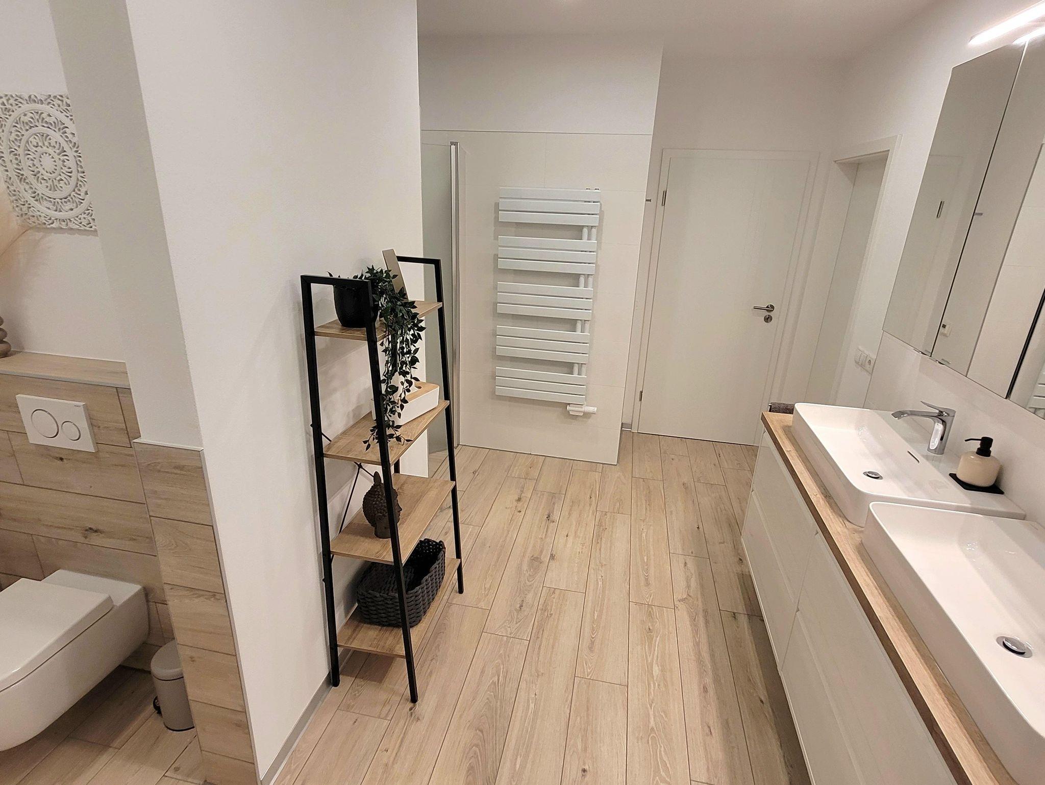 Ebenfalls bietet Ihnen die Wohnung ein modernes helles Bad mit barrierefreier großen Dusche und WC, eine Gästetoilette, einen Abstellraum, einen großzügigen Flur mit Garderobeneinbauschrank usw..