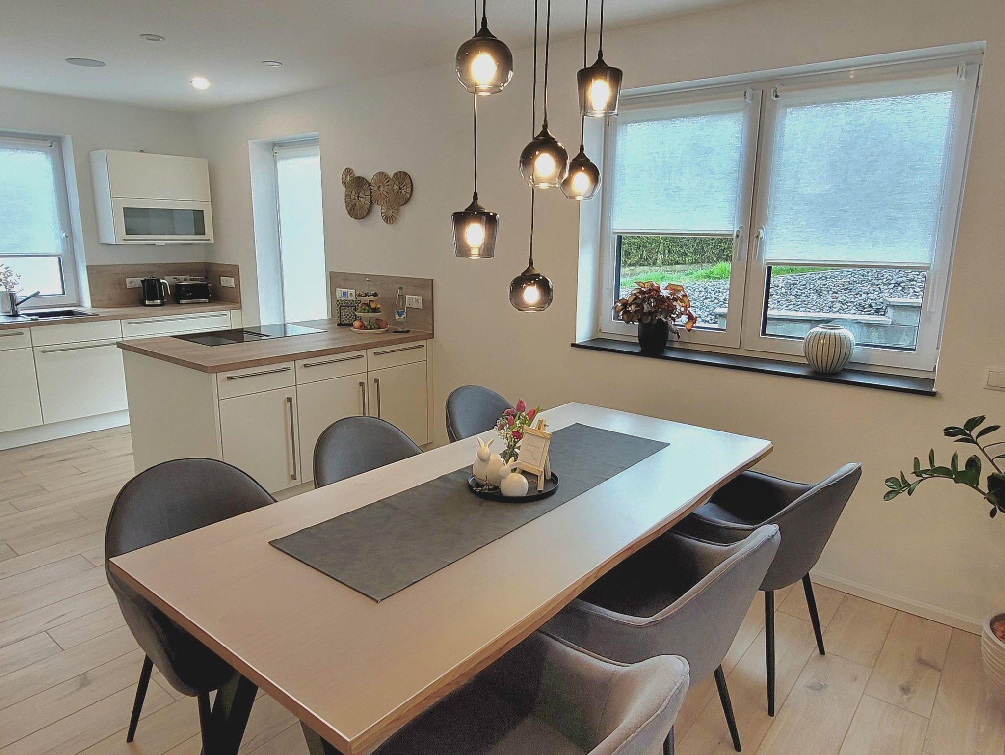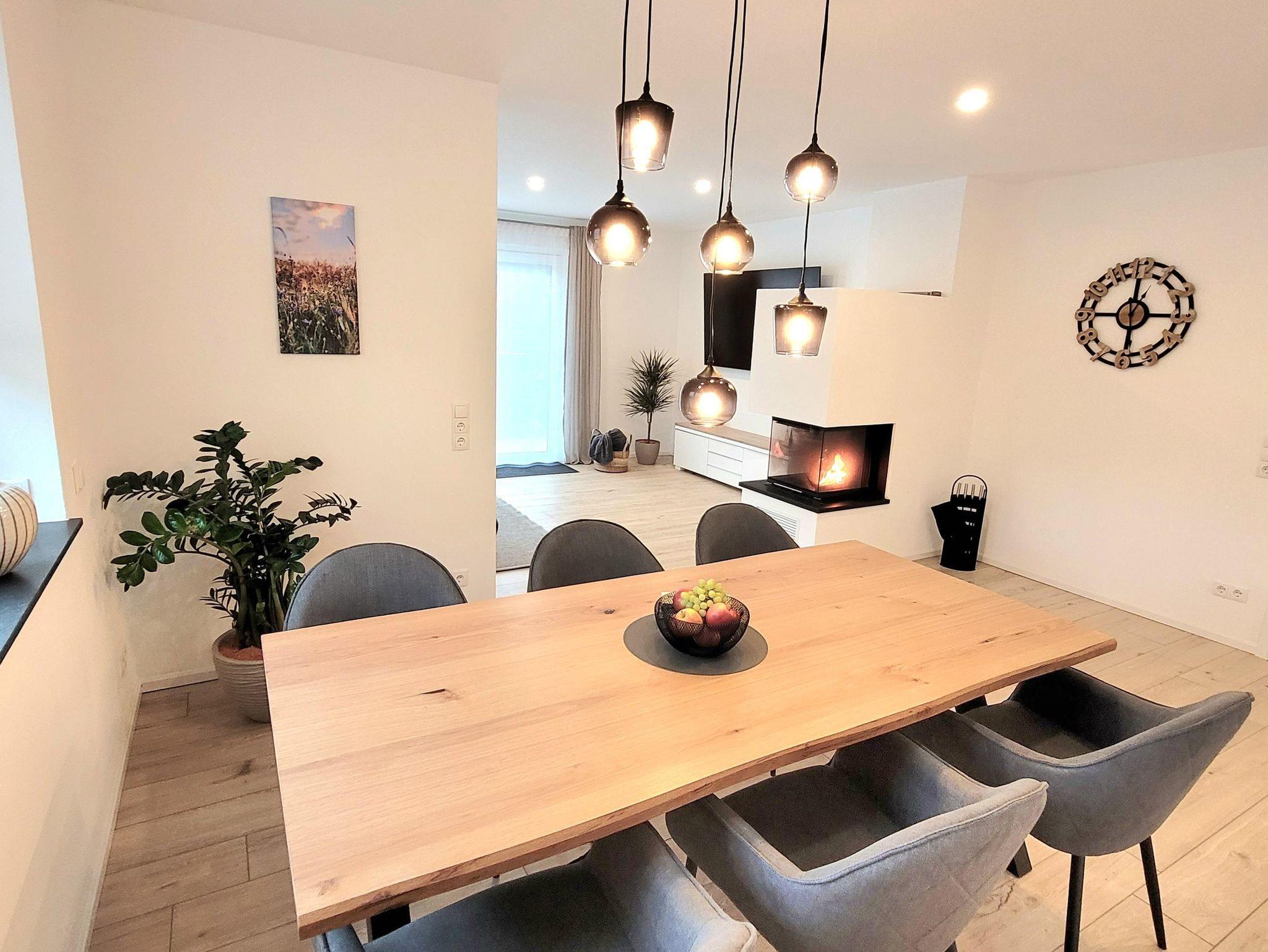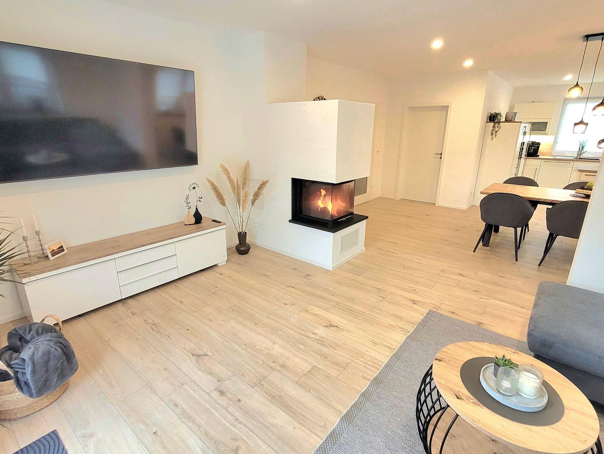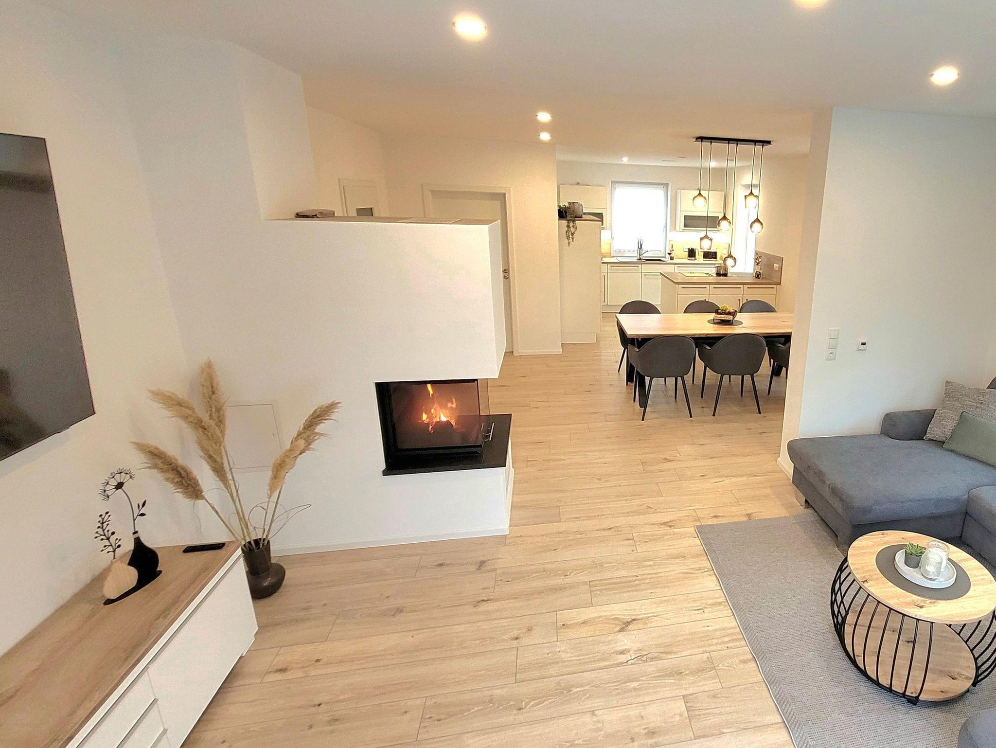 Ein heller, offener Wohn-Essbereich lädt zum Verweilen ein. Egal ob Sie Ihre Lieben in der vollausgestatteten Küche bekochen möchten oder es sich lieber auf der großen Couch gemütlich machen.