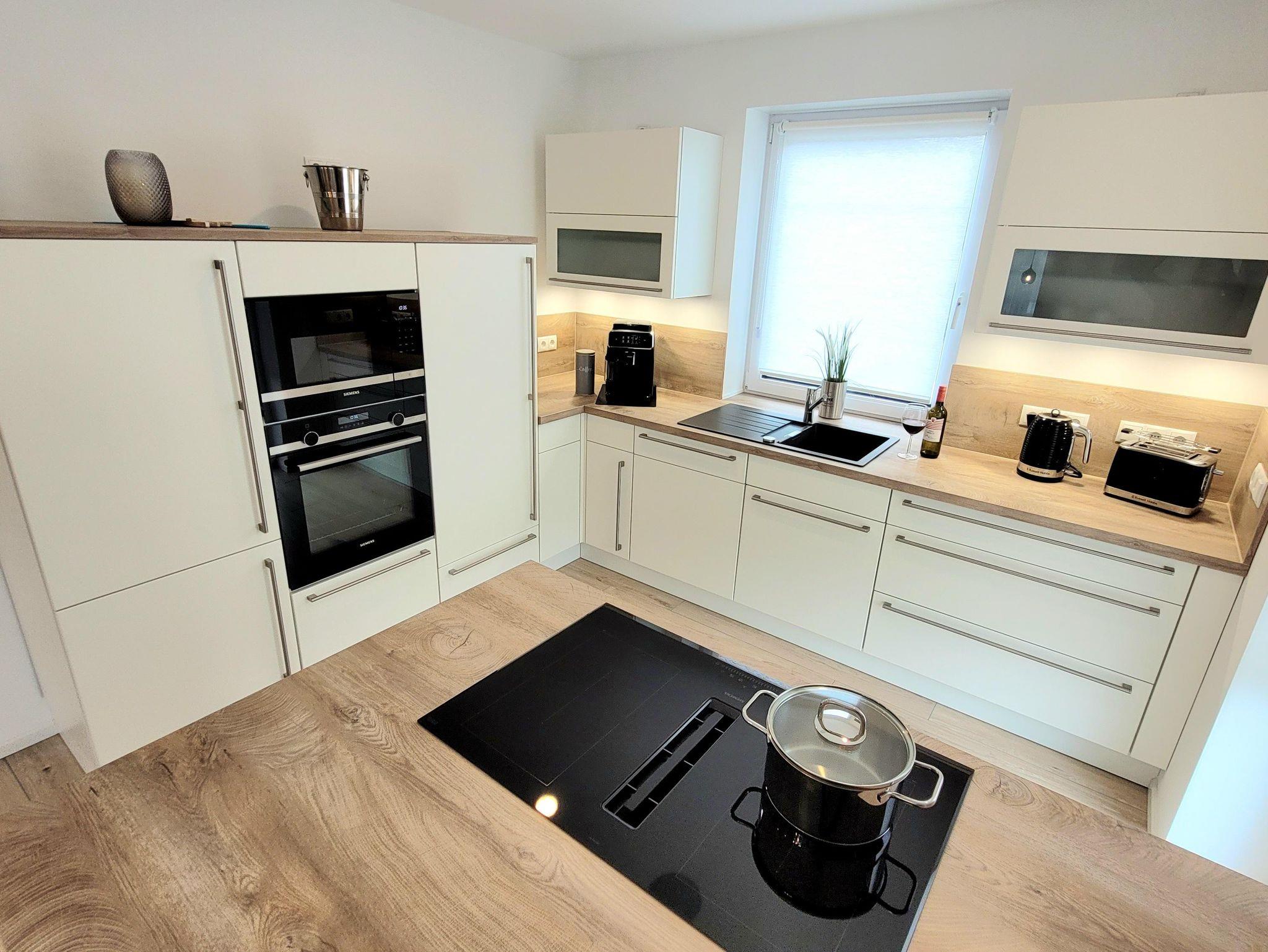 Die Küche mit Kochinsel ist mit vielen Details ausgestattet. Sie finden mit Induktionskochfeld, Kaffeevollautomat, Kühlschrank mit Gefrierfach, Backofen, Mikrowelle, Spülmaschine, etc. alles was Sie für einen angenehmen Aufenthalt benötigen.