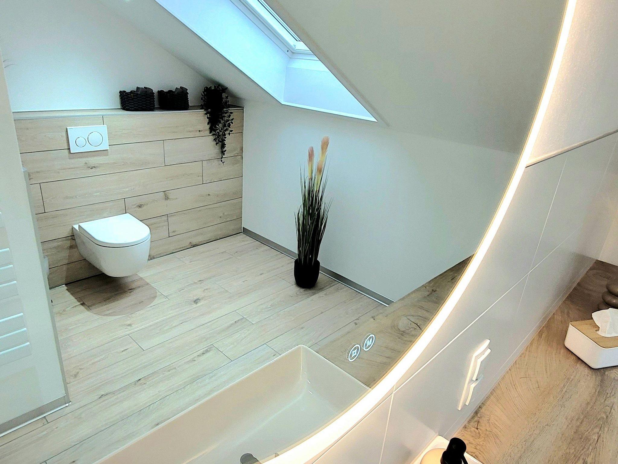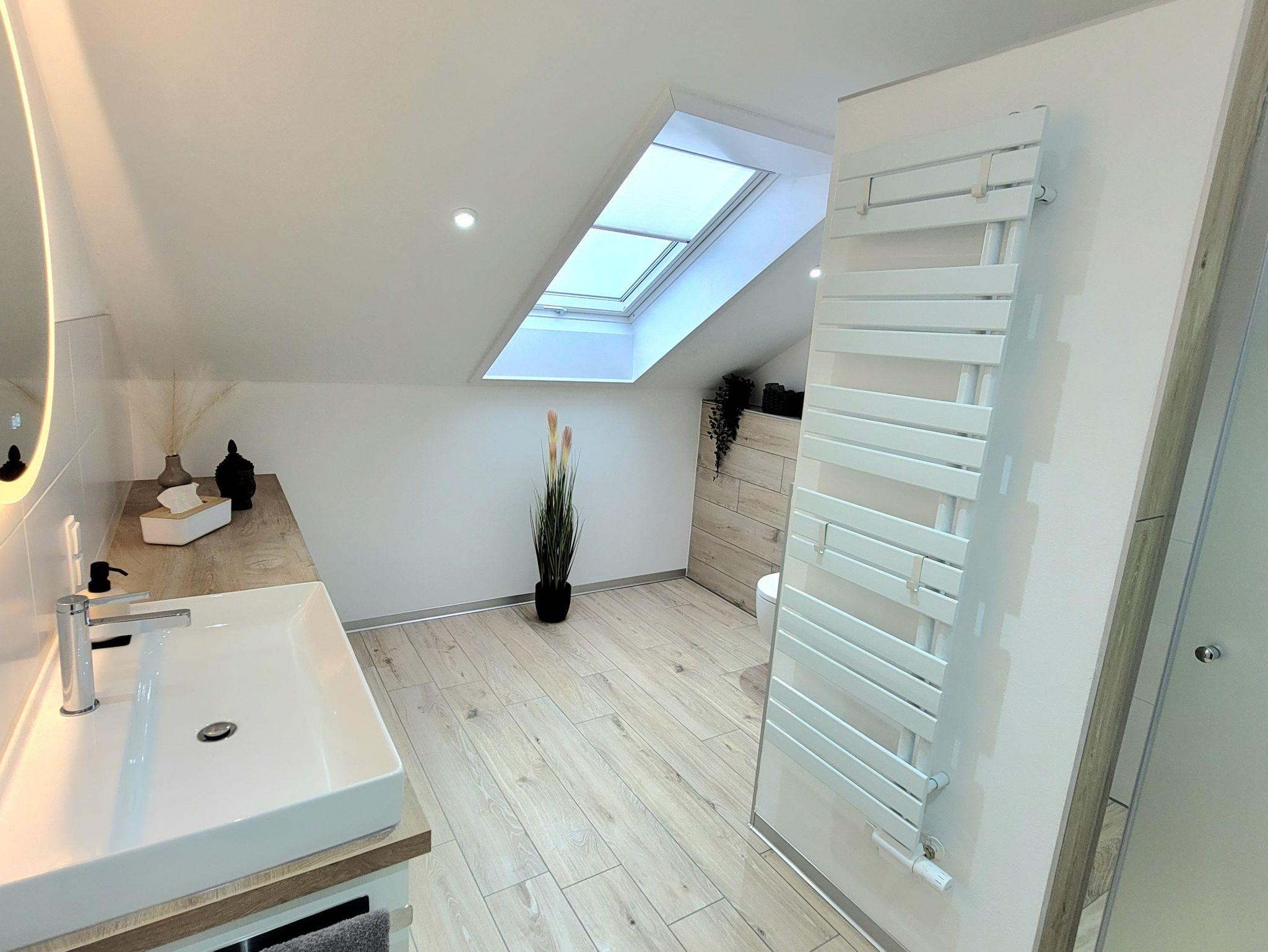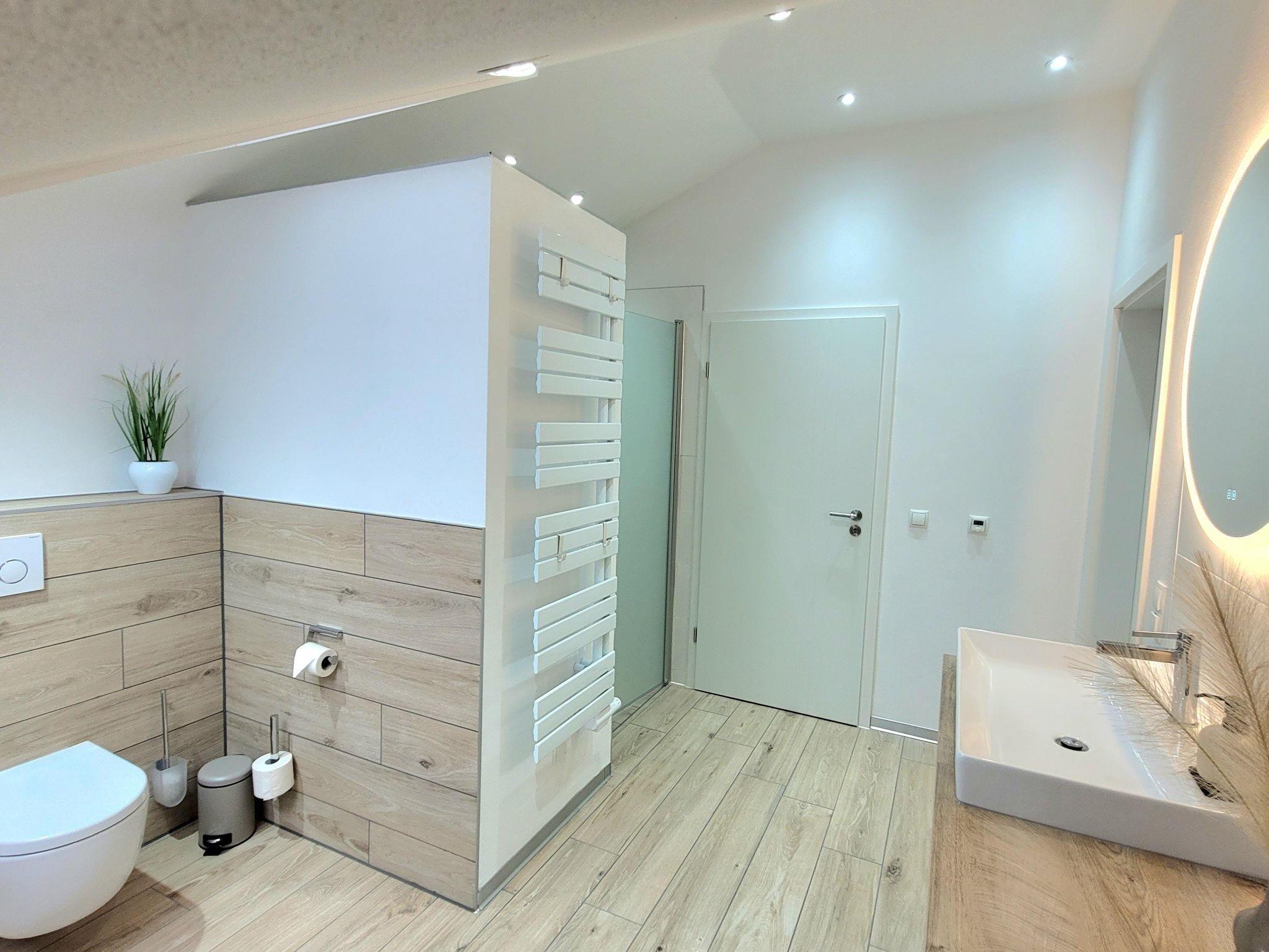 Ein freundliches Bad mit großem Waschtisch, beleuchtetem Spiegel, WC und ebenerdiger Dusche machen Ihren Aufenthalt perfekt.