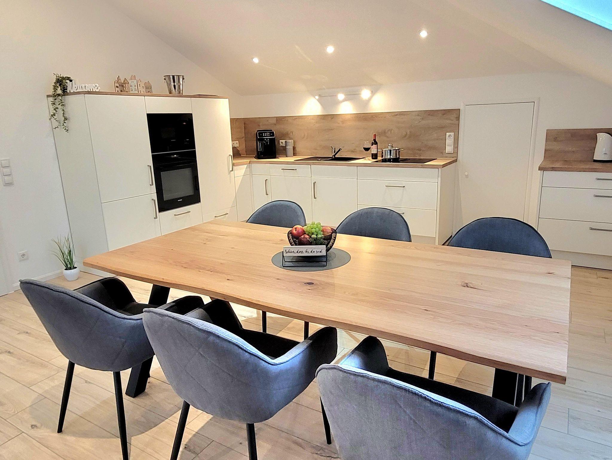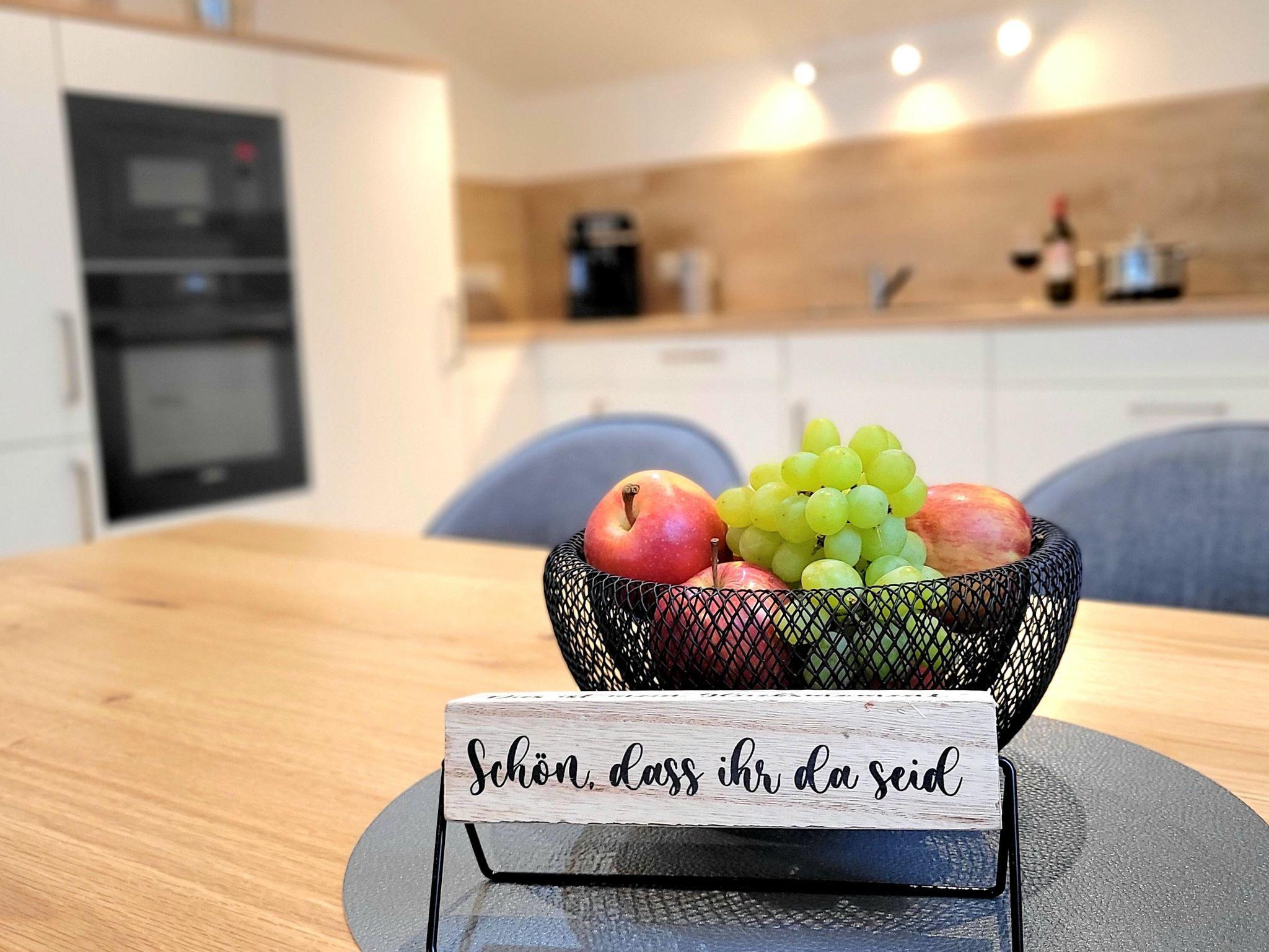 Die Küche lässt mit Kaffeevollautomat, Induktionskochfeld, Kühlschrank mit Gefrierfach, Backofen, Mikrowelle, Spülmaschine usw. keine Wünsche offen.
