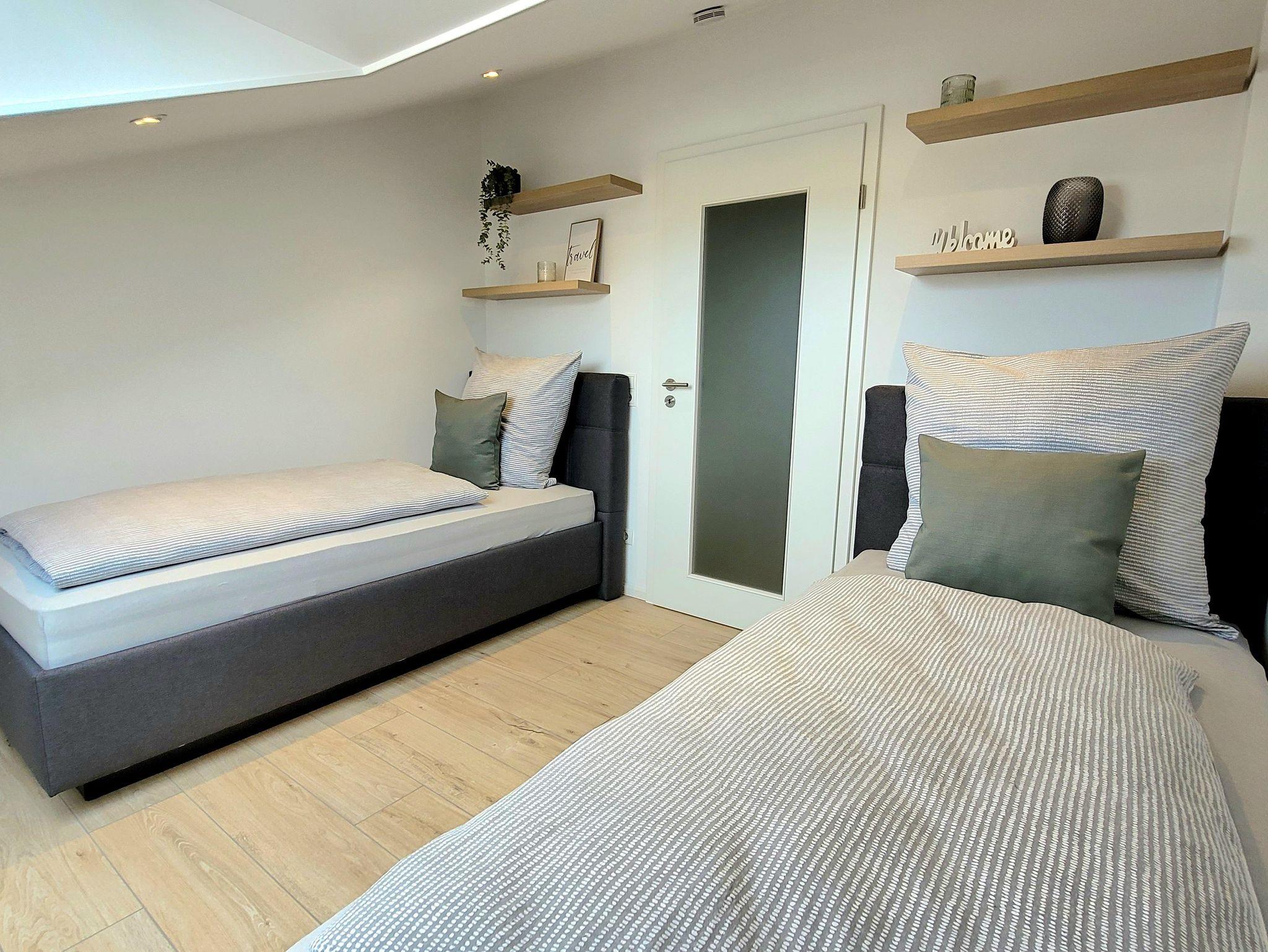 Es stehen Ihnen zwei Schlafzimmer zur Verfügung. Ein großes Zimmer mit Doppelbett und TV, sowie ein kleineres Schlafzimmer mit zwei Einzelbetten und TV. Bettwäsche ist im Preis enthalten und die Betten sind für Sie bei Anreise bezogen.