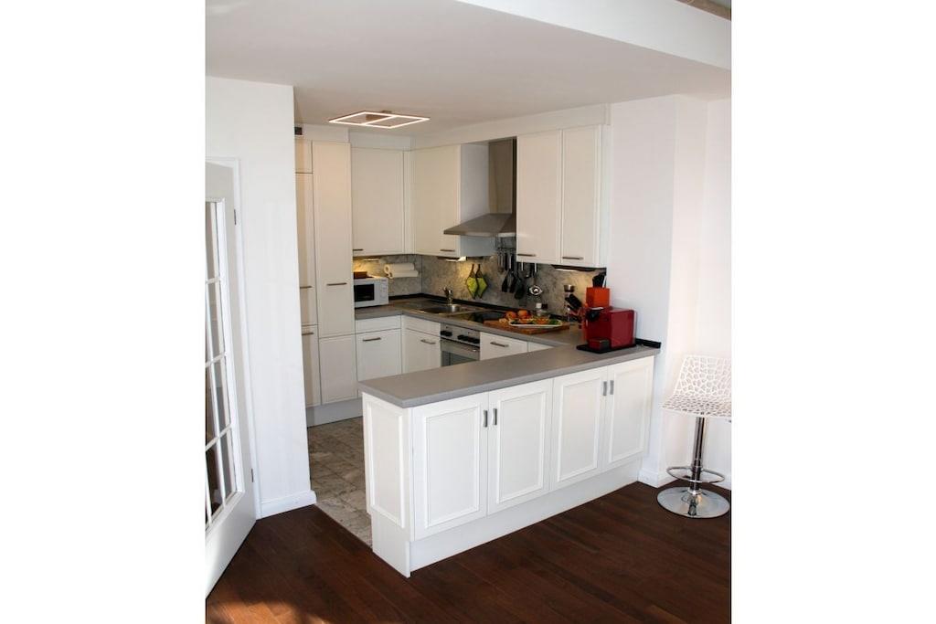 Stueetage: (Gæsteophold Stueetage(Internetadgang, Førstehjælp, varme, parkering), Køkken(tekøkken, dobbeltseng, kakkelovn, elkedel, brødrister, komfur, kaffemaskine, ovn, mikrobølgeovn, opvaskemaskine , køleskab, fryser), stue / spisestue(bibliotek, radio), badeværelse(badekar, bruser, bidet, Håndklæder mod et gebyr), guest toilet(toilet), pulterkammer(strygebræt, strygejern)) På 5. etage: (Soveværelse med badeværelse(dobbeltseng), svalegang soveværelse(fjernsynsstue, klimaanlæg, solstole)) Loft: (drying room(vaskemaskine)) Sidebygning: (balkon(have))