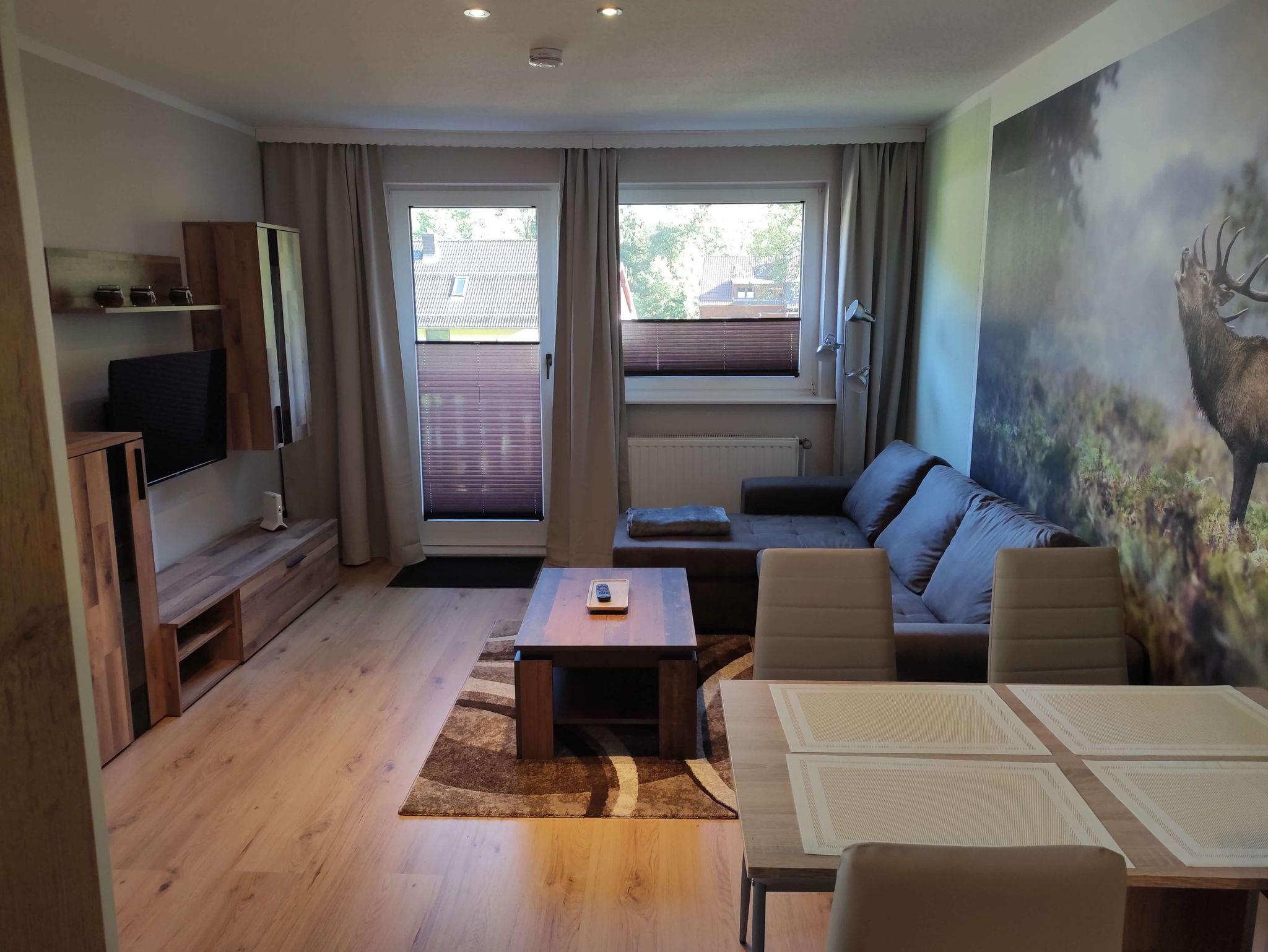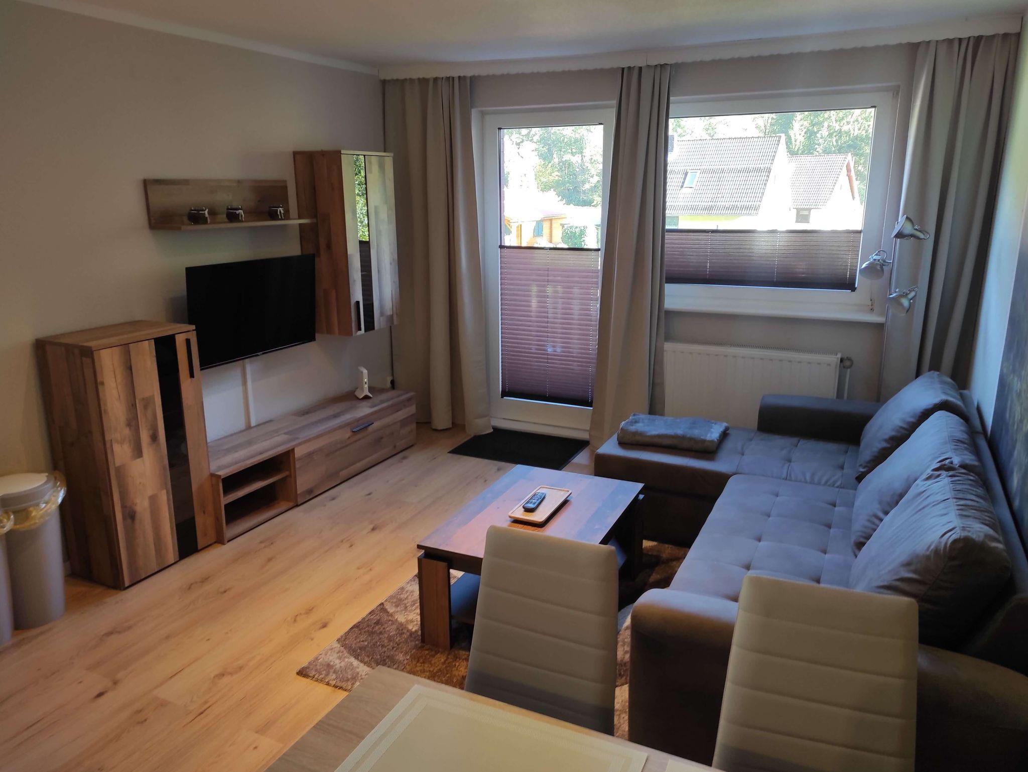 ein Wohn- Esszimmer mit Smart-TV und einer Couch, auf der Sie sich nach einem aktiven Tag erholen können. Auf dieser Couch können auch 2 weitere Personen schlafen.