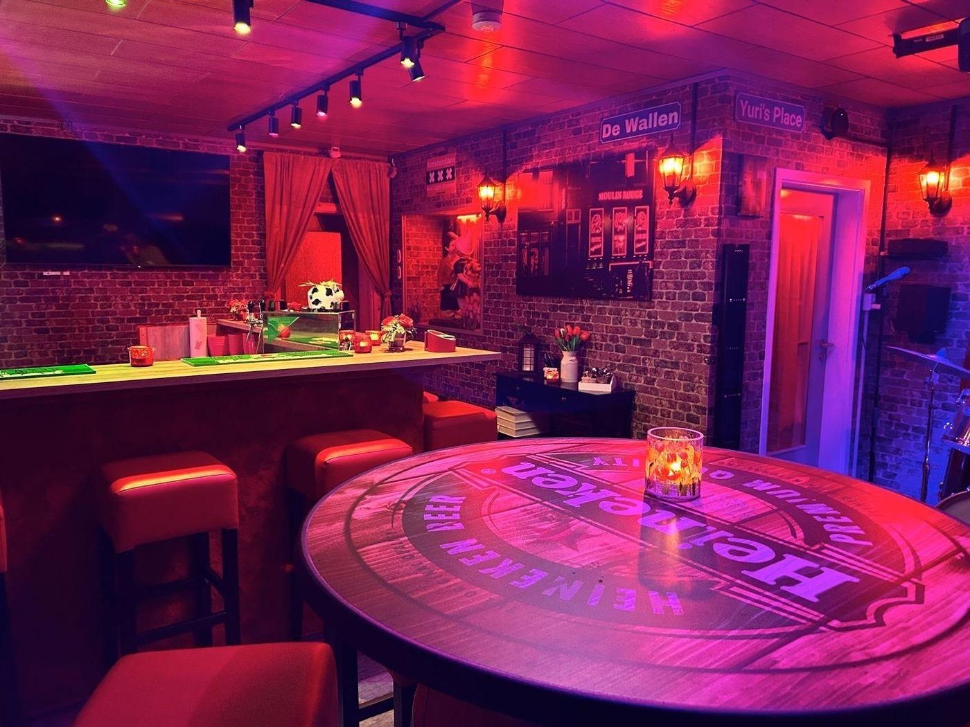 Es beginnt bereits in der Halle, man hat das Gefühl, an den rot beleuchteten Grachten entlangzulaufen, und sobald man durch die Tür tritt, befindet man sich in einer gemütlichen „Redlight District Bar” mit dem Namen Klein Amsterdam. In diesem Raum befinden sich eine Bar und hohe runde Sitz-/Stehtische. Selbstverständlich ist das Ganze mit einem Augenzwinkern an den berüchtigtsten Quadratkilometer Amsterdams eingerichtet.