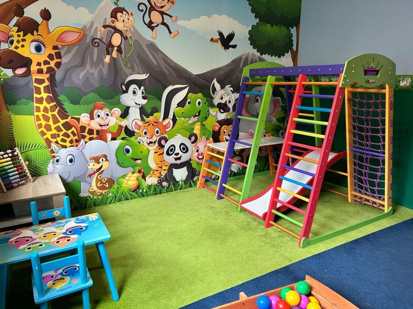 ? Im Untergeschoss gibt es noch ein zweites Spielzimmer mit den Themen Dschungel und Ozean, das ausgestattet ist mit: