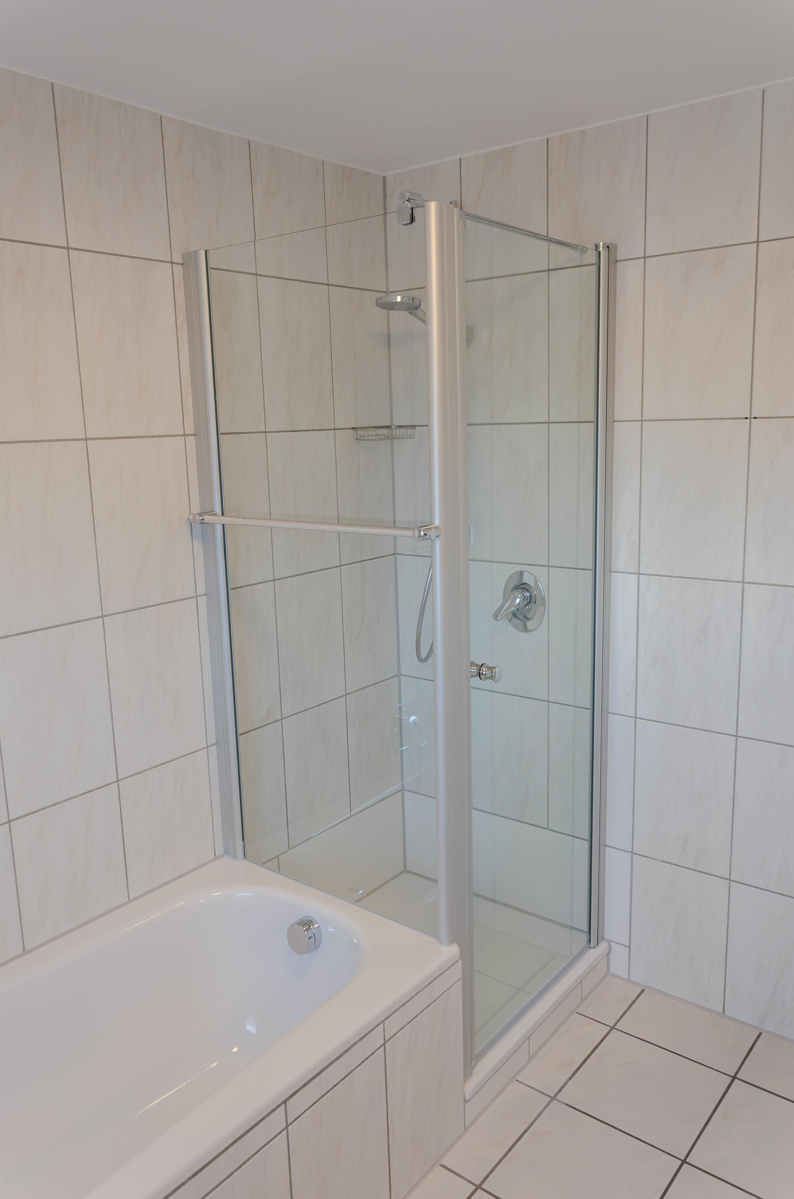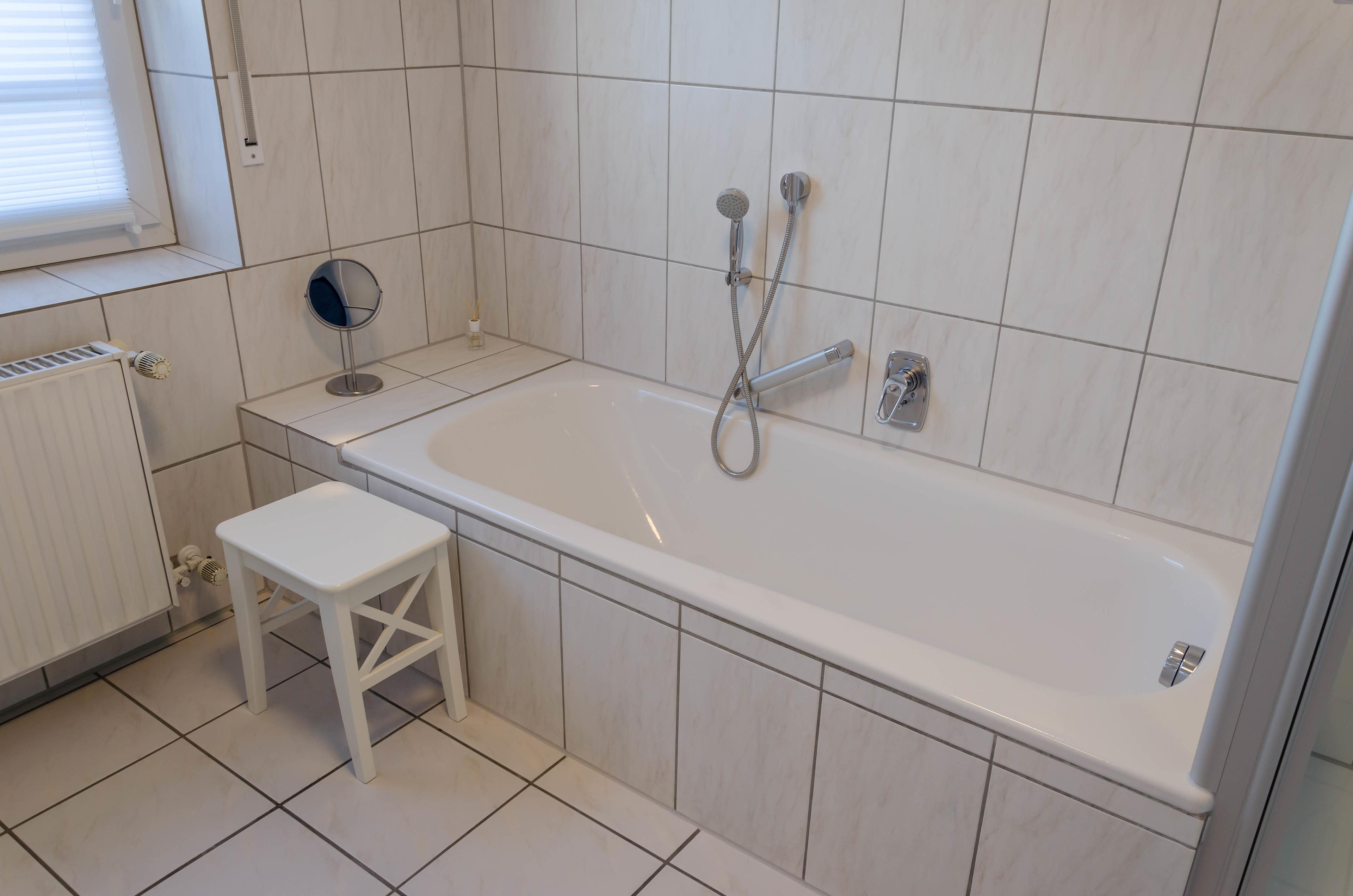 Das Badezimmer verfügt über eine Dusche und eine Badewanne. Ein Fön, Schminkspiegel und Badhocker sind vorhanden. Ein Handtuchpaket ist in der Buchung inbegriffen.