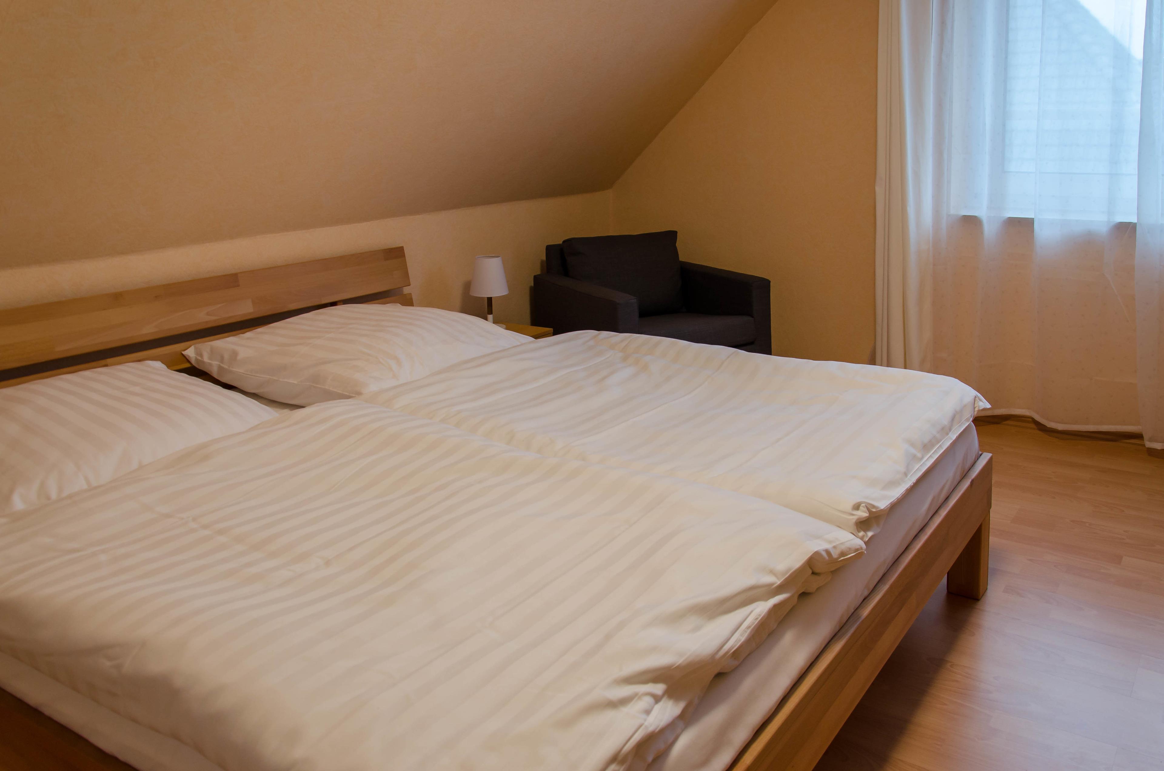 Die Schlafzimmer haben jeweils ein Doppelbett mit 2 Nachttischen und einem Radiowecker. Ein Kleiderschrank und eine bequeme Sitzgelegenheit sind in jedem Zimmer vorhanden. Die Betten sind bereits bezogen.