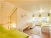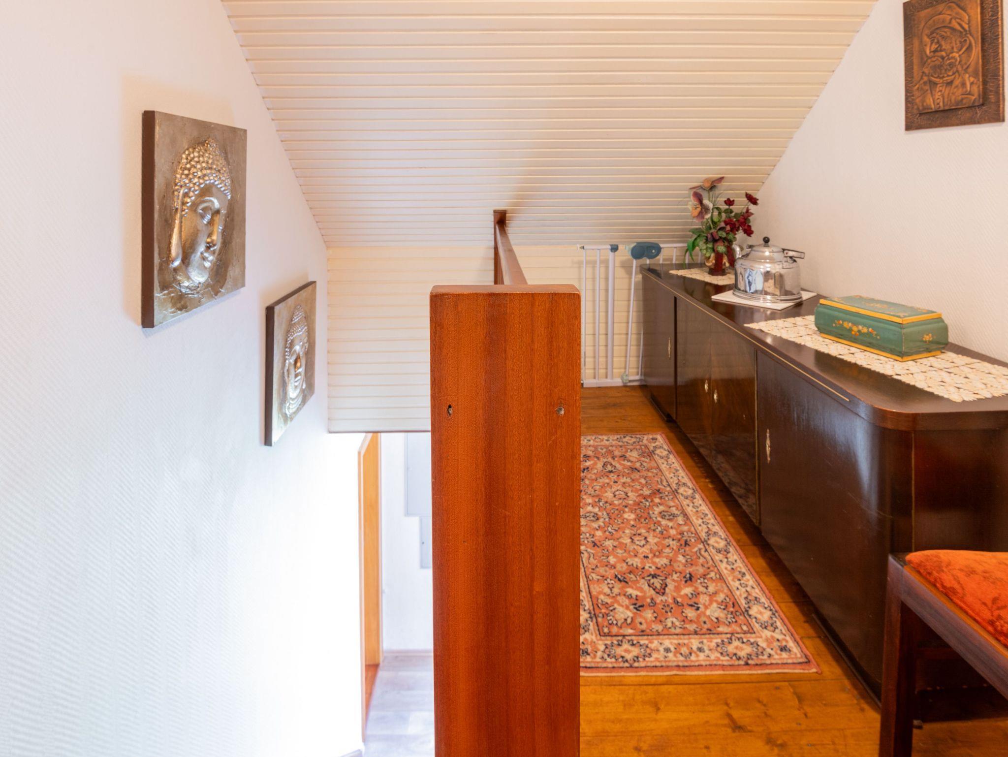 Im Obergeschoss befindet sich ein großes und geschmackvoll eingerichtetes Mehrbettzimmer. Es verfügt über zwei Einzelbetten (0,90 m x 2,00 m) die bei Bedarf zusammen gestellt werden können, sowie ein drittes Bett (1,40 m x 2,00 m) und ein zusätzliches Kindergitterbett.