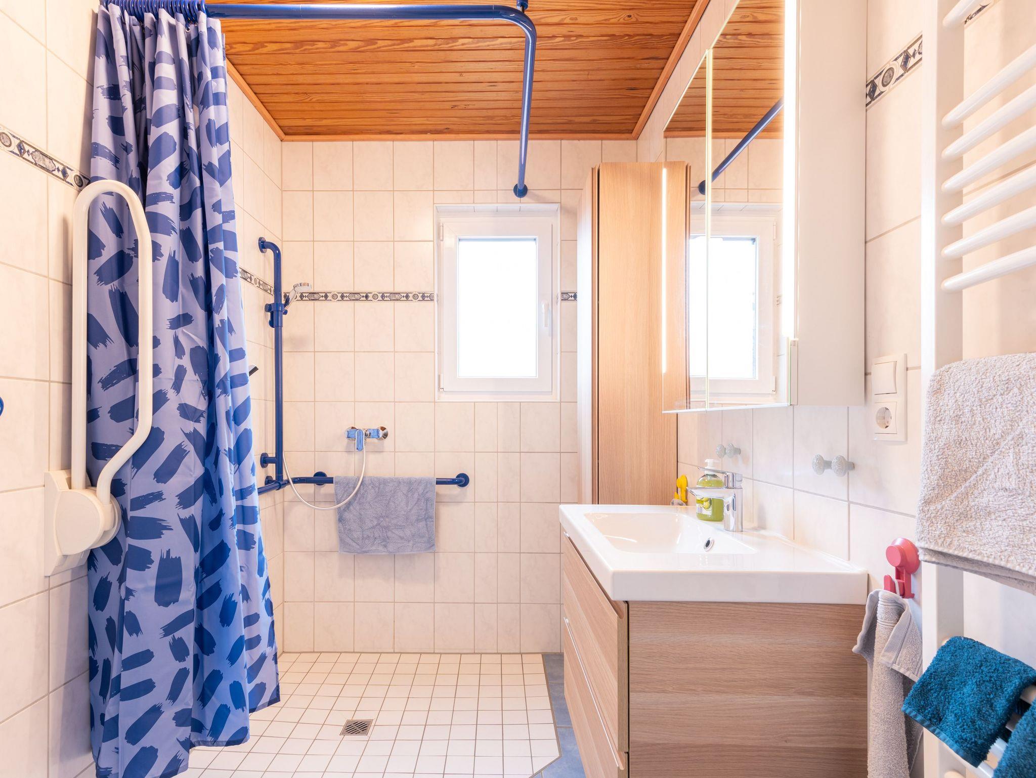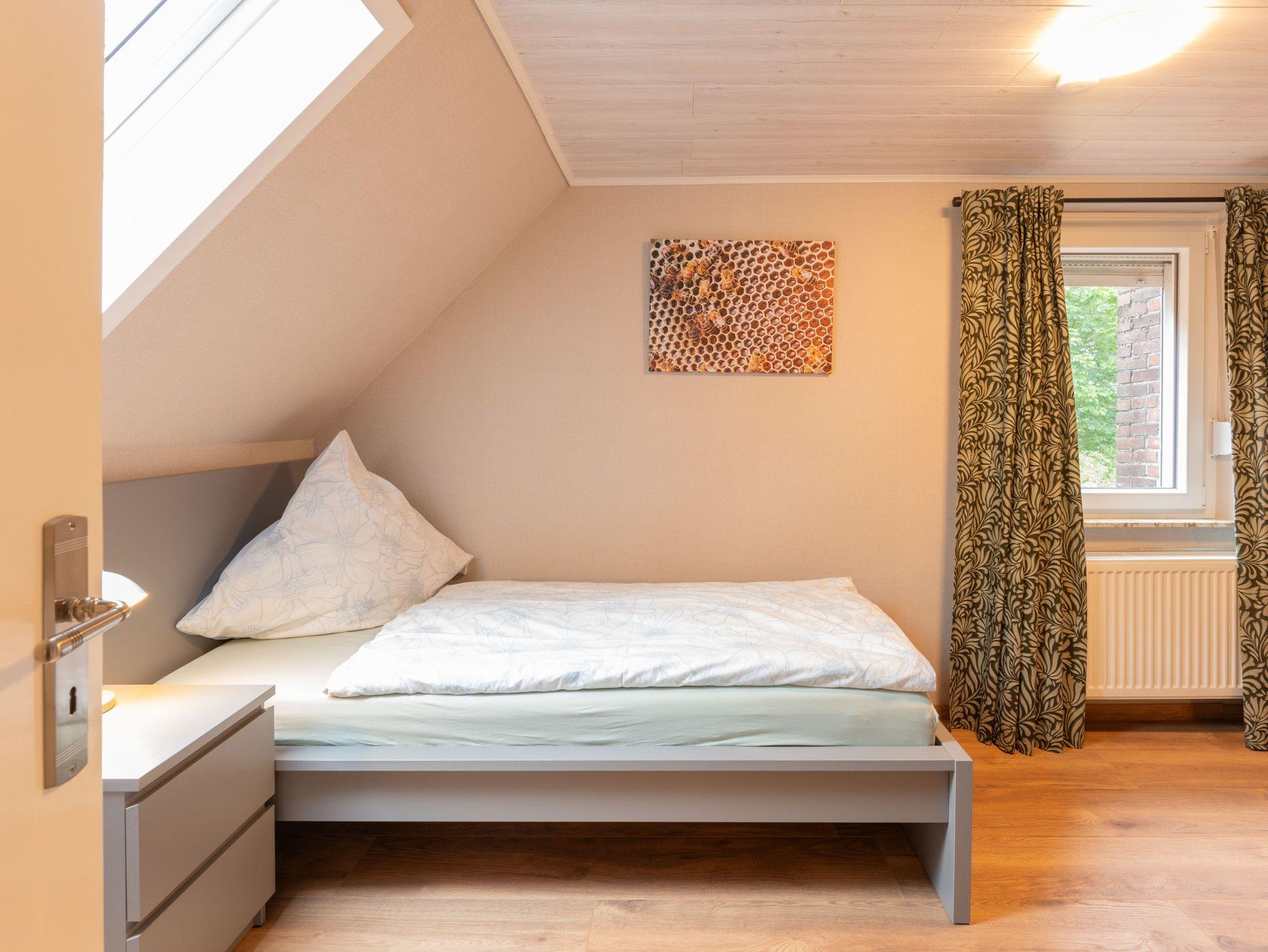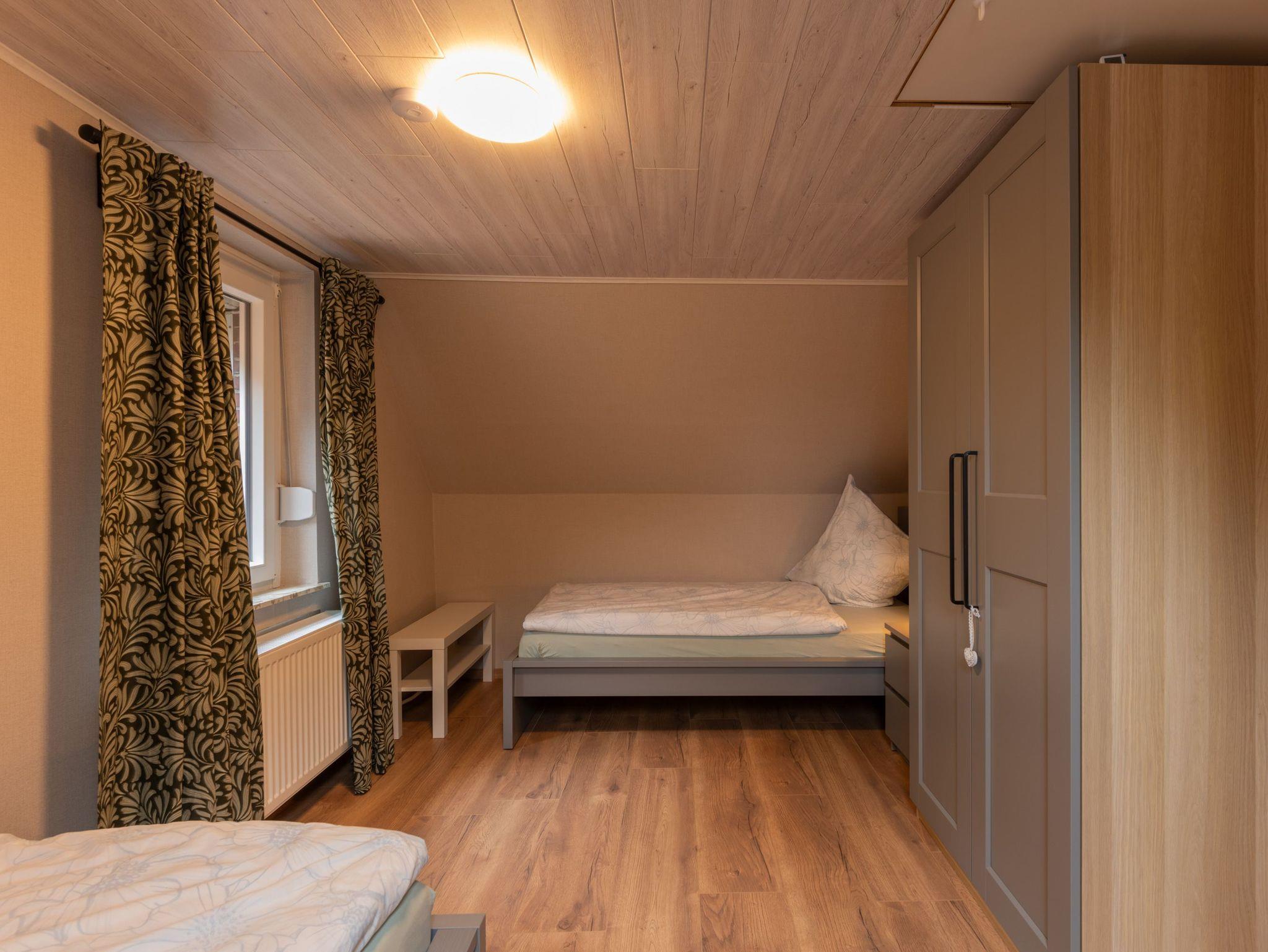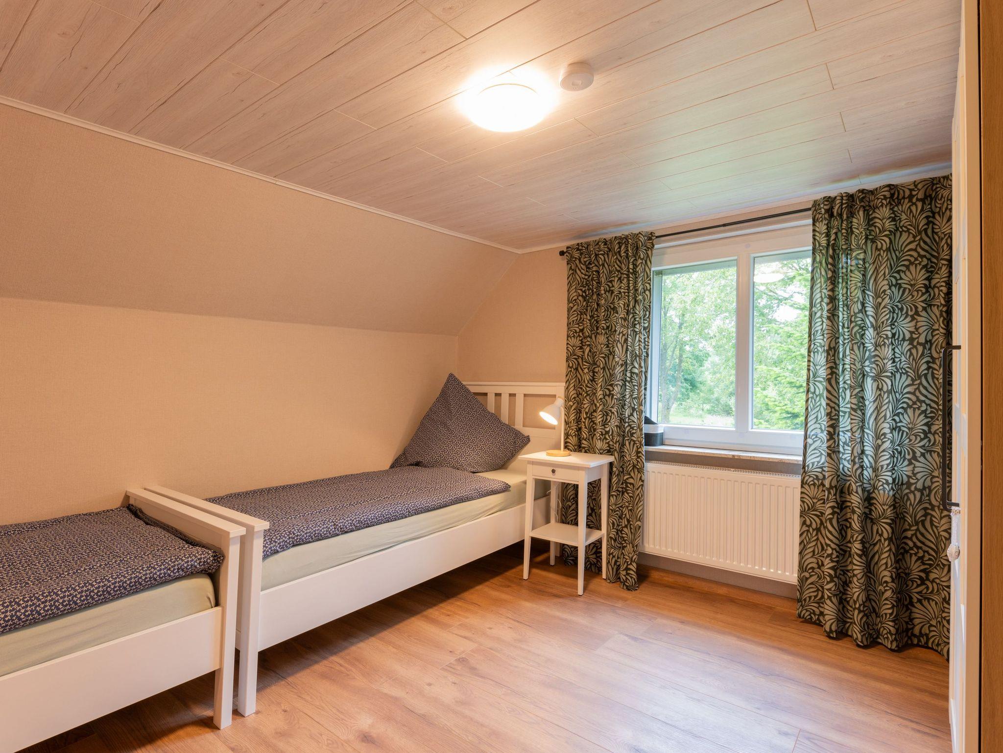 Ein Schlafzimmer mit einem Doppelbett (180x200) befindet sich im Erdgeschoss. Zwei weitere Schlafzimmer mit jeweils zwei Einzelbetten (90x200) im Obergeschoss.