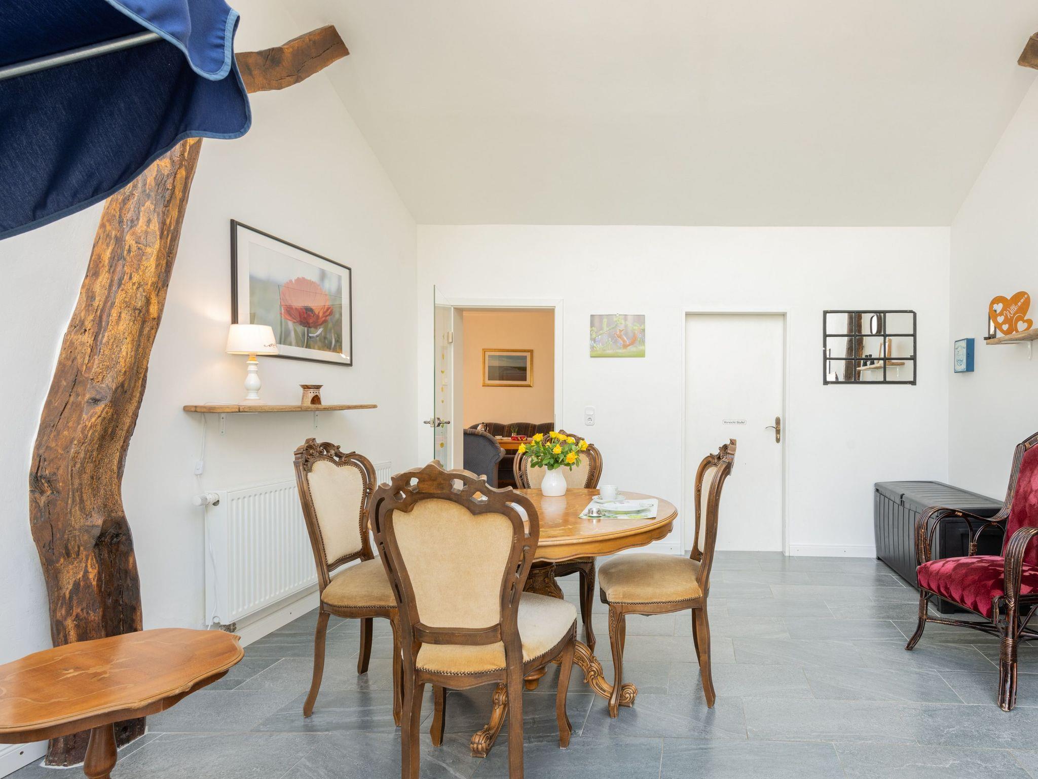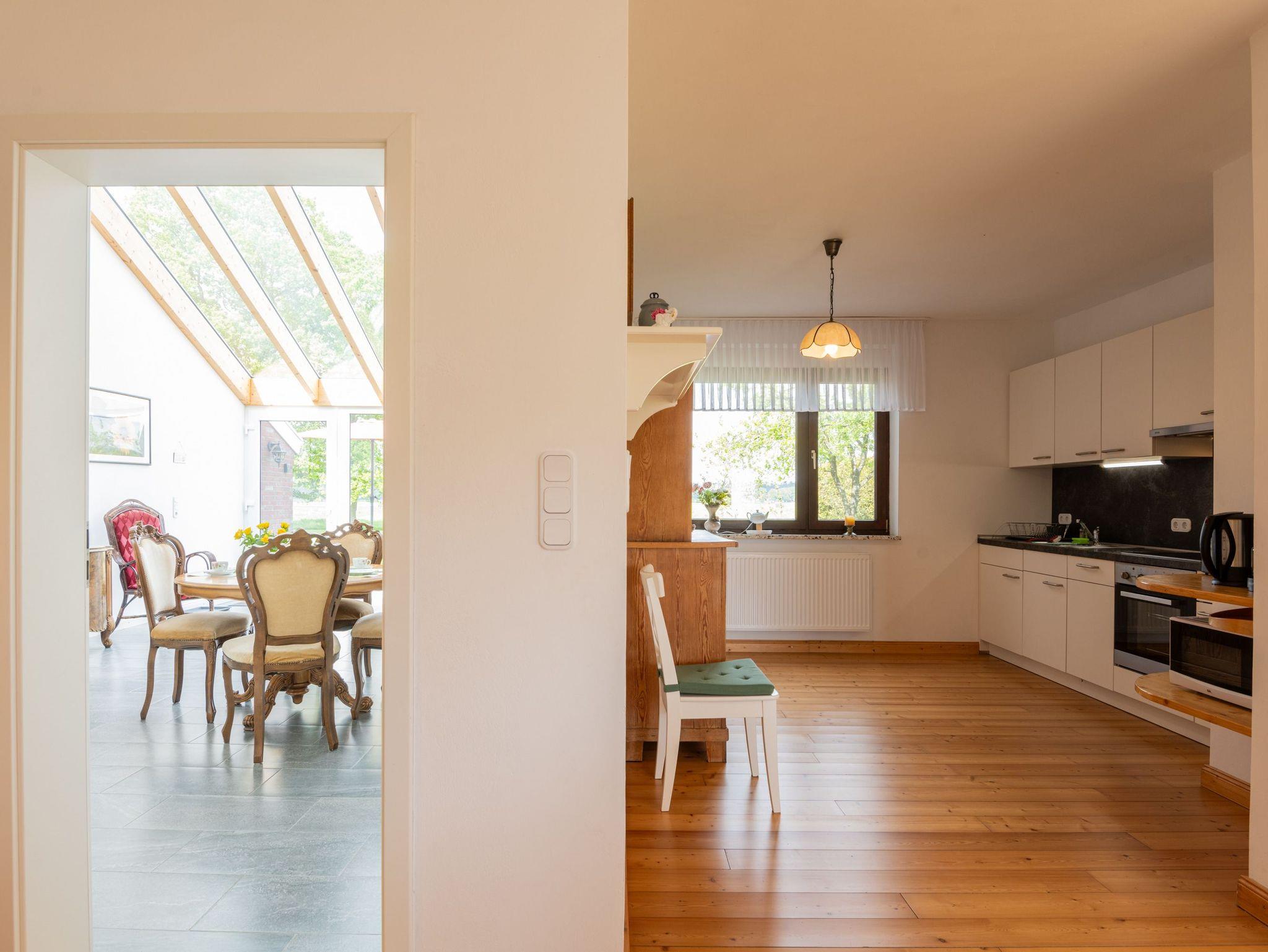 Zentral im Erdgeschoss befindet sich eine helle, gemütlich-moderne Wohnküche im Landhausstil. Der Wohnbereich ist ausgestattet mit einer gemütlichen Sitzgarnitur und einem Flachbildschirmfernseher. Der Küchenbereich ist mit einer Einbauküche und diversen Zusatzgeräten komplett ausgestattet. Ein kleiner Gefrierschrank steht im Abstellraum.