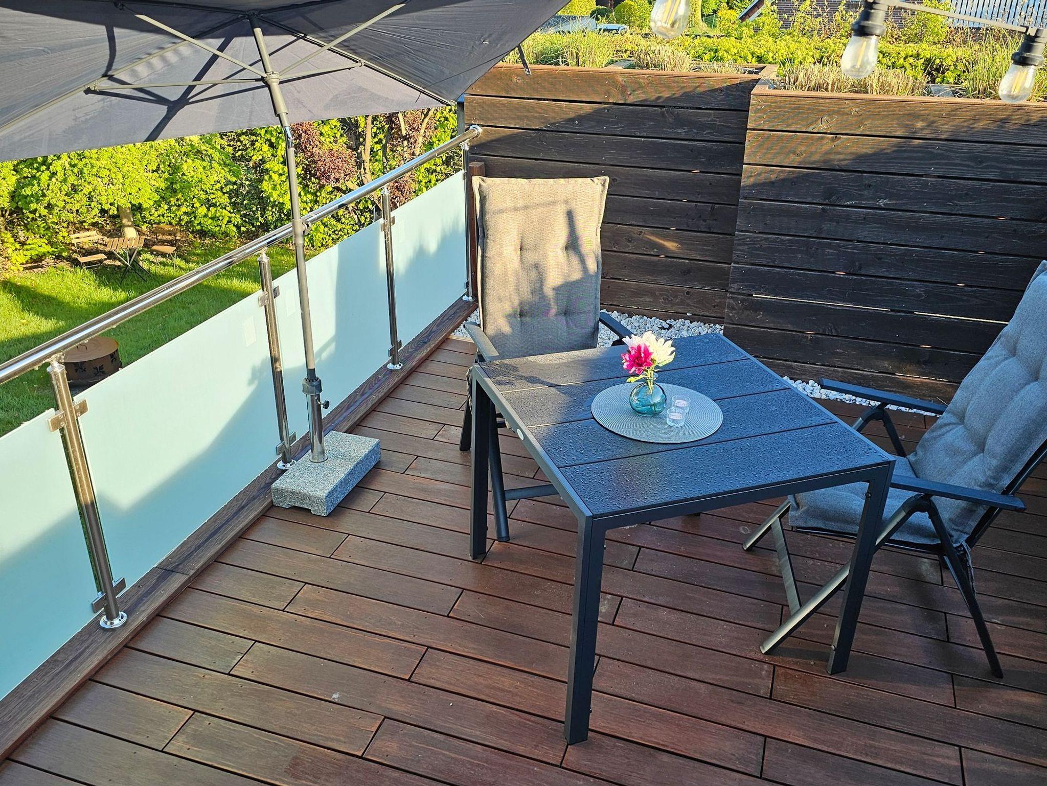 Die Ferienwohnung hat einen eigenen Haupteingang. Der Wohnbereich ist ausgestattet mit einer gemütlichen Sitzgarnitur und einem 55 Zoll Flachbildschirmfernseher. Durch die Außentür gelangt man direkt auf eine Dachterrasse. Hier lässt sich die gute ostfriesische Luft genießen oder morgens z.B. gemütlich frühstücken. Eine Grillmöglichkeit (WMF-Elektro-Grill) ist dort ebenfalls vorhanden.
