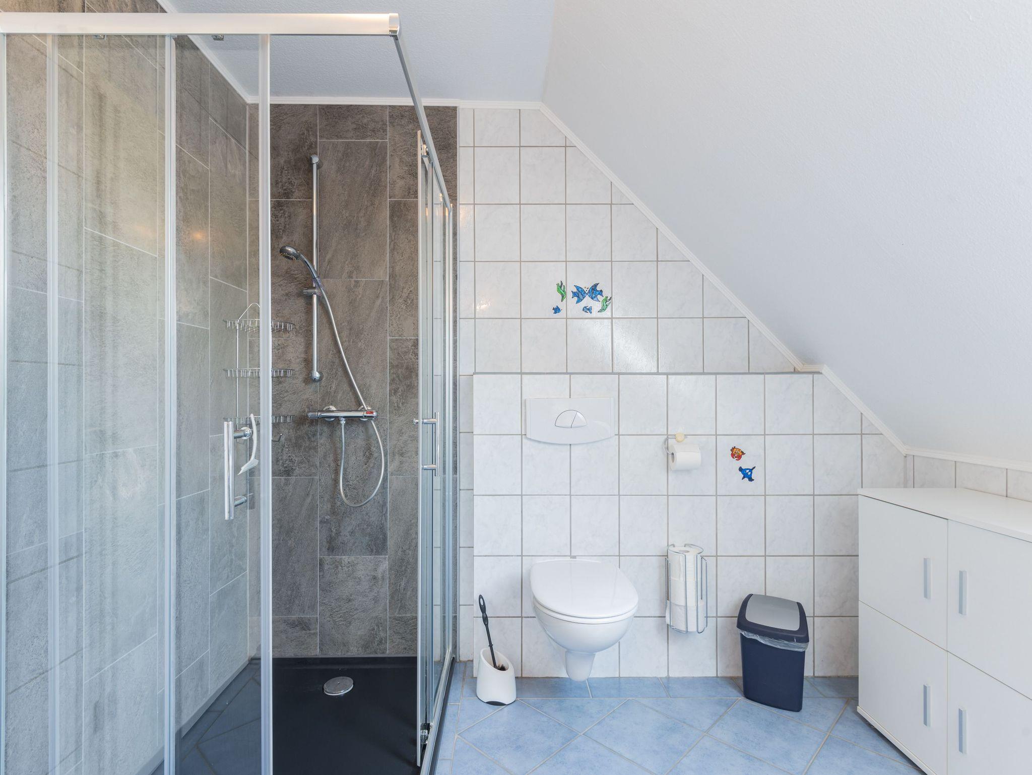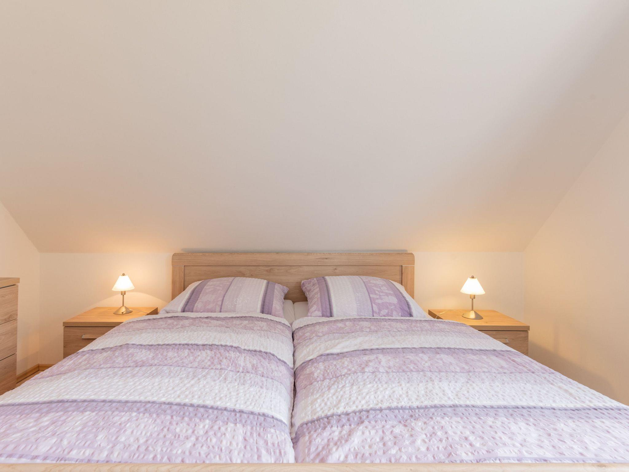 Es gibt zwei Schlafzimmer, eins verfügt über ein Doppelbett 2,00 m x 2,00 m und in dem zweiten Schlafzimmer steht ein Doppelbett (1,80 m x 2,00 m) und ein Schlafsofa (1,40 m x 2,00 m). Im großen Badezimmer stehen Ihnen eine Dusche mit einem ca. 4 cm hohem Einstieg, ein Waschtisch mit ausreichend Schränke, eine Toilette, eine Waschmaschine, Wäschetrockner (gegen einen kleinen Aufpreis von 3€) und ein Haartrockner zur Verfügung. Im Garten befindet sich für die Gäste ein Blockhaus, die hier gemütliche Stunden verbringen können. Für Ihre mitgebrachten Fahrräder steht Ihnen eine abschließbarer Raum und eine Carport zur Verfügung.