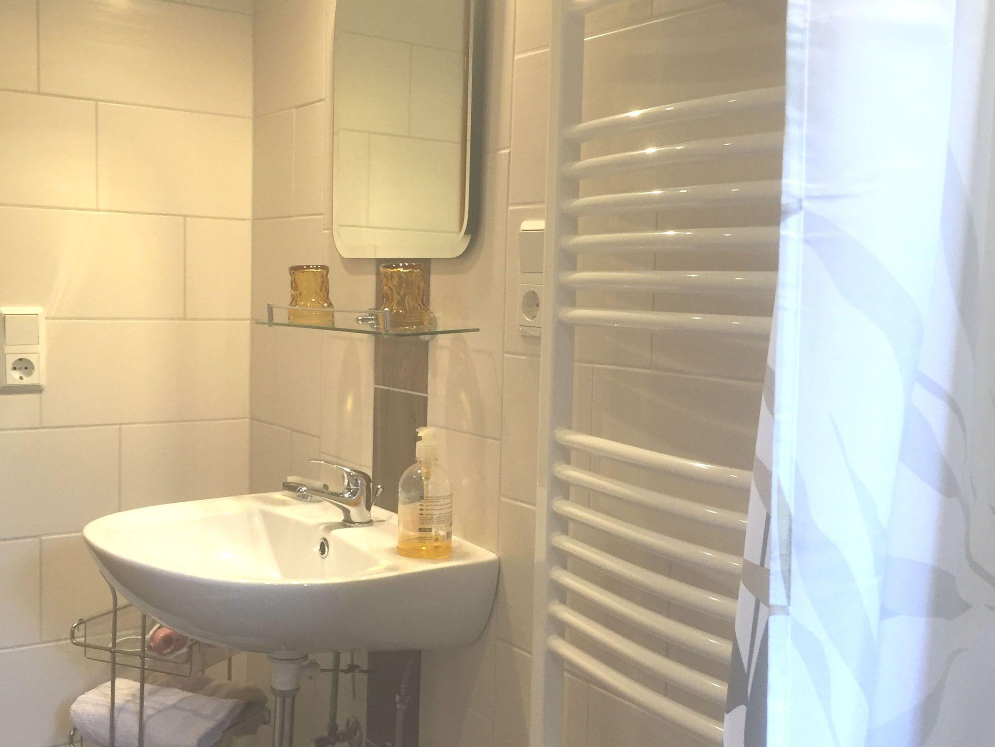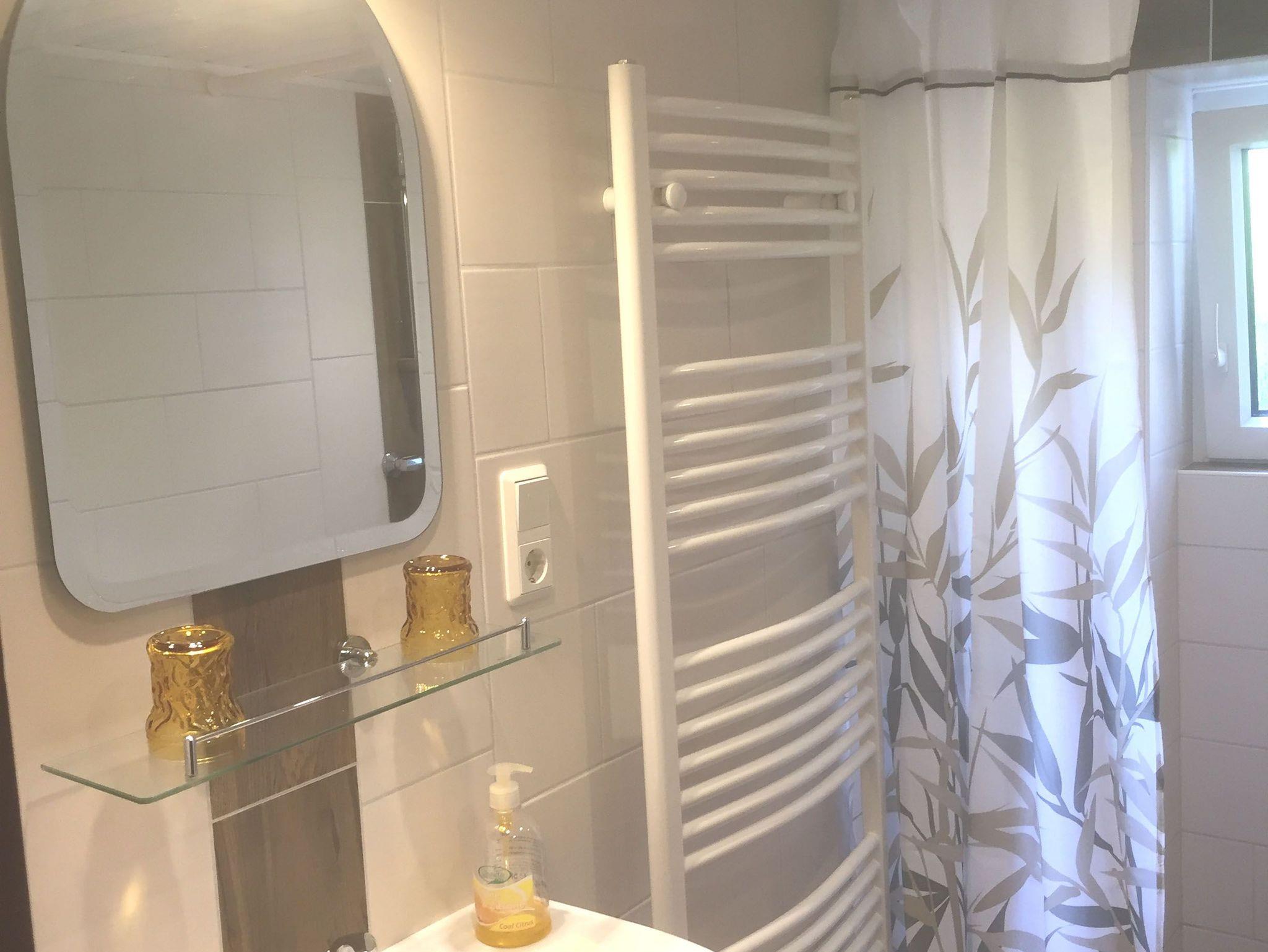 Das neu renovierte Badezimmer hat eine ebenerdige Dusche. Es ist eine separate Toilette vorhanden.