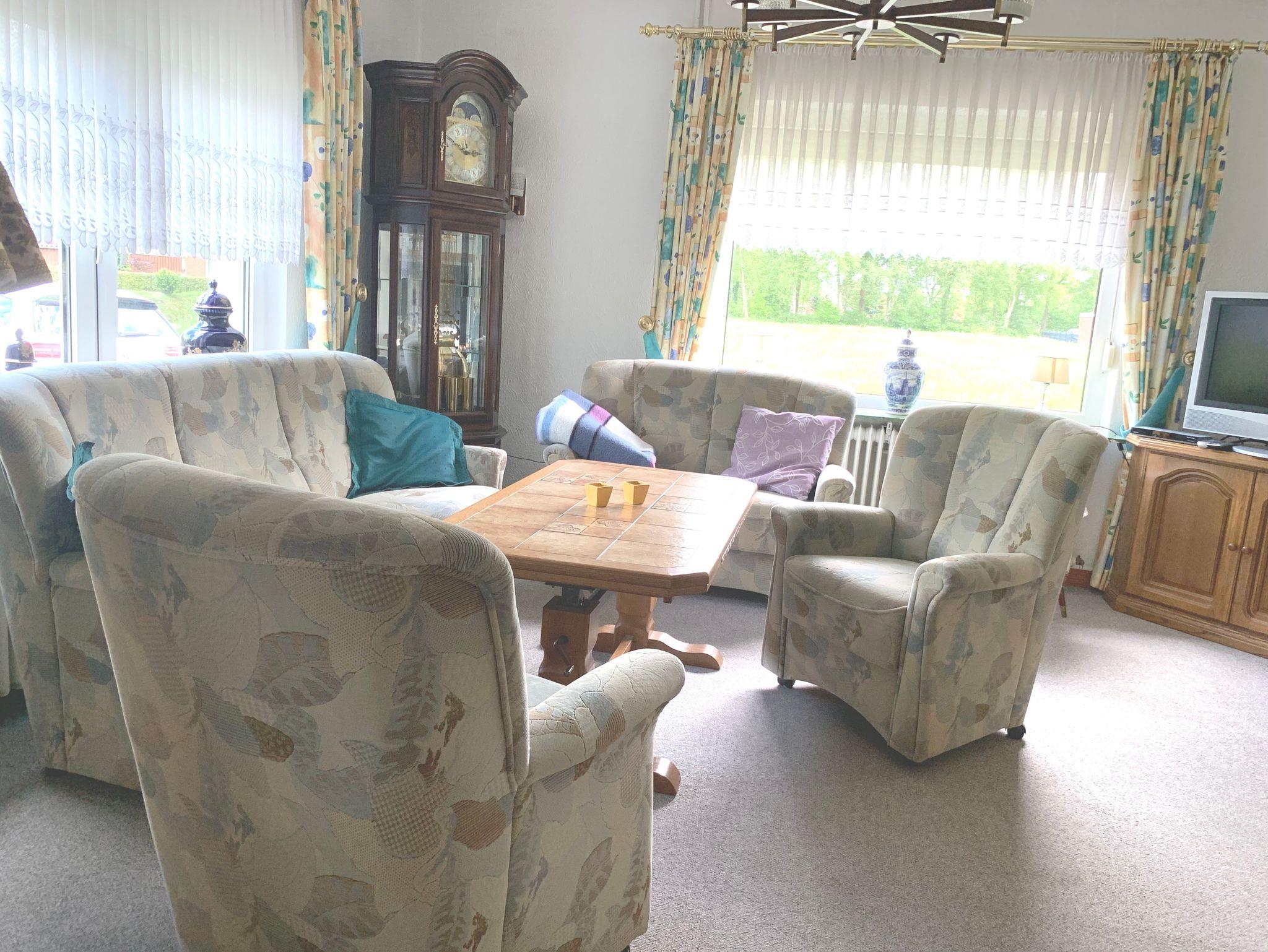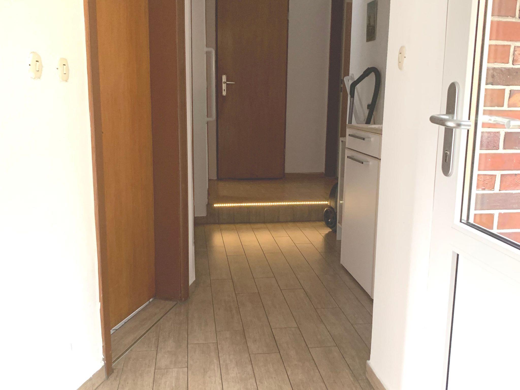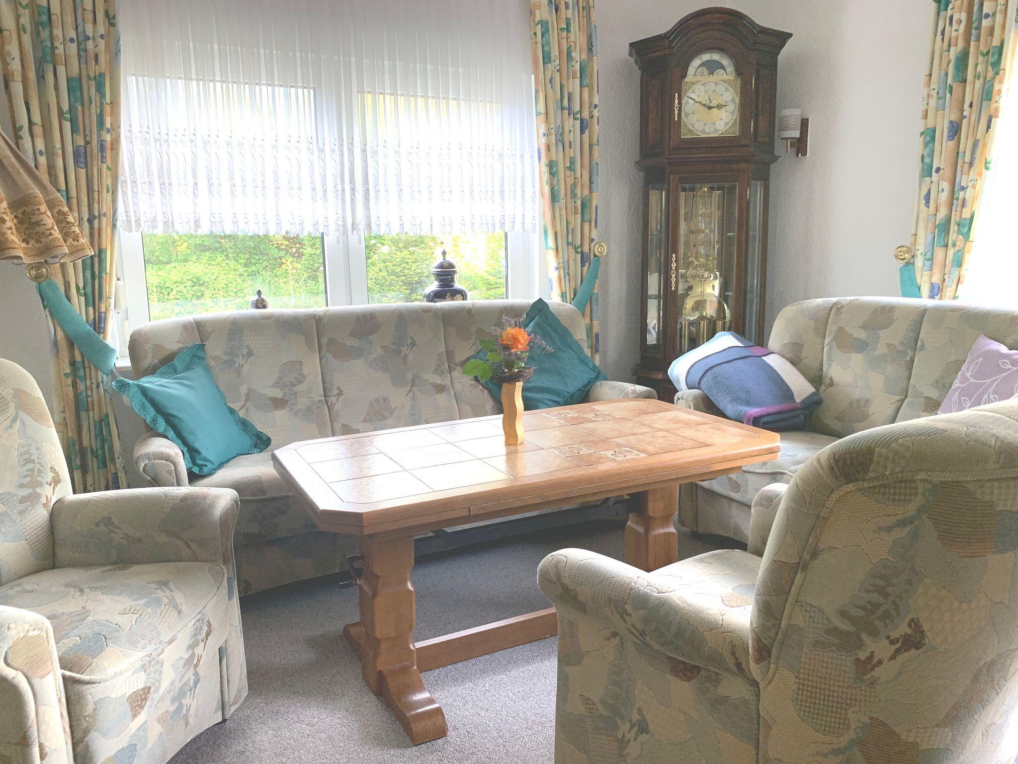 Die Erdgeschosswohnung besteht aus zwei Doppelzimmern, einer geräumigen Wohnküche und einem Wohnzimmer. In jedem Schlafzimmer befinden sich Kleiderschränke. In einem Zimmer ist ein Doppelbett und in dem anderen Zimmer sind zwei Einzelbetten vorhanden. Diese können auch getrennt gestellt werden. Ebenfalls kann auf Wunsch ein Gästebett oder ein Kinderbett aufgebaut werden. Eine Kopfkissenauswahl steht zur Verfügung. Die Wohnküche ist ausgestattet mit Backofen, Ceranfeld, Kühlschrank, Mikrowelle und Spülmaschine. Auch nahezu alle Küchengeräte sind vorhanden. (Kaffeemaschine, Toaster, Wasserkocher, Senseo, Eierkocher). Auf dem Sofa und den 4 Stühlen ist Platz für die ganze Familie. Am Flachbild-TV mit SAT.-Empfang jeweils in der Küche und im Wohnzimmer kann auch mal ein getrenntes Programm geschaut werden. Im Wohnzimmer lädt eine gemütliche Polstergarnitur zum Entspannen ein.
