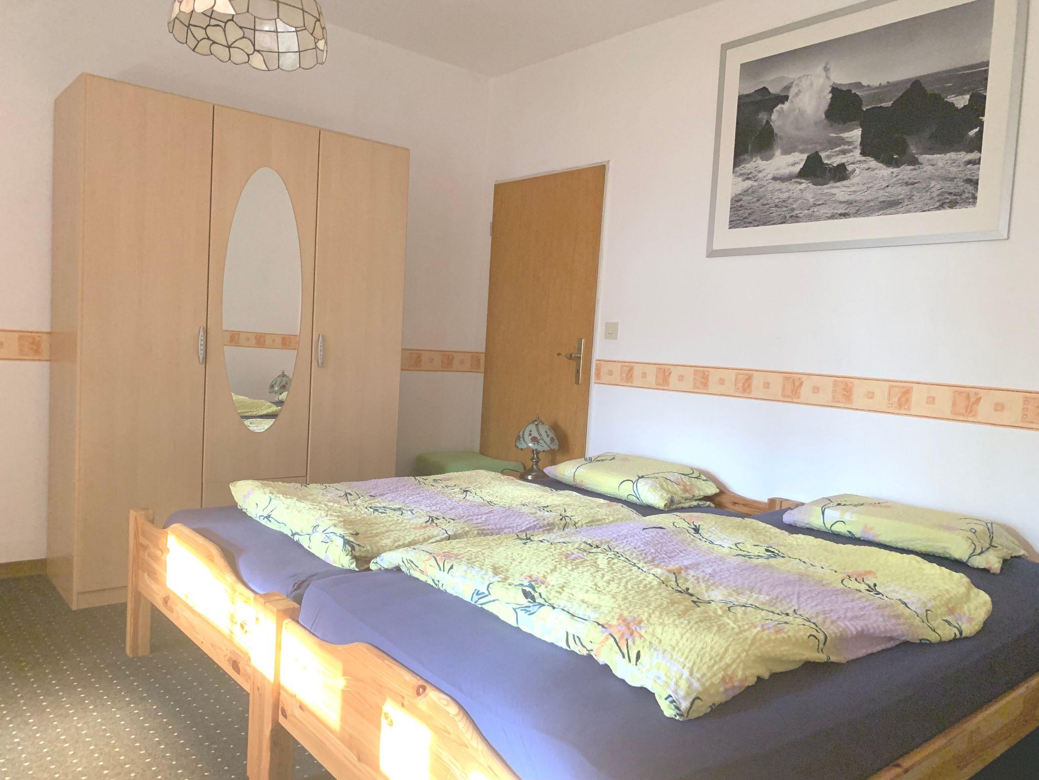 In jedem Schlafzimmer befinden sich Kleiderschränke. In einem Zimmer ist ein Doppelbett (1,80 x 2,00 m) und in dem anderen Zimmer sind zwei Einzelbetten (0,90 x 2,00 m) vorhanden. Diese können auch getrennt gestellt werden. Ebenfalls kann auf Wunsch ein Gästebett oder ein Kinderbett aufgebaut werden.