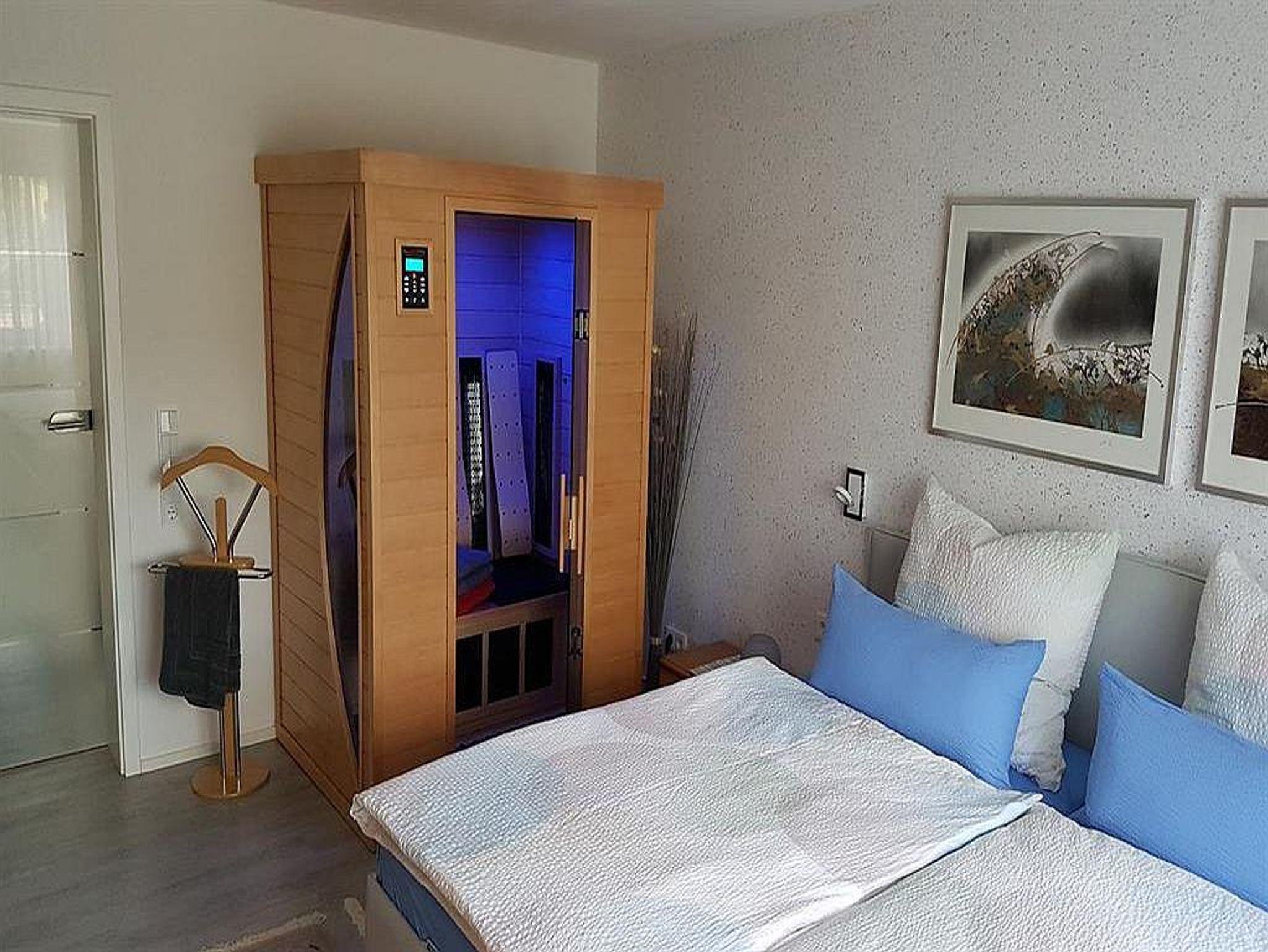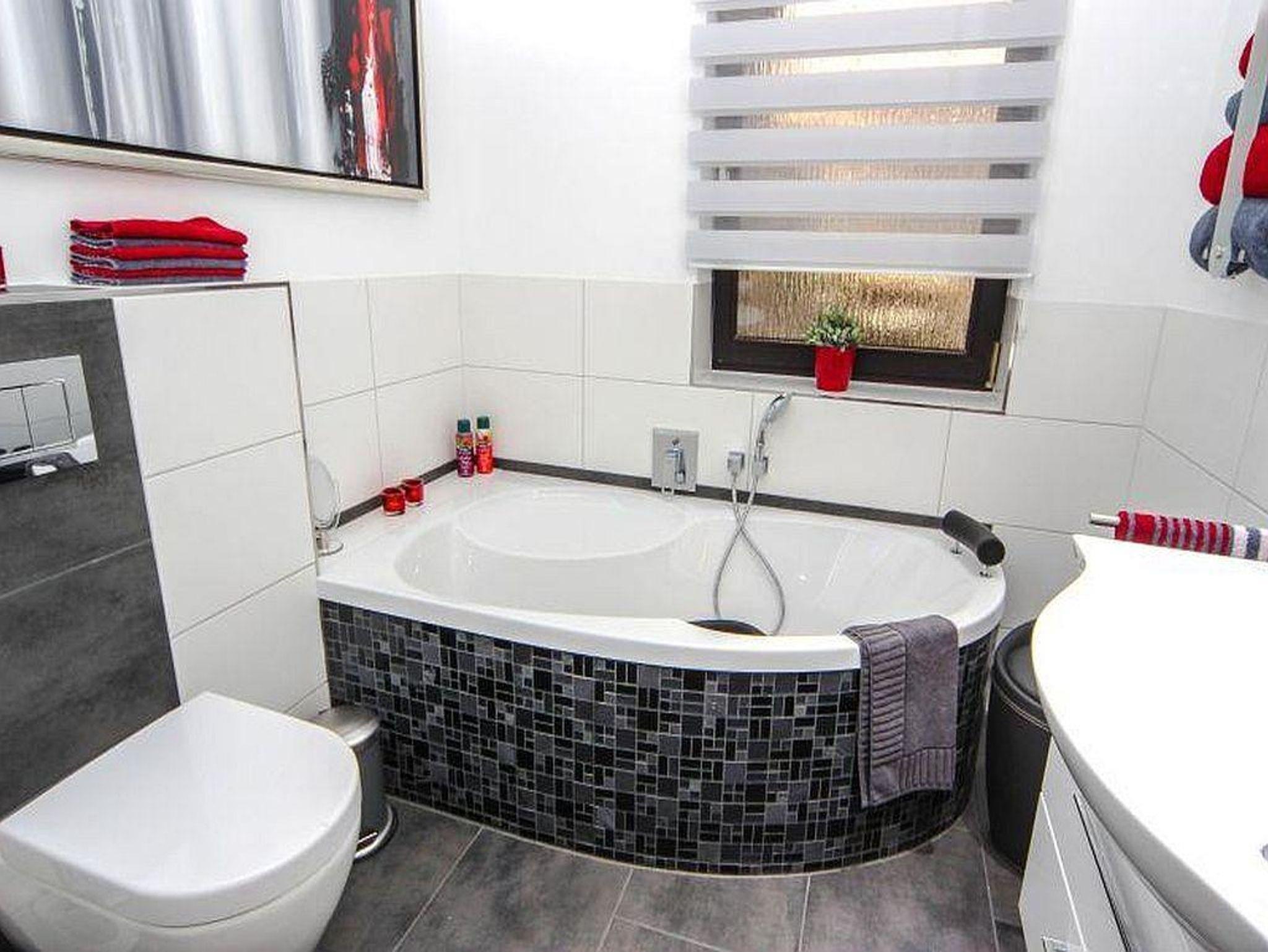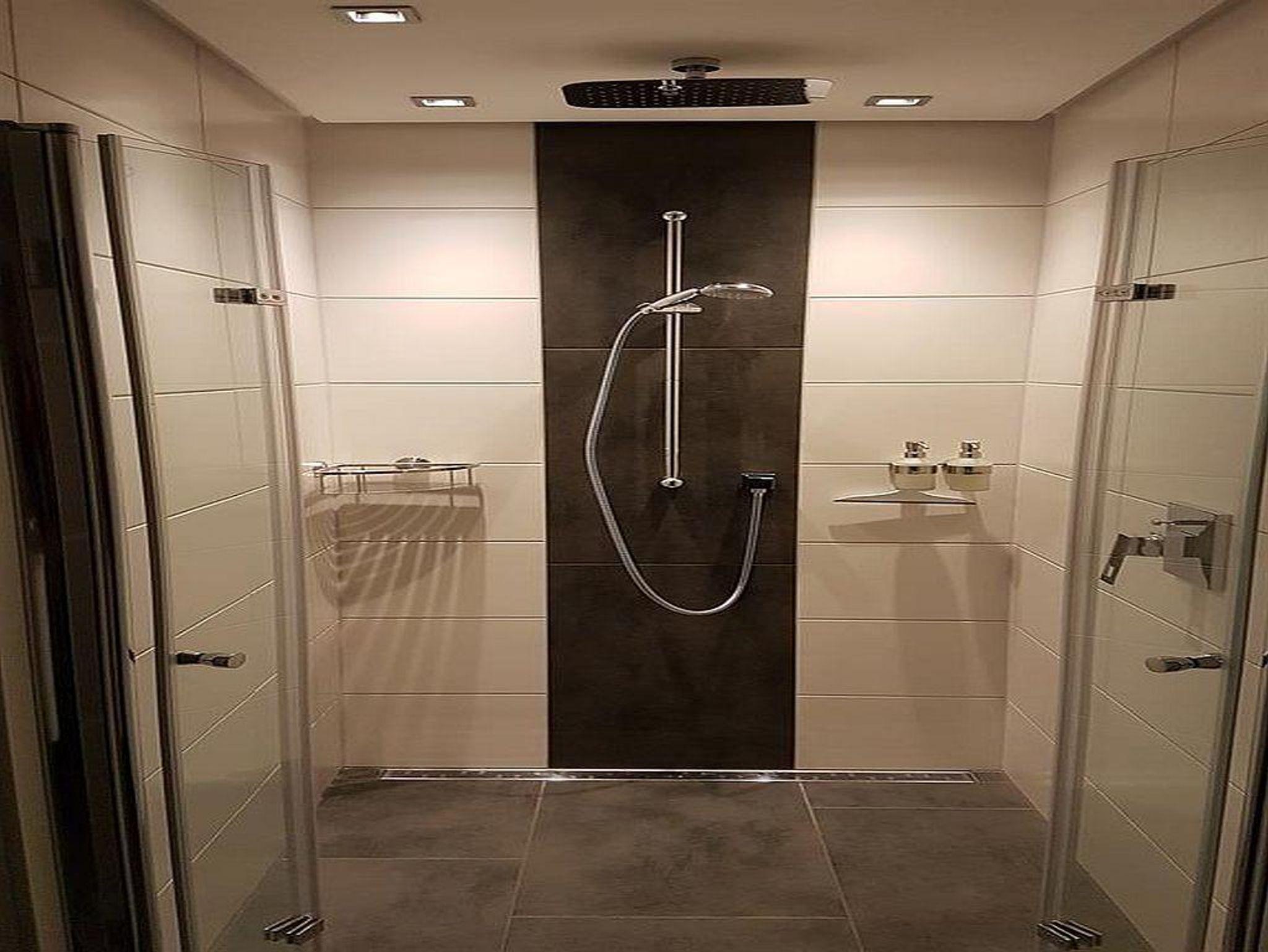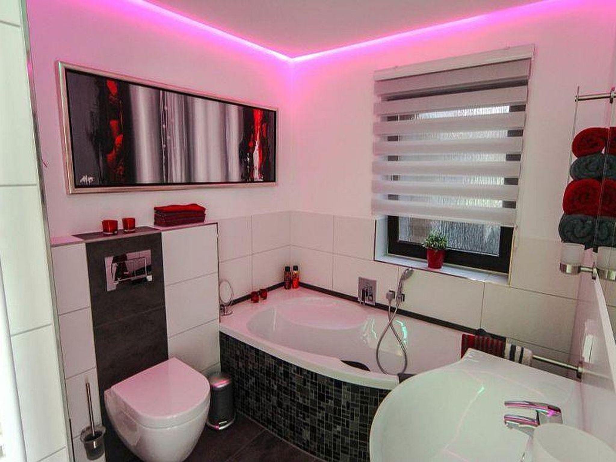 Das schicke Bad lässt keine Wünsche offen - bodengleiche Dusche mit Regenschauer, Badewanne mit Nackenstütze, großes Waschbecken mit Spiegel- und Unterschrank, farbige LED-Beleuchtung, Fön, Hocker, Kosmetikspiegel und Pflegeprodukte. Entspannen Sie in der Zweipersonen-Infrarot-Tiefenwärmekabine und tanken Sie bei einem wohltuenden Bad mit Kerzenschein Ihre Seele auf.