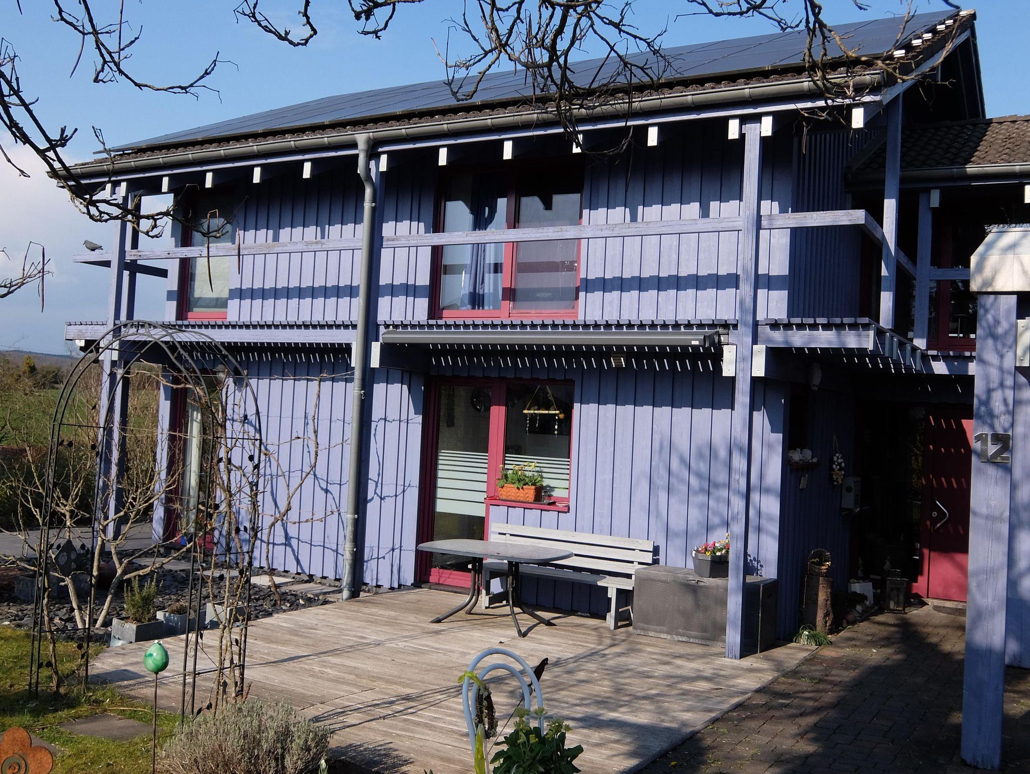 Unser Holzhaus bietet, bedingt durch hohe Räume und atmende Baumaterialien, ein angenehmes Wohnklima. Große Fensterflächen erlauben einen Blick in die umgebende Natur. Unsere Photovoltaikanlage ermöglicht uns, selbst produzierten Strom zu nutzen. Ein bepflanztes Flachdach und eine Zisterne speichern Regenwasser. Dank einer am Haus installierten Wallbox lässt sich ihr Elektrofahrzeug schnell aufladen. Auf dem Grundstück steht ein kostenloser Parkplatz zur Verfügung, Fahrräder können in einem abgeschlossenen Raum untergestellt werden. Unser großes, naturnah angelegtes Grundstück bietet Lebensraum für die heimische Tier– und Pflanzenwelt.