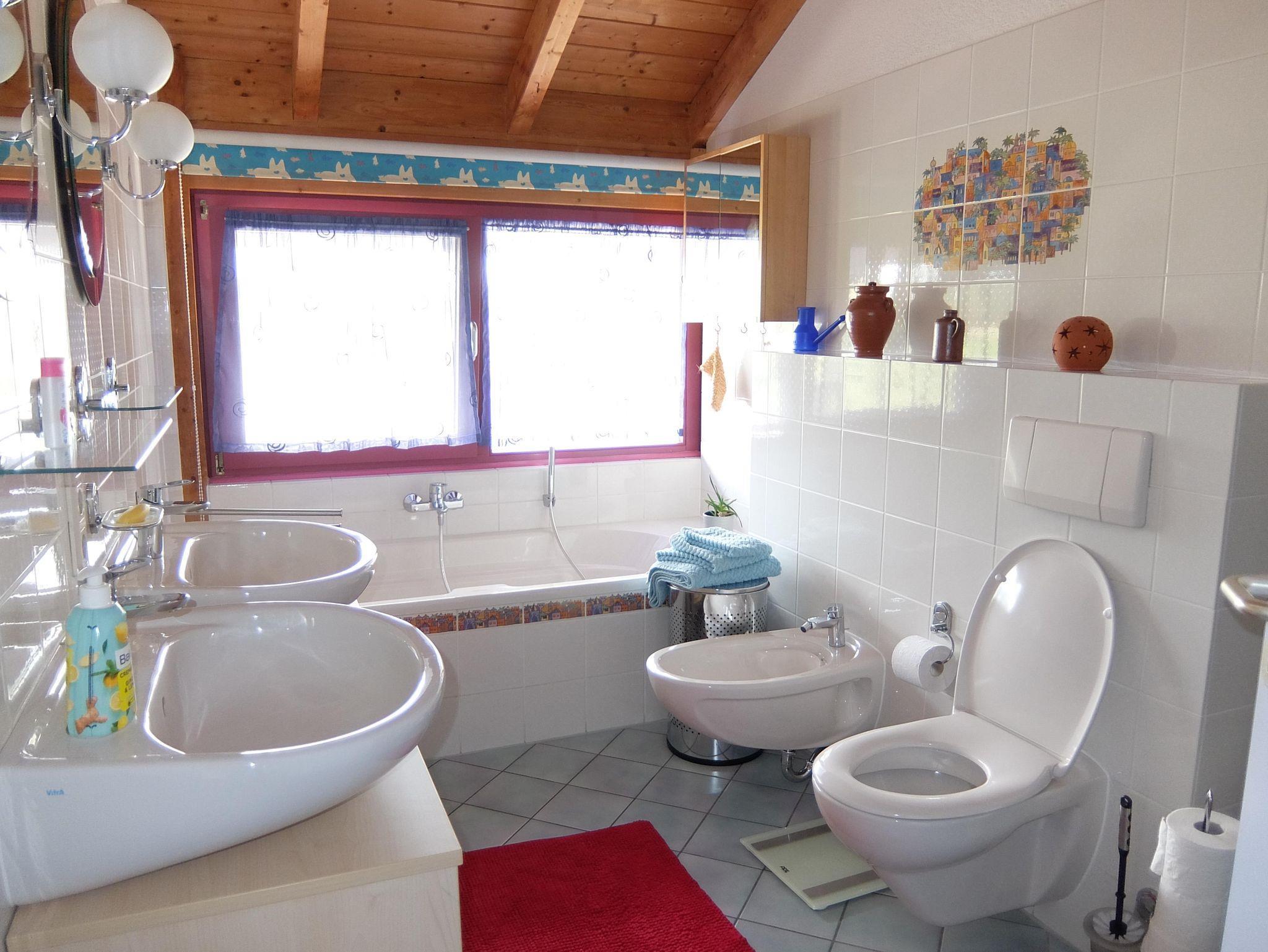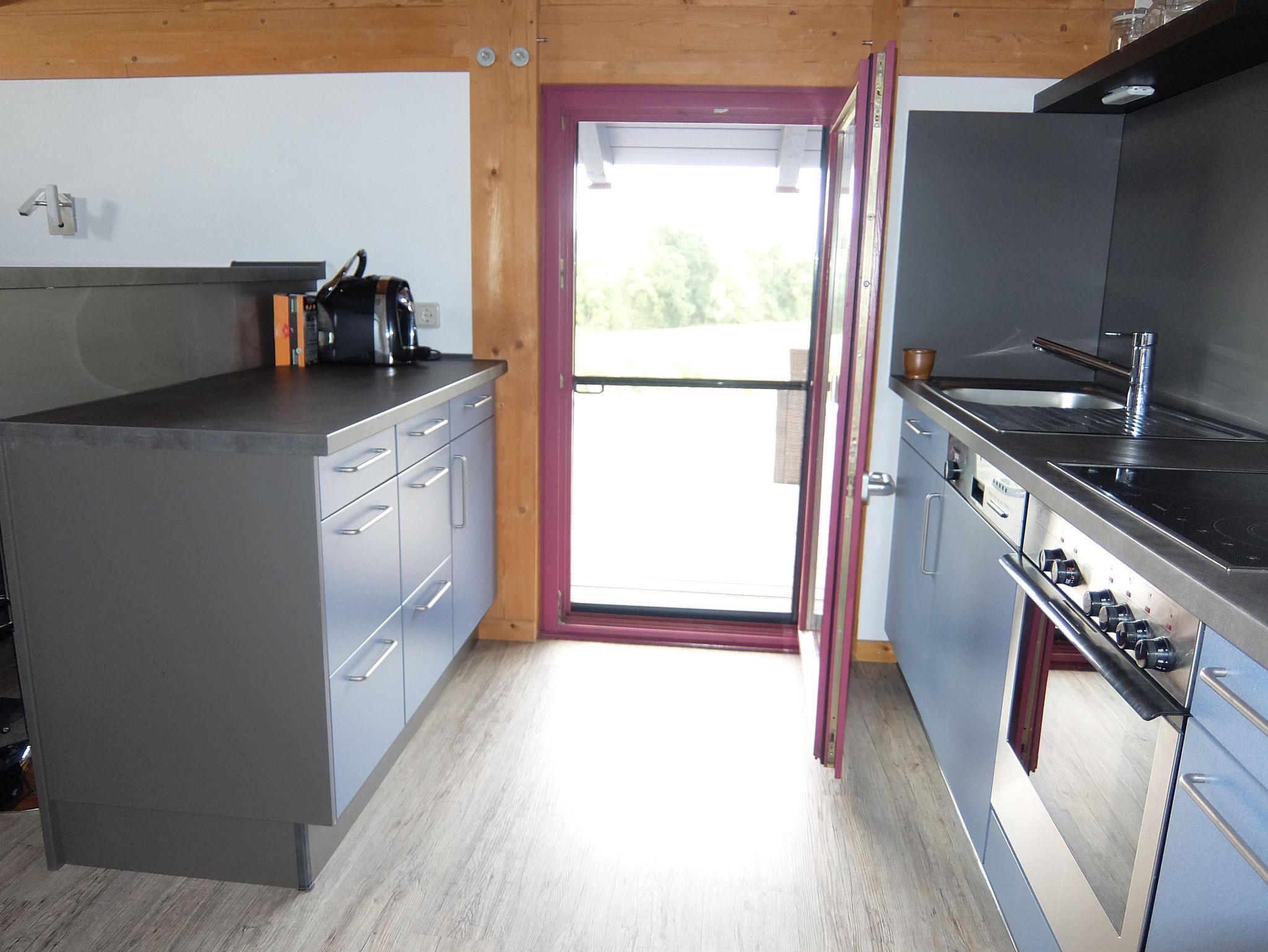 Unsere Ferienwohnung mit einer Gesamtfläche von 60 qm liegt im 1. Stock unseres Holzhauses und ist leider nur über eine Treppe, also nicht barrierefrei zu erreichen. Sie gliedert sich in Flur, Schlafzimmer, Wohnküche mit Spülmaschine, Panoramazimmer und Bad.