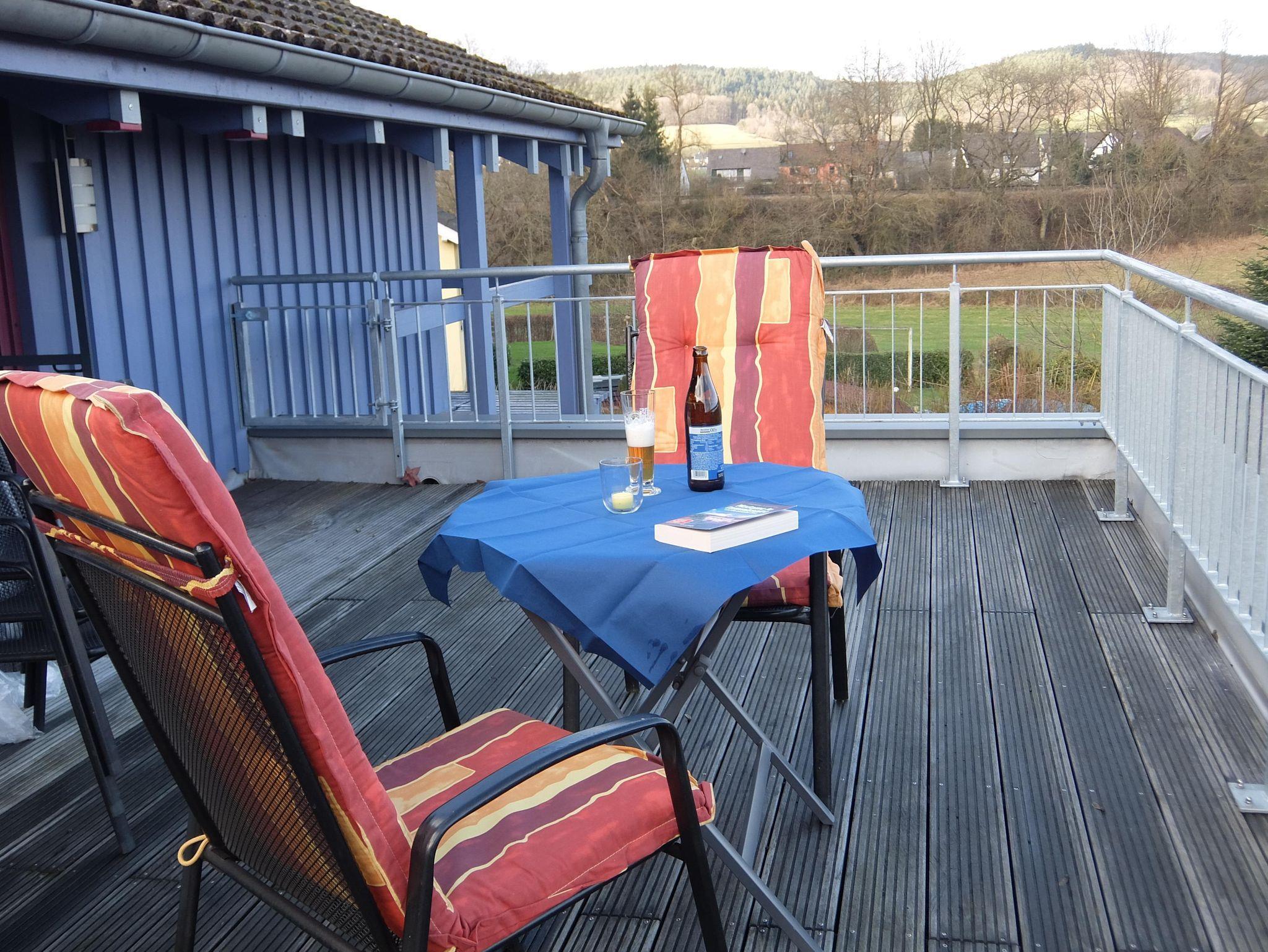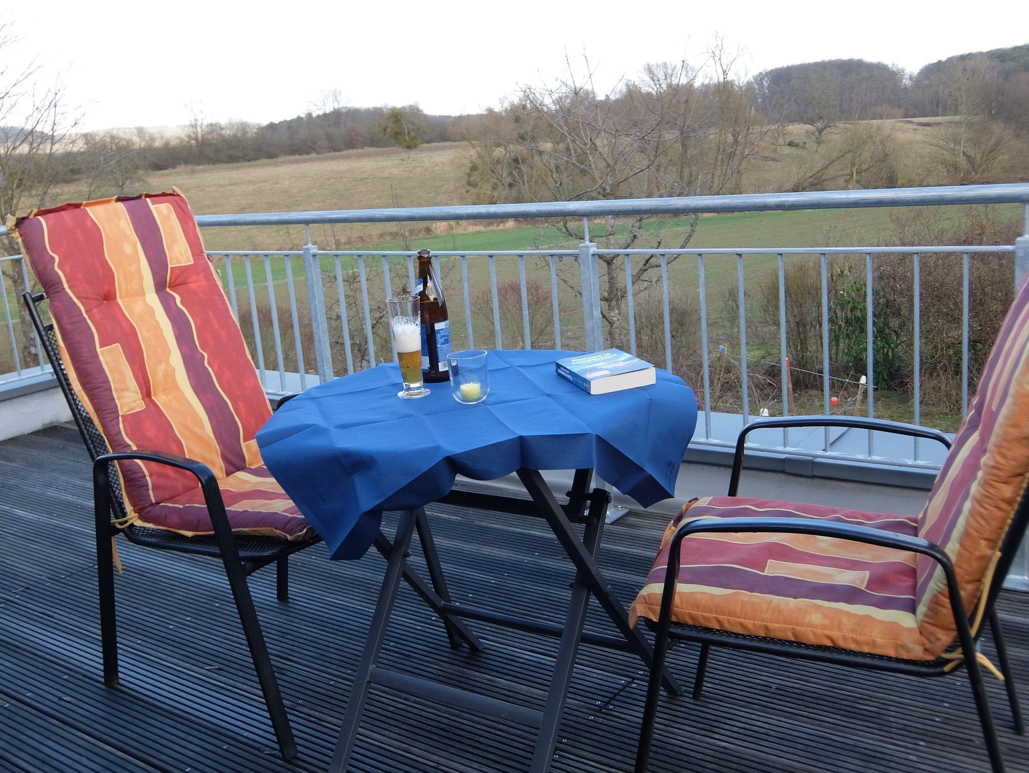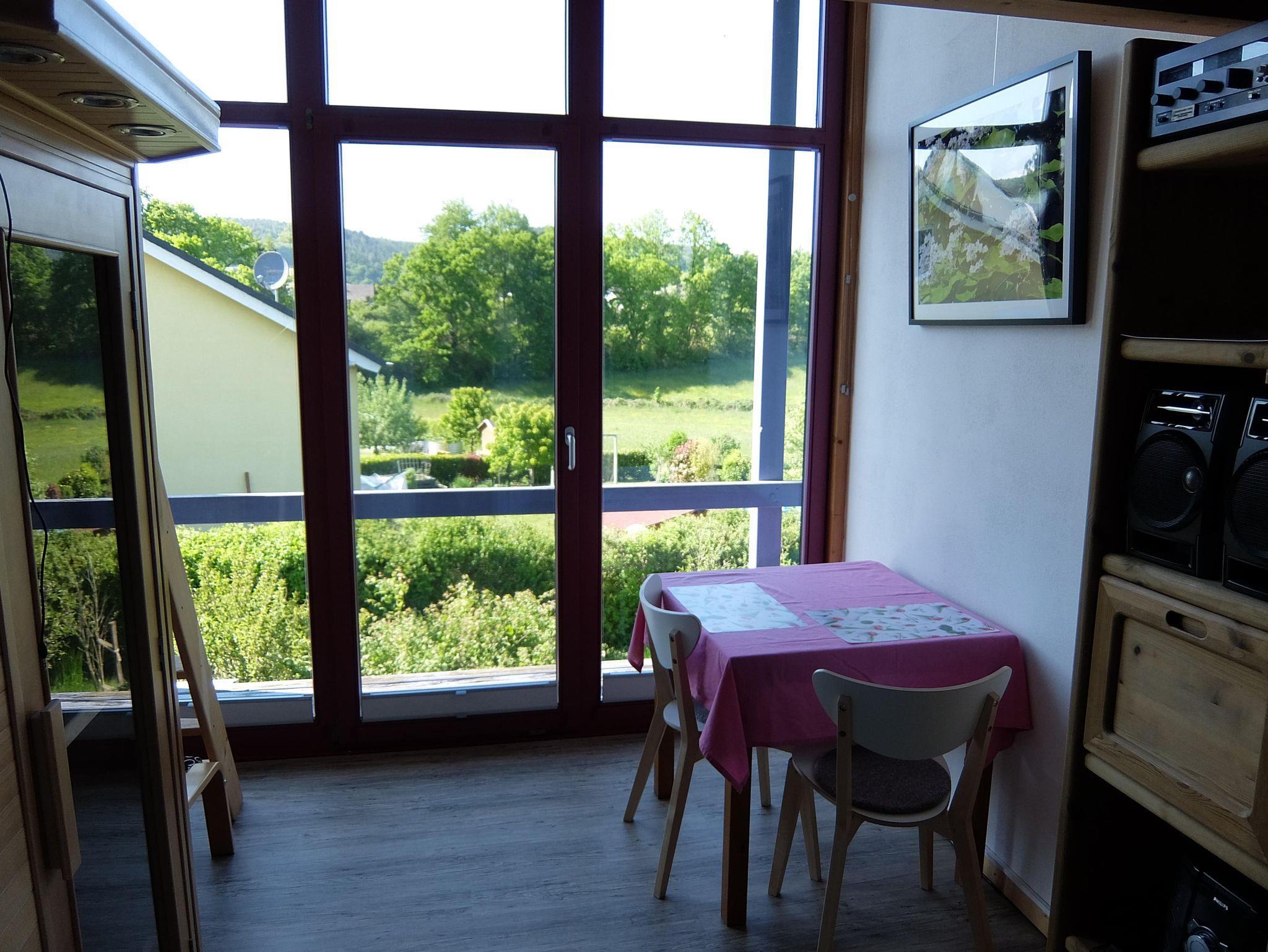 Unsere FeWo mit einer Gesamtfläche von 60 qm liegt im 1. Stock unseres Holzhauses und ist leider nur über eine Treppe, also nicht barrierefrei zu erreichen. Sie gliedert sich in Flur, Schlafzimmer, Wohnküche mit Spülmaschine, Panoramazimmer und Bad. Die Infrarot-Wärme-Kabine kann gegen Gebühr genutzt werden. Von der Wohnküche aus erreicht man einen großen Balkon, auf dem Outdoor-Möbel zur Verfügung stehen. Die FeWo ist für 2 Personen ausgelegt, allerdings kann das Sofa in der Wohnküche umgebaut und als Schlafgelegenheit für max. 2 Personen genutzt werden.