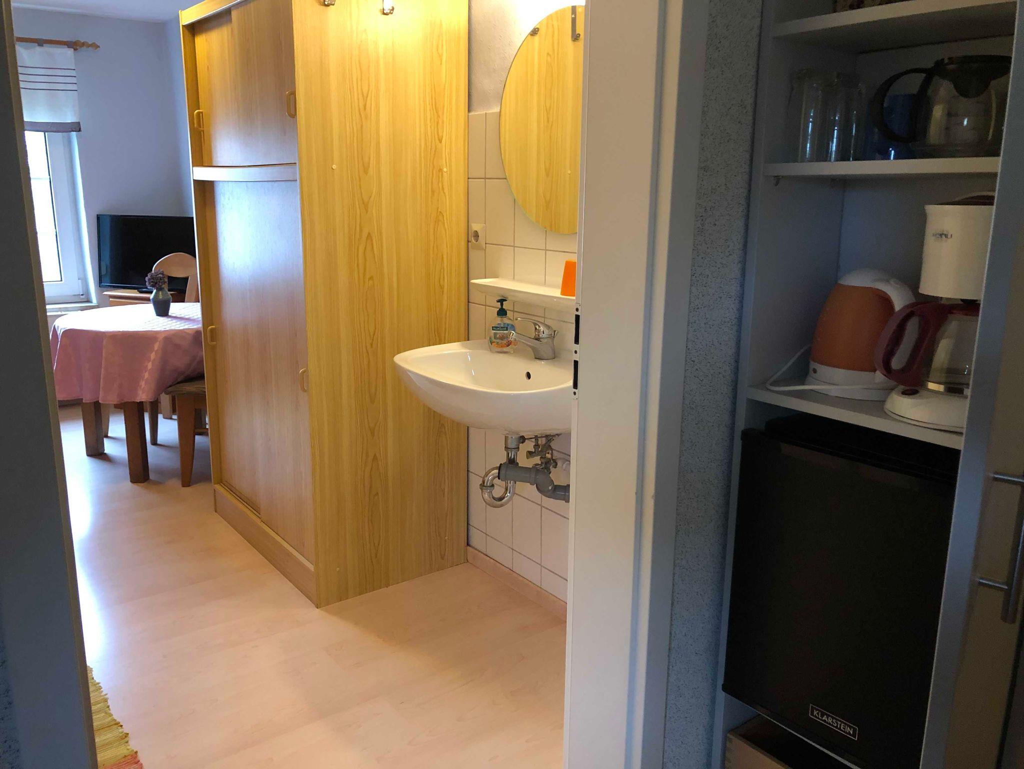 Ausgestattet ist das Doppelzimmer mit Radio, Fernseher, einer Gemeinschaftsküche mit Kaffeemaschine, Toaster und allen Küchenutensilien, sowie Backofen und Mikrowelle.
