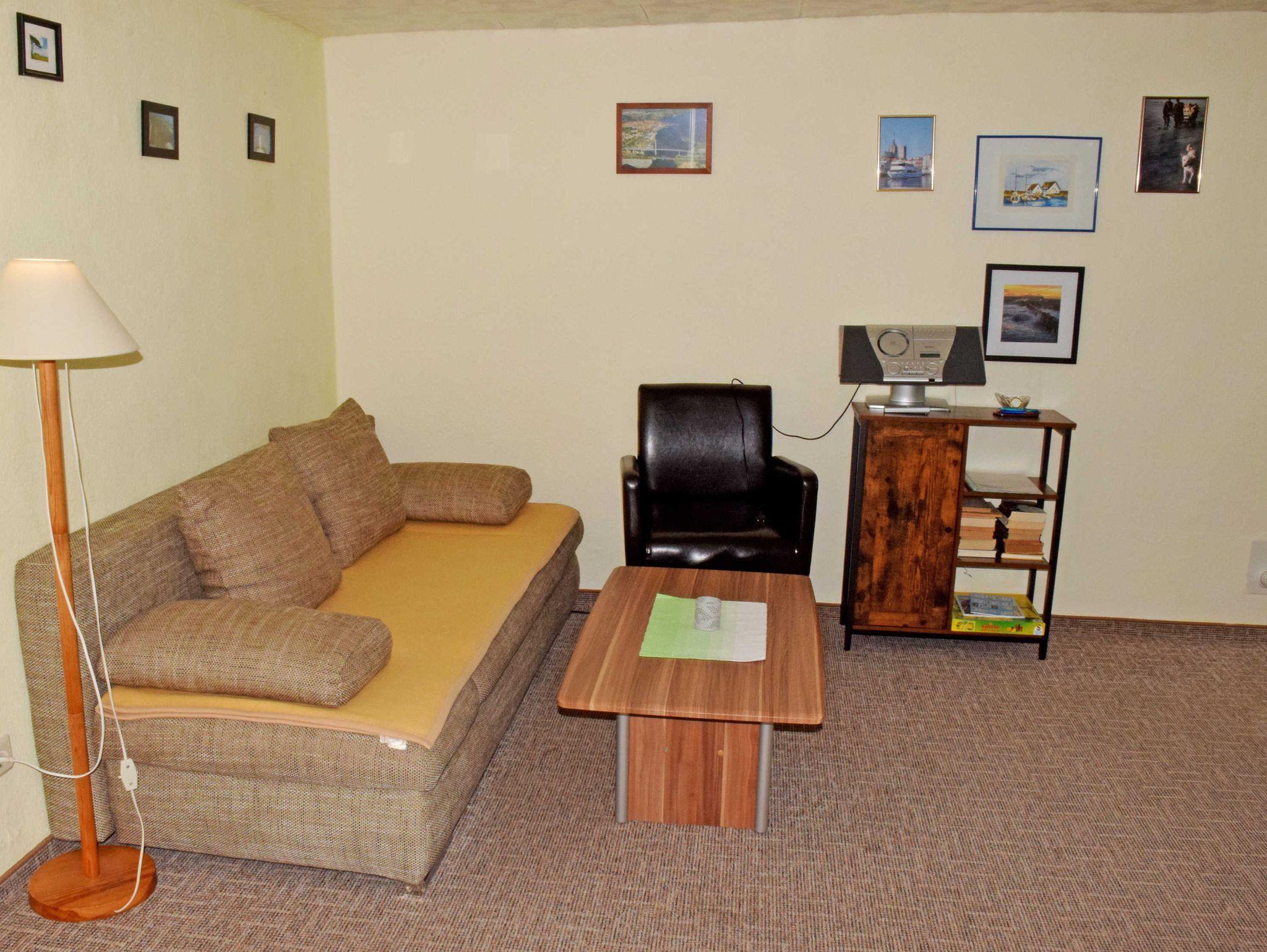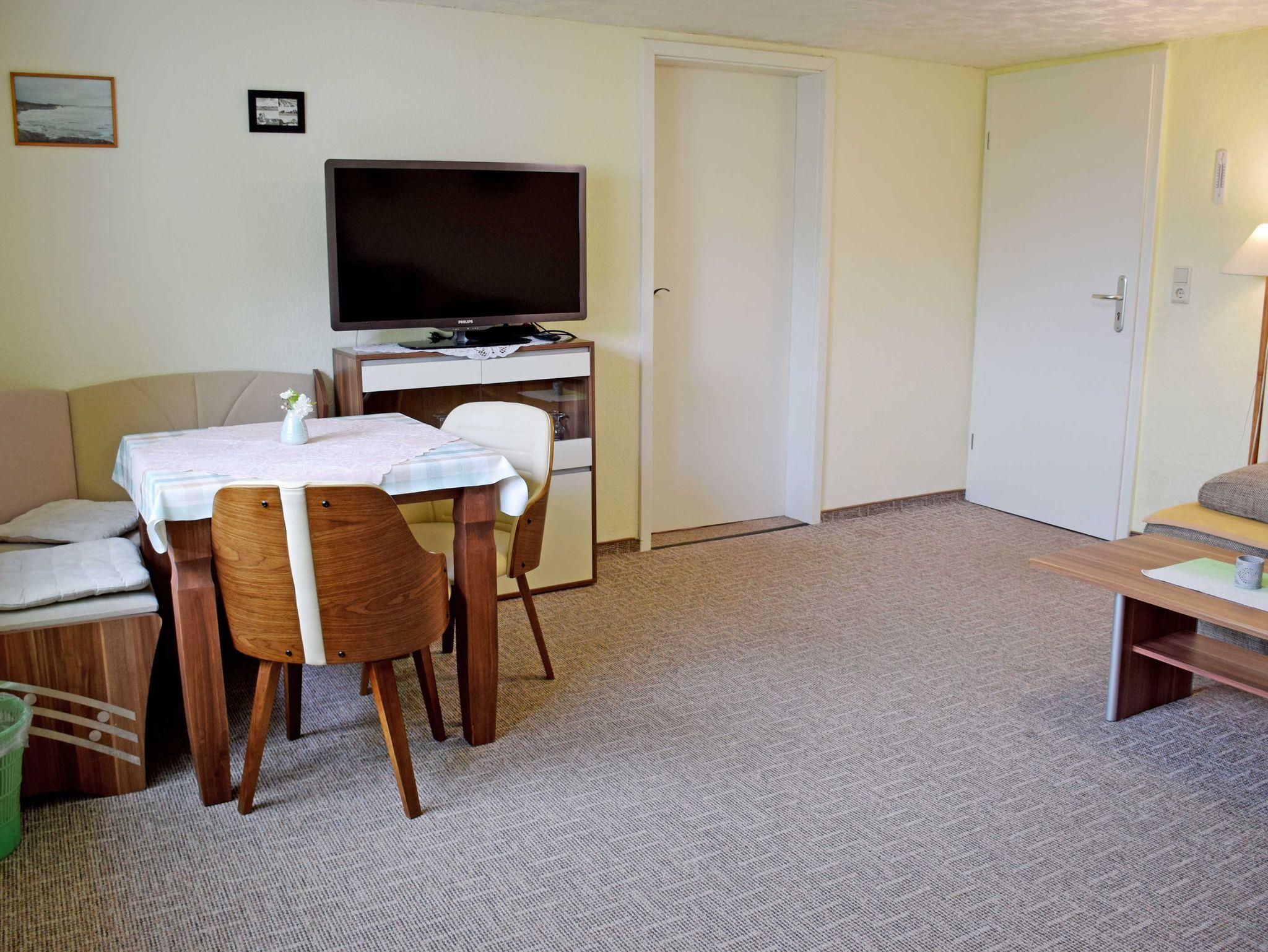 Unsere modern und liebevoll eingerichtete Ferienwohnung ost ist ca. 38qm groß, bietet Platz für maximal 2 Gäste. Im Schlafraum stehen ein bequemes Doppelbett mit Nachttischen und Leselampen sowie ein Schrank. Im Wohnzimmer befinden sich zwei Sessel mit Tisch, eine Sitzecke und ein moderner Flachbild-TV. In der kleinen Küche stehen eine Sitzecke mit Esstisch und eine Küchenzeile mit einem kleinen Cerankochfeld, Wasserkocher, Kaffeemaschine, Toaster und Kühlschrank ausgestattet. Vom Wohnzimmer aus gelangt man auf die Sonnenterrasse mit Gartenmöbeln, davor befindet sich eine Liegewiese zum Sonnen.