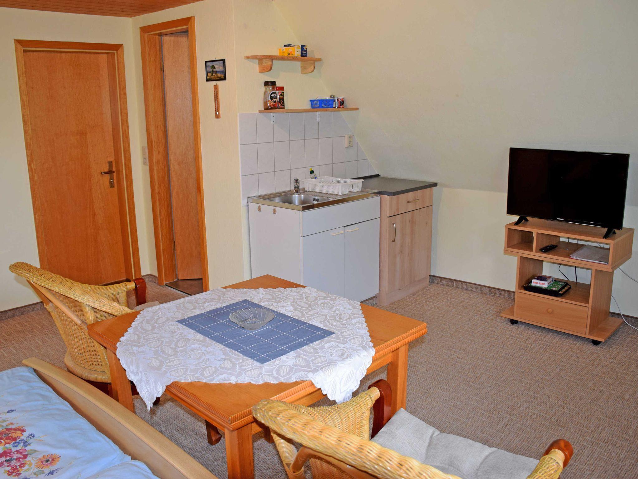 Unsere modern und liebevoll eingerichtetes Ferienzimmer Groot Parti liegt im Obergeschoss, ist ca. 20qm groß, bietet Platz für maximal 2 Gäste. Im kombinierten Wohn-/Schlafraum stehen ein bequemes Doppelbett mit Nachttischen und Leselampen sowie ein Schrank. Hier stehen auch zwei Sessel mit Tisch und ein moderner Flachbild-TV.