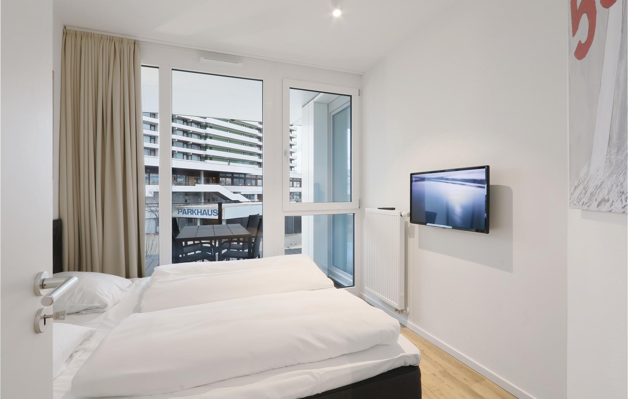 Jeres lejlighed ligger på første etage og har et separat soveværelse med en hyggelig dobbeltseng. I stuen kan I slappe af og nyde varmen og lyset fra biokaminen. Naturligvis er ferielejligheden i Travemünde Waterfront udstyret med moderne entertainment-system med bluray, musikanlæg med mp3-indgang samt to fjernsyn. I stuen finder I også en sovesofa med to sovepladser. Det er kun muligt at stille barnesengen op i stuen, da der ikke er plads i soveværelset.