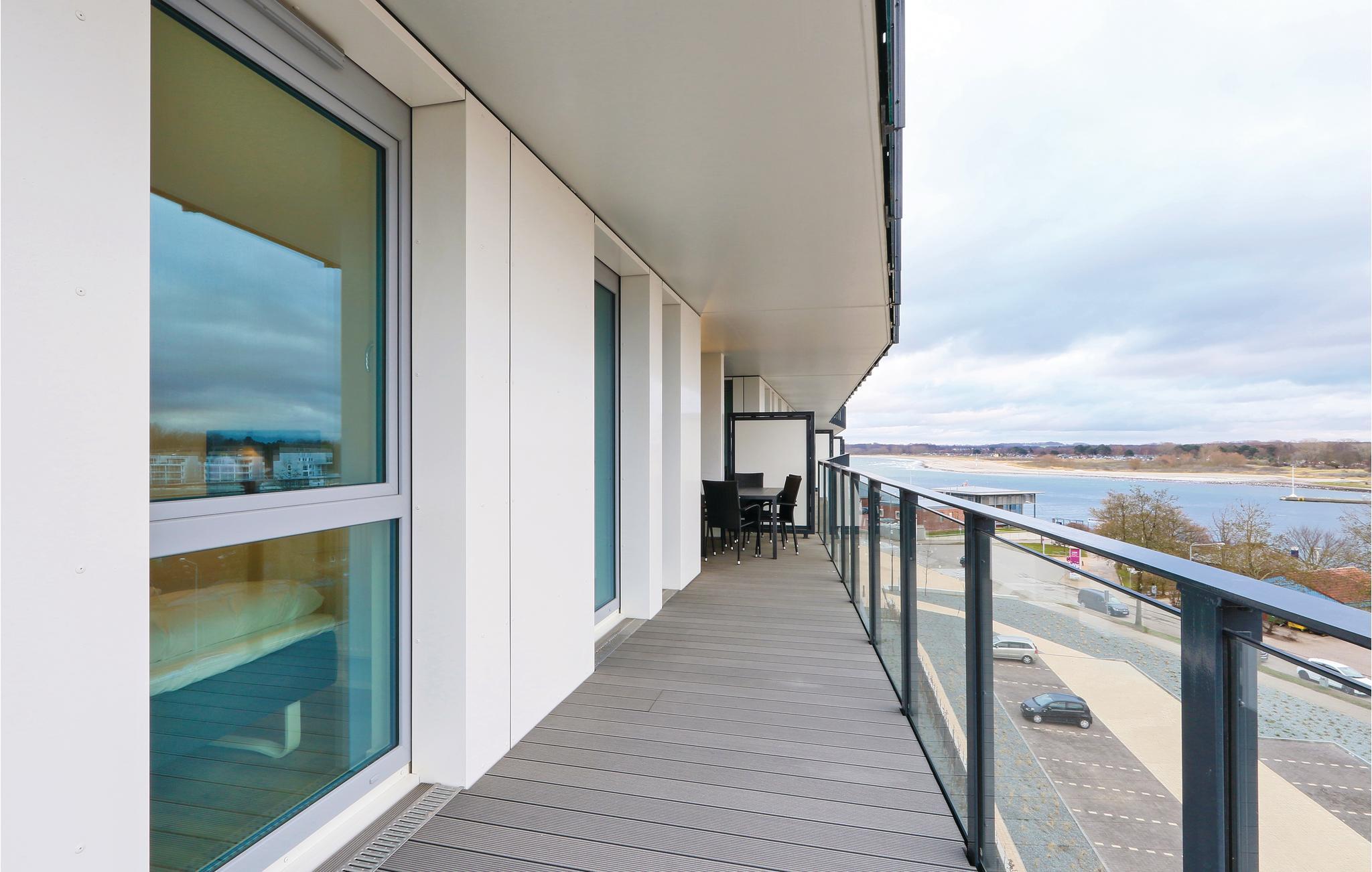 Jeres ferielejlighed ligger på 4. sal i anlægget med en fantastisk udsigt. Herfra kan I se over Priwall, sandstranden, floden Traves udmunding og de mange skibe der sejler forbi. Her er tre soveværelser, hver med en bekvem dobbeltseng. I stuen kan I gøre jer det hyggeligt foran kaminen der opvarmes med bio-ætanol. Der er også en ekstra sovesofa med to sovepladser i stuen. Det er kun muligt at stille barnesengen op i stuen, da der ikke er plads i soveværelset.