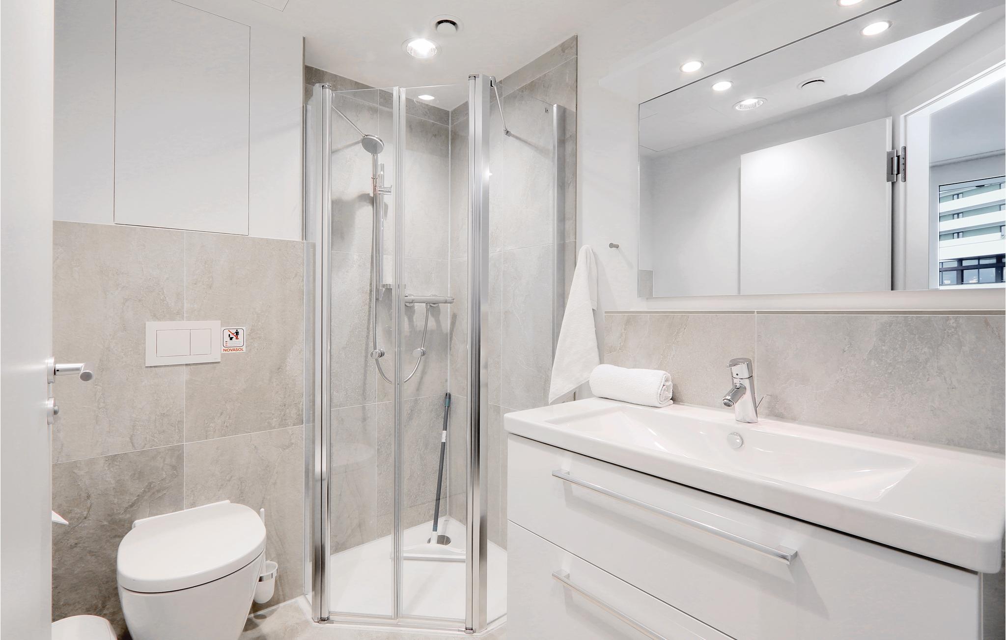 Badeværelset er et privat wellness anlæg. Her kan I nyde at sidde i saunaen efter en lang tur langs vandet. Desuden er der et dampbad med dobbelt regnvandsbruser.