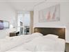 Lejligheden er indrette i minimalistisk hyggelig skandinavisk stil og vinduerne der går fra gulv til loft lukker masser af lys ind.