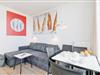 Lejligheden er indrettet i minimalistisk hyggelig skandinavisk stil og vinduerne der går fra gulv til loft lukker masser af lys ind.