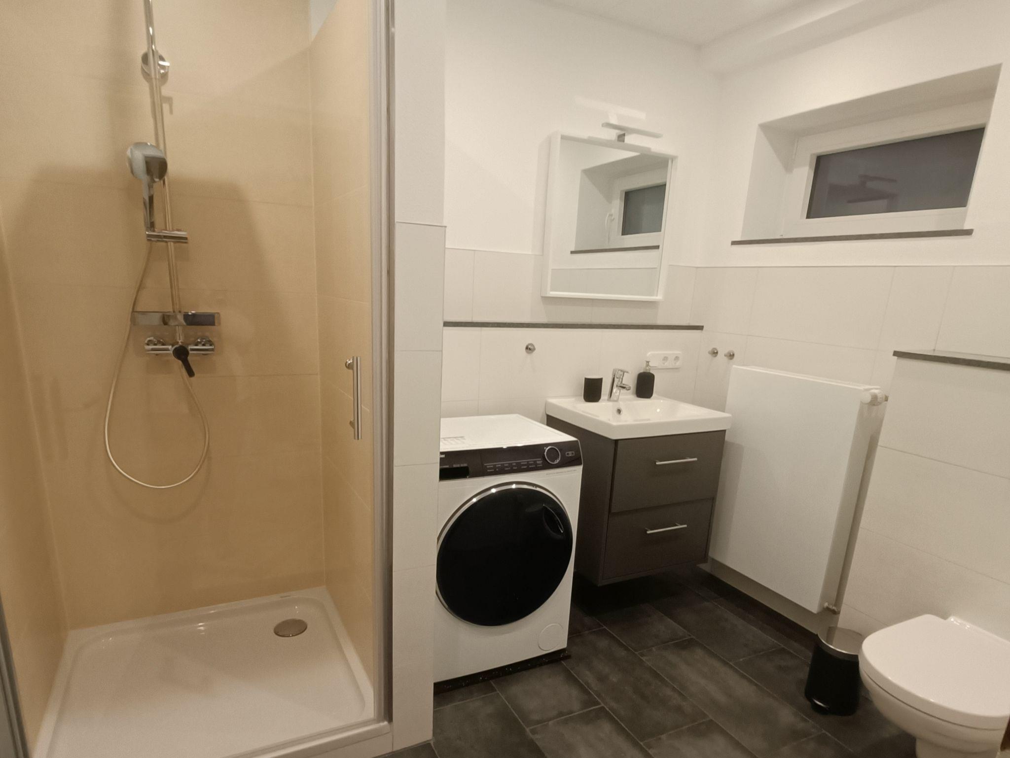 Im Badezimmer finden Sie eine Dusche mit Handbrause und Regendusche, sowie WC und Waschbecken. Ein Waschtrockner, bestehend aus einer Waschmaschine mit integriertem Trockner, steht Ihnen ebenfalls zur Verfügung.