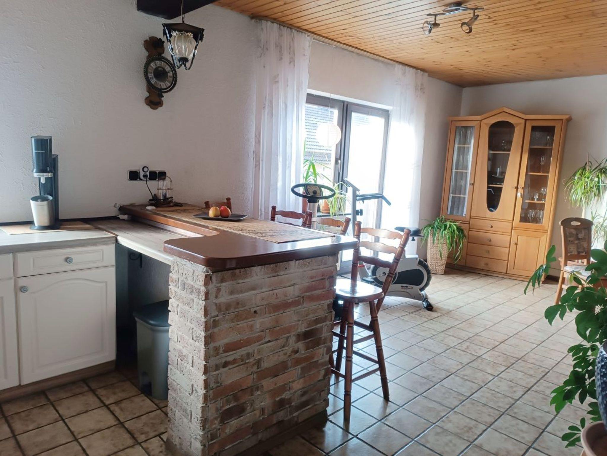 Genießen Sie erholsame Tage in unserer großzügigen, ca. 100 m² großen Ferienwohnung, die keine Wünsche offen lässt. Die voll ausgestattete Küche lädt zum Kochen ein, und auf Anfrage steht Ihnen eine kleine Kühltruhe zur Verfügung. Eine stilvolle Theke trennt die Küche vom geräumigen Essbereich, von dem aus Sie direkt auf die sonnige Terrasse gelangen – ein perfekter Ort zum Entspannen.