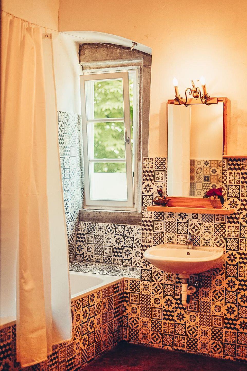 Willkommen in der Suite Therese. Über die steinerne Wendeltreppe eines 500 Jahre alten Turms gelangt ihr im zweiten Stock von Schloss Weitersroda zur Suite Therese. Hier entfaltet sich auf 125 m² ein märchenhaftes Refugium für bis zu 12 Gäste – mit einem großen Eichentisch für alle Gäste und Blick auf den Schlosshof und dessen prachtvolle Bäume.