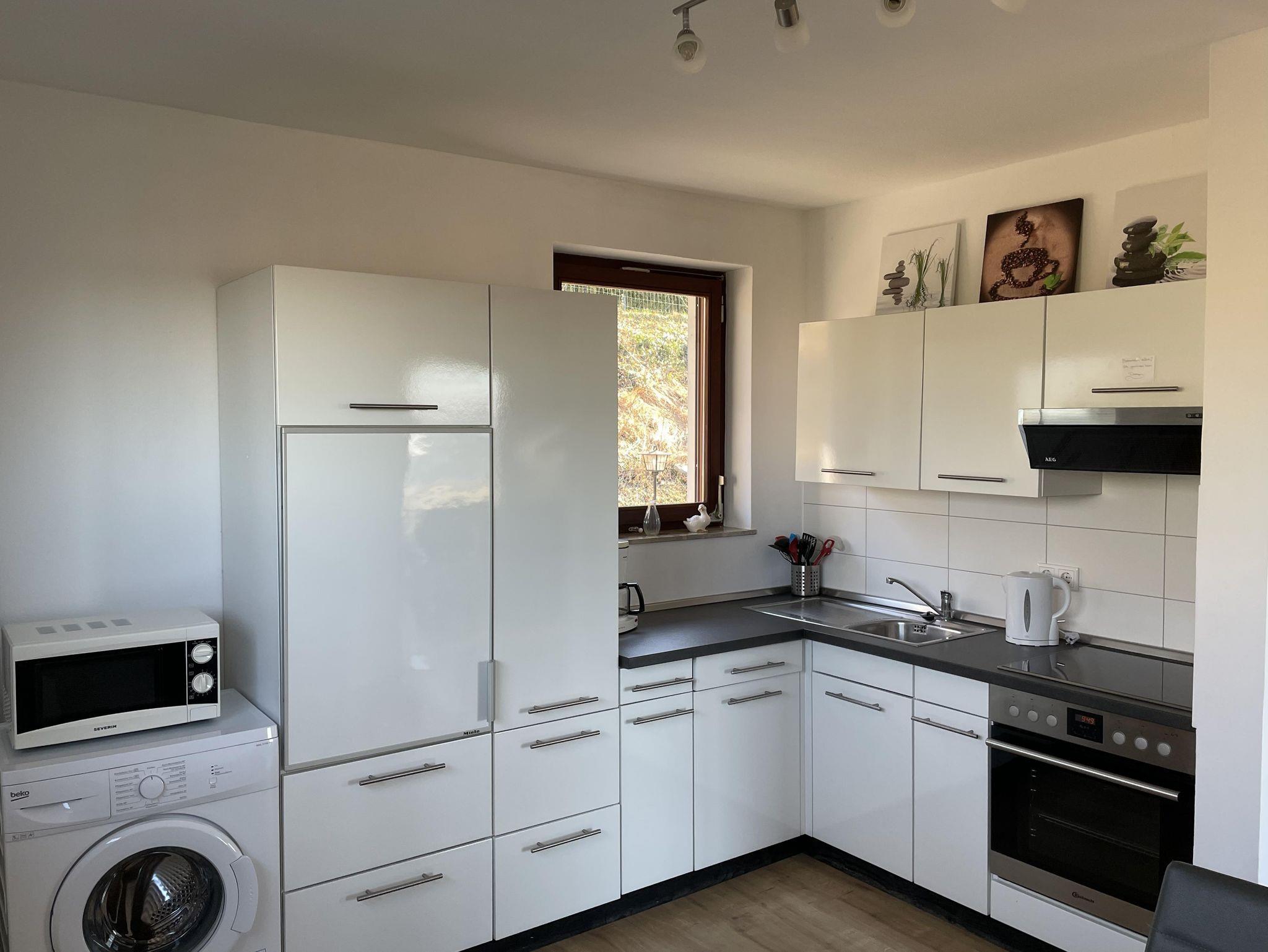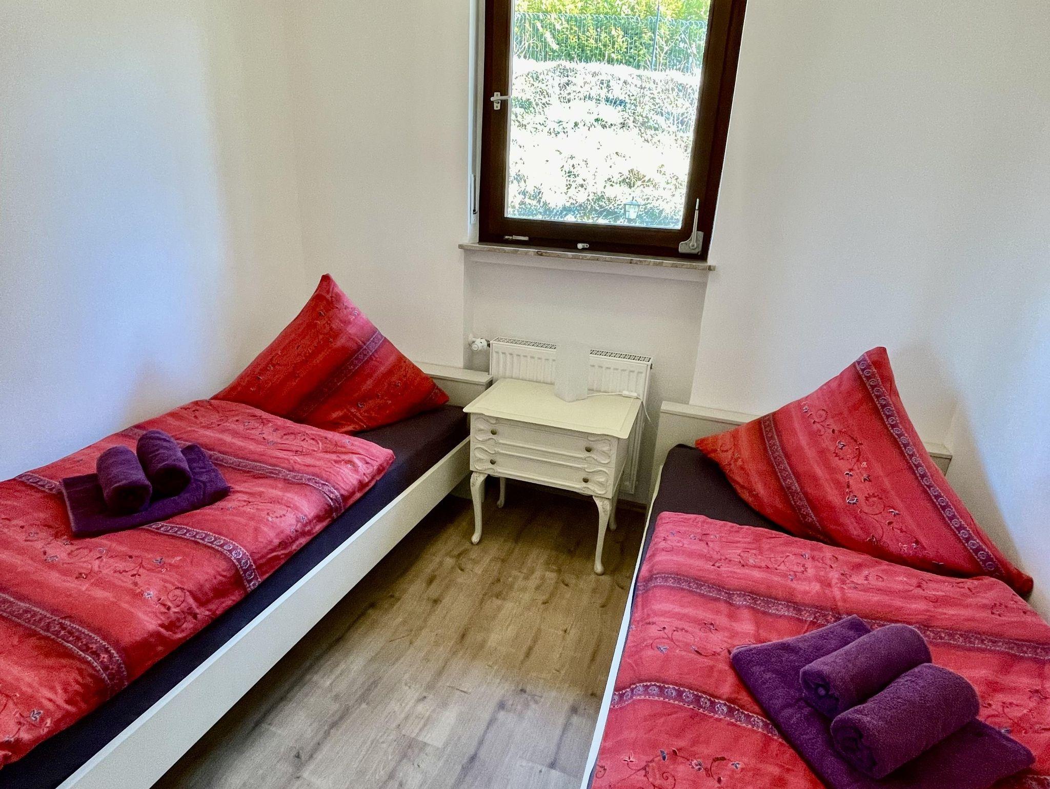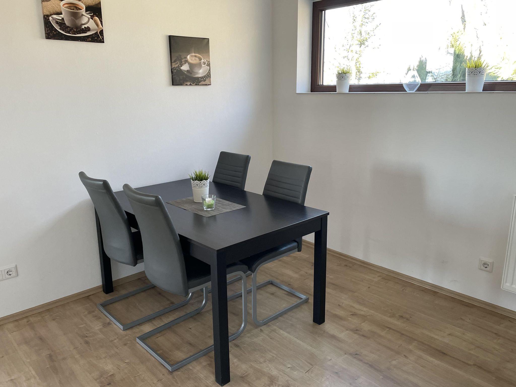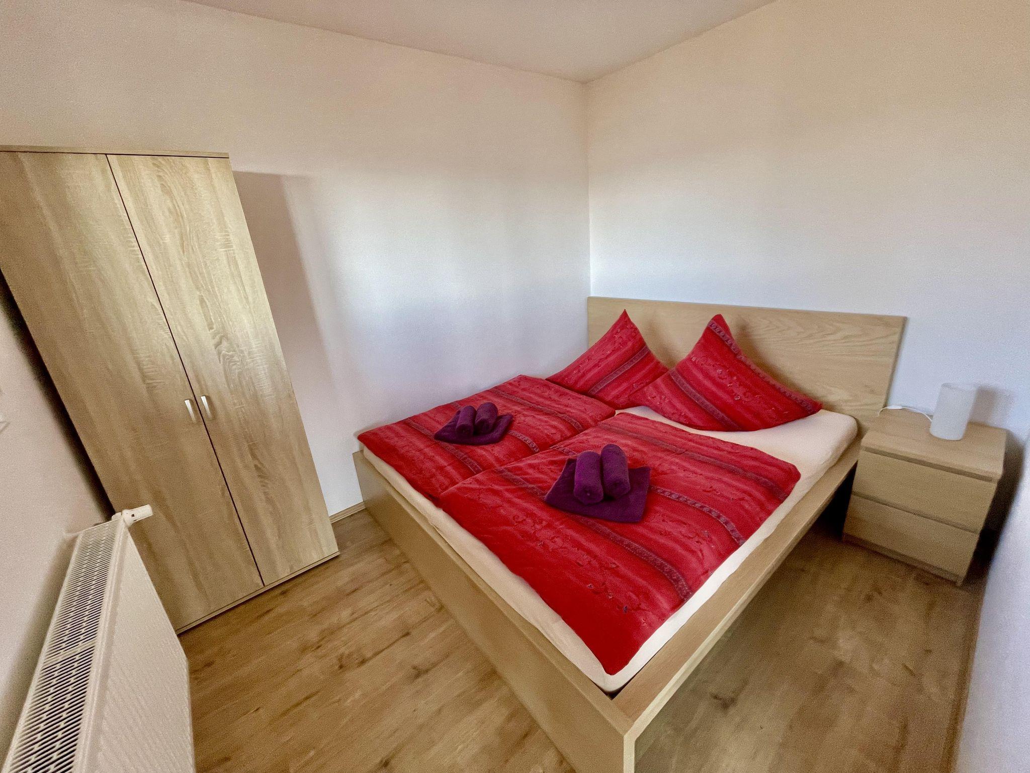 Die großzügige 60qm große Wohnung bietet Platz für bis zu vier Personen (Schlafzimmer mit Doppelbett 180x200cm und ein weiteres mit zwei Einzelbetten 90x200cm), Bad mit Dusche und WC, Wohnbereich mit Couchecke, Radio und TV, einer komplett eingerichteten Küche mit Essbereich.