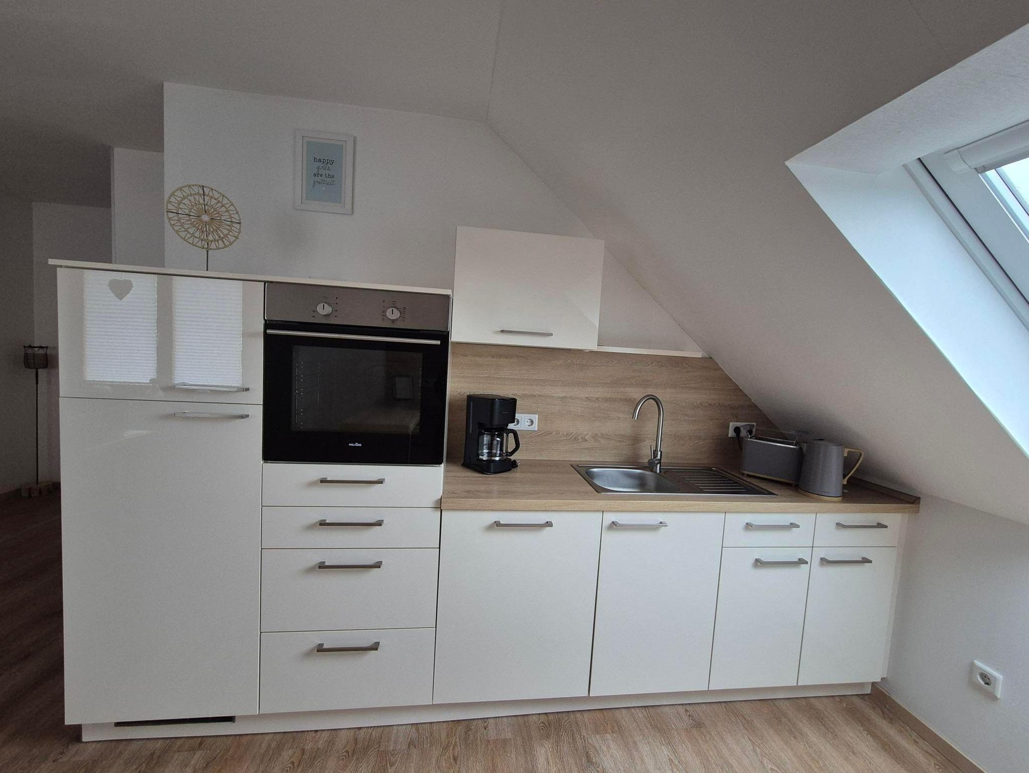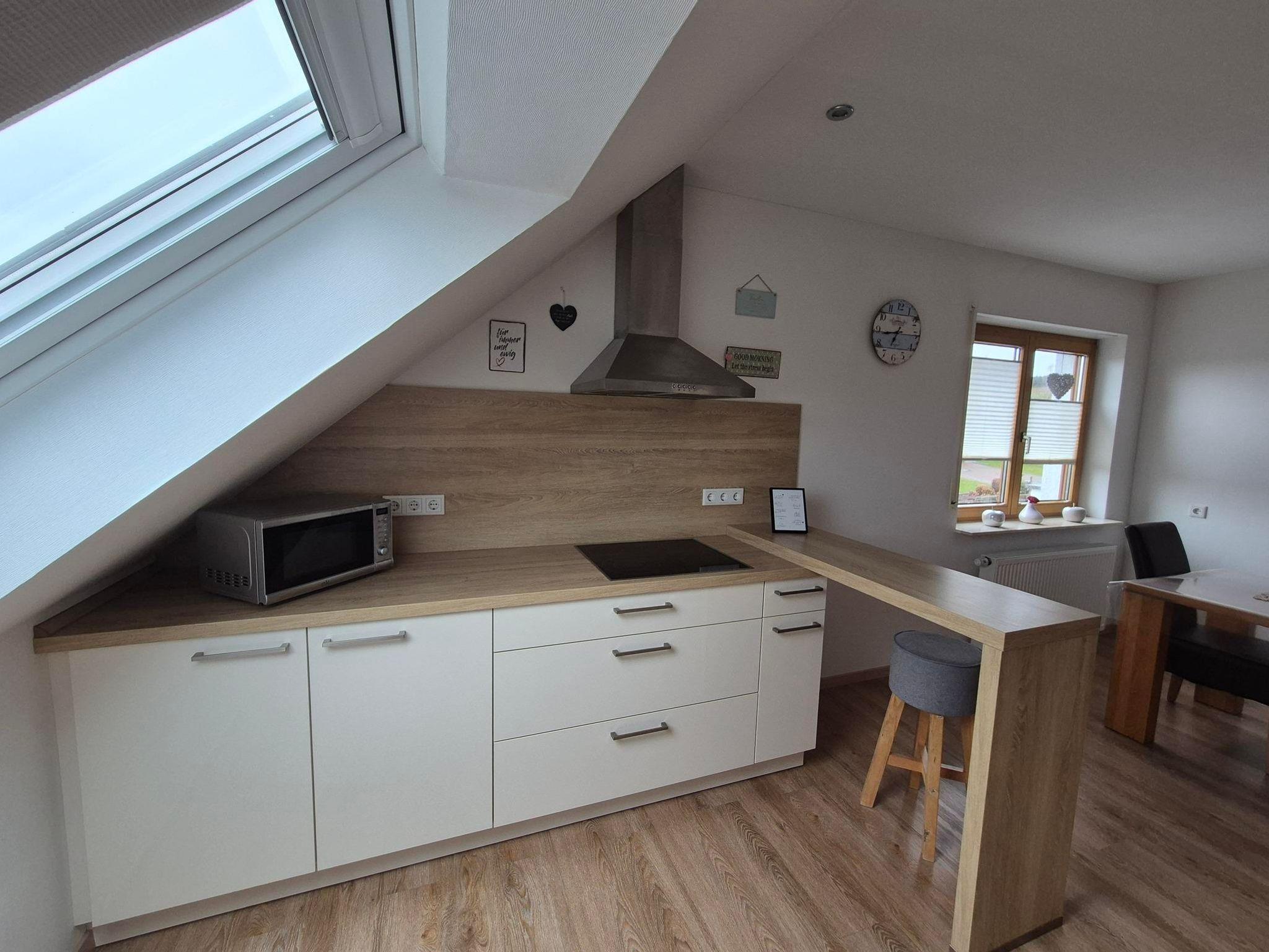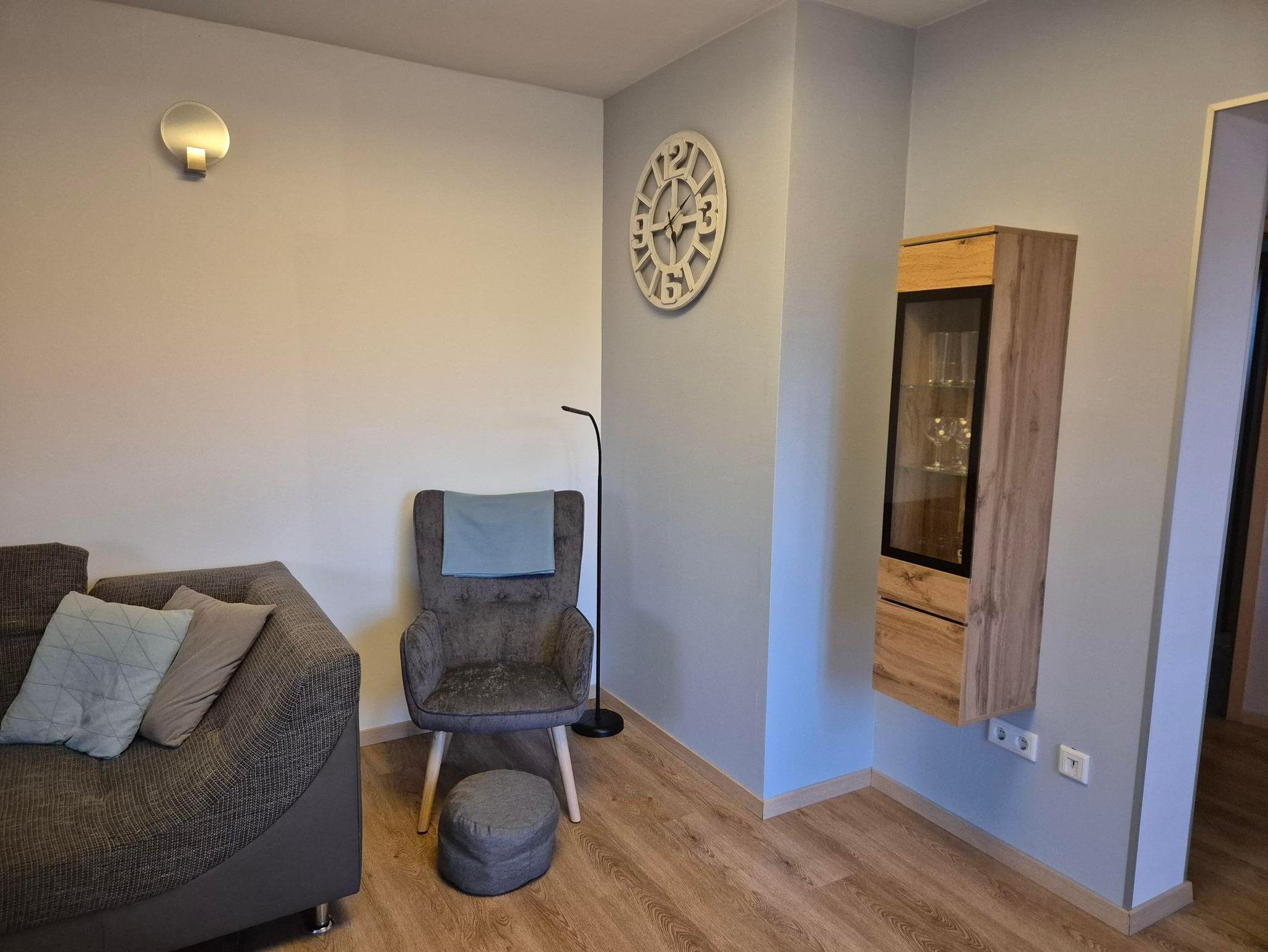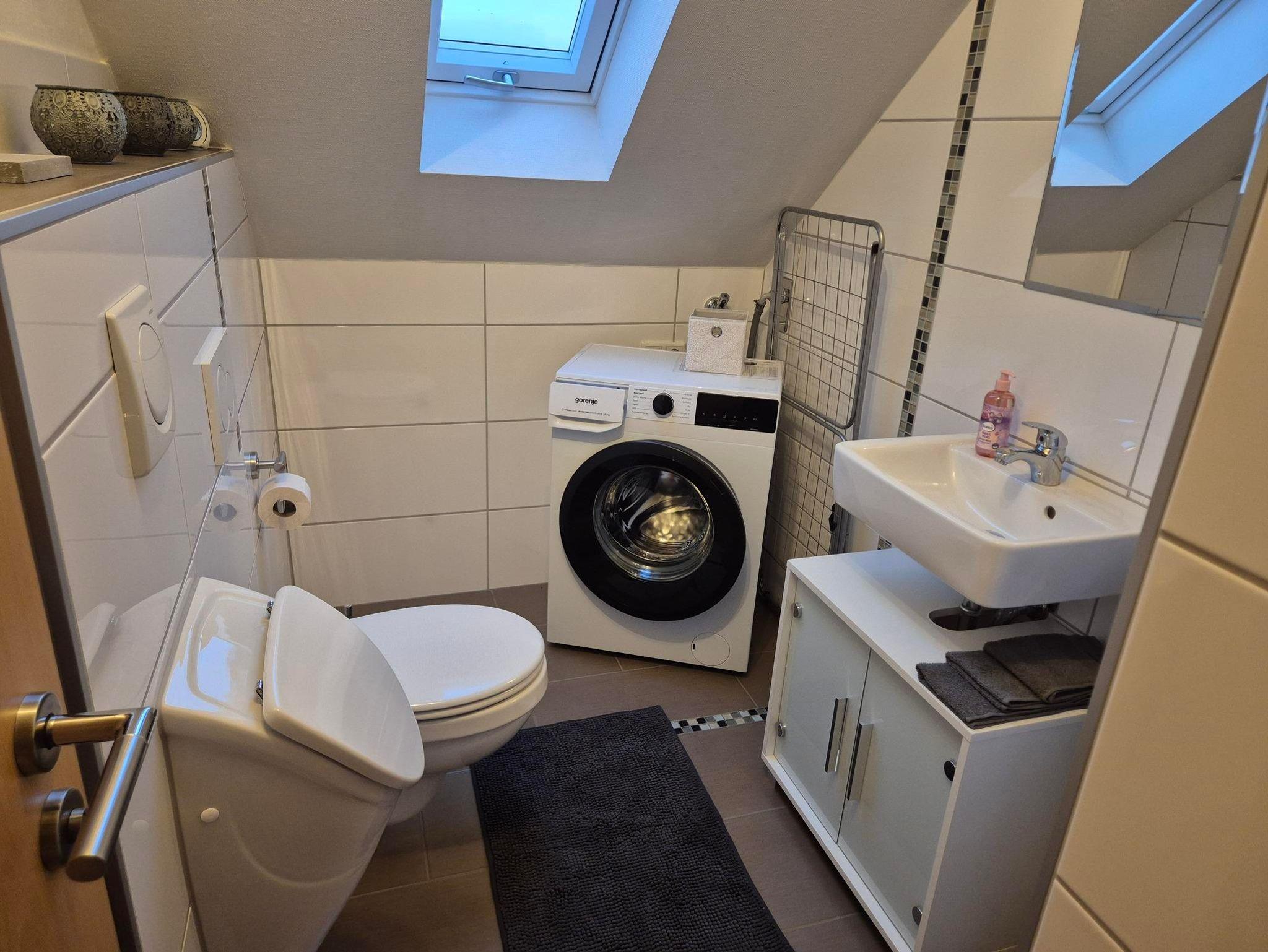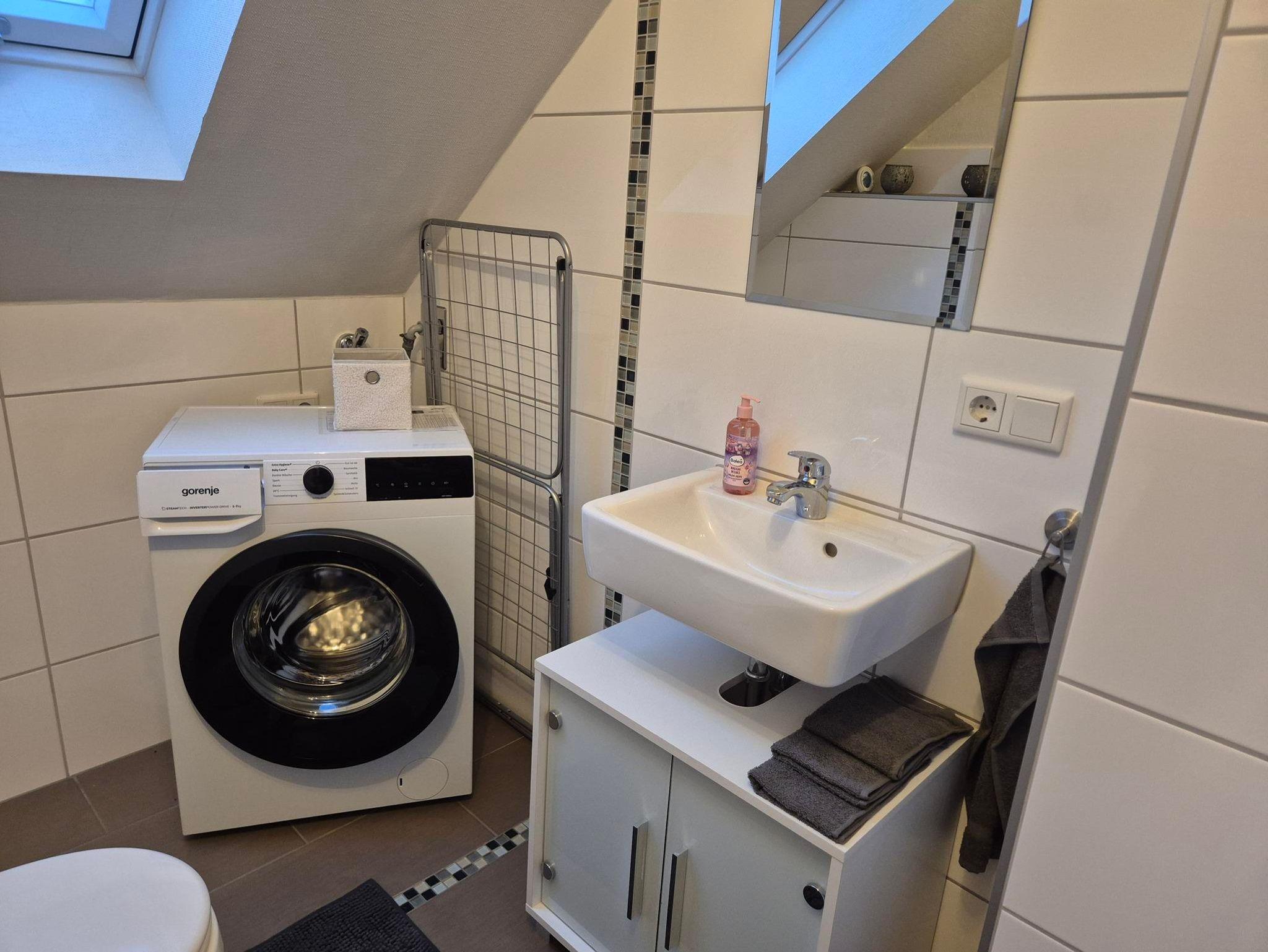 Der einladende Wohnbereich lädt zum Verweilen ein, während die voll ausgestattete Küche mit Annehmlichkeiten wie einer Geschirrspülmaschine, einer Mikrowelle und weiteren praktischen Geräten keine Wünsche offenlässt. Zusätzlich steht Ihnen eine eigene Waschmaschine zur Verfügung – ideal für längere Aufenthalte.
