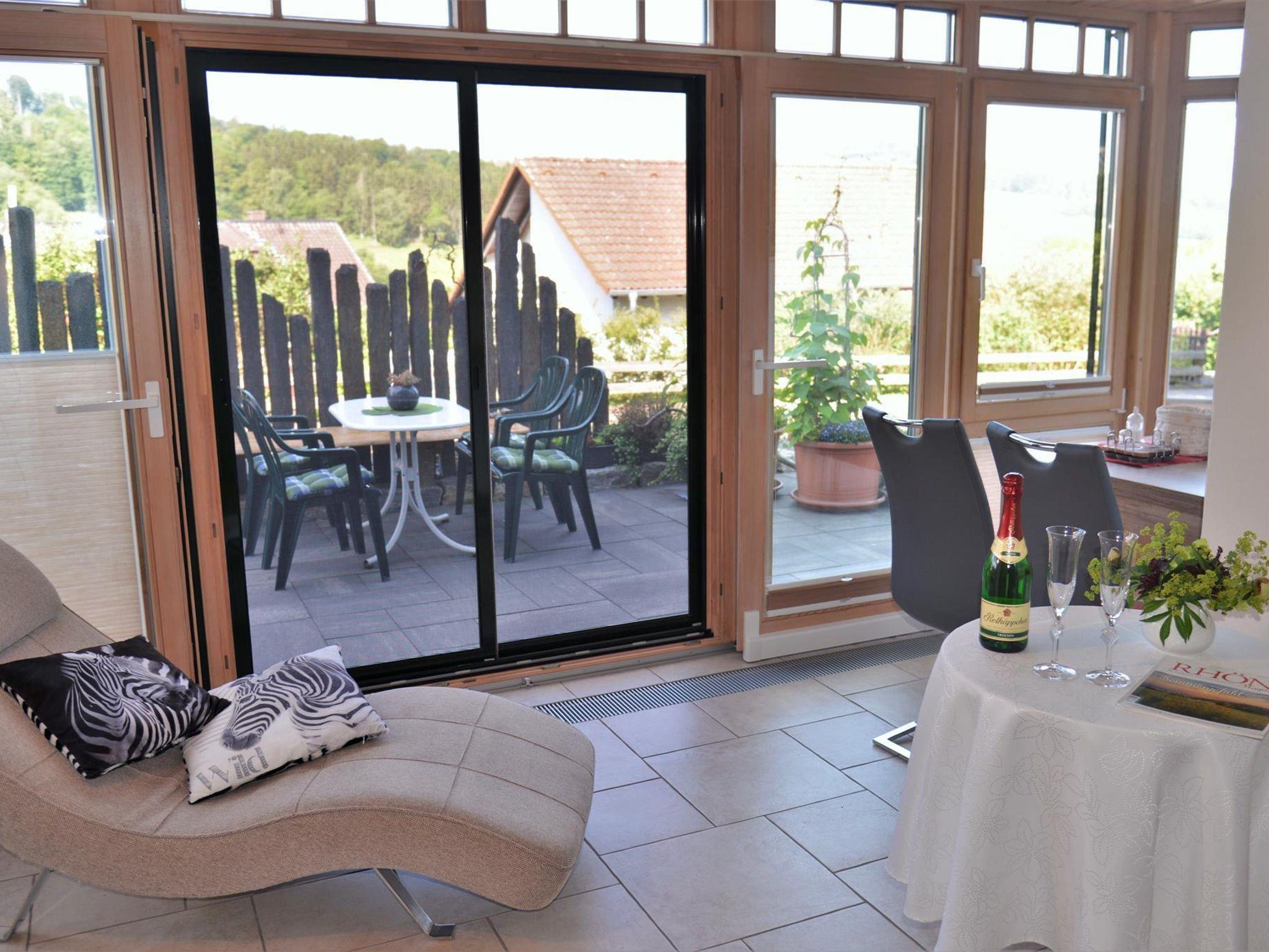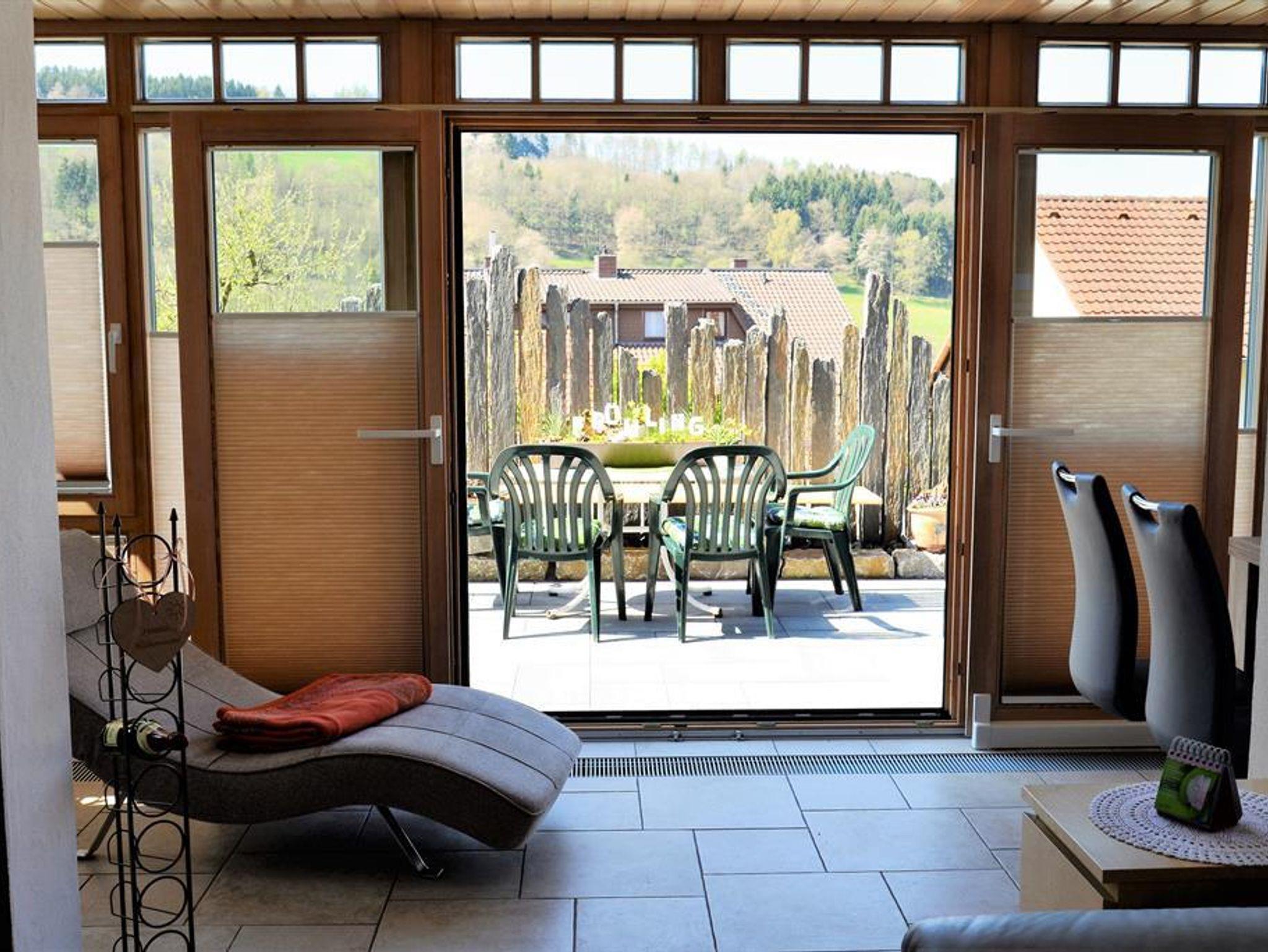 Im Wohnraum laden eine gemütliche Polstergarnitur, Flachbild TV und DVD Player zum kuscheln ein, der daran angegliederte sonnendurchflutete Wintergarten mit Innen- und Außenbeschattung bietet einen Essplatz sowie eine Leseecke mit Relaxliege.