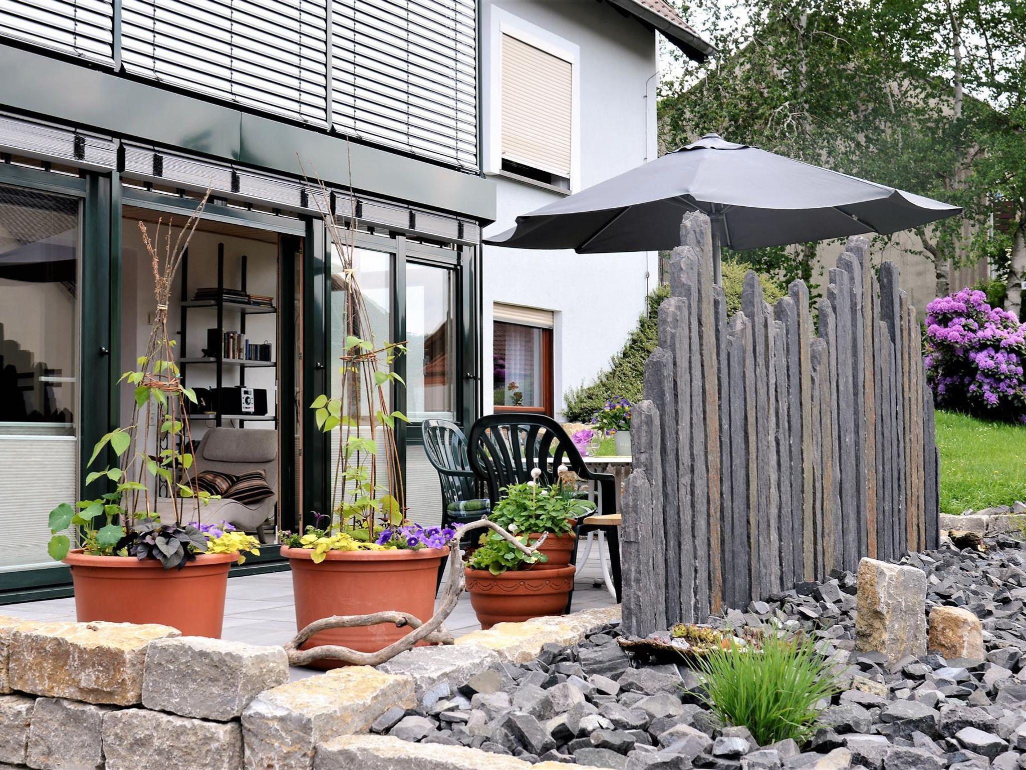 Die große Sonnenterrasse (20 qm) mit Stühlen, Tisch, Sonnenliegen und Sonnenschirm lädt zum Ausspannen, Ruhe finden und Genießen ein.