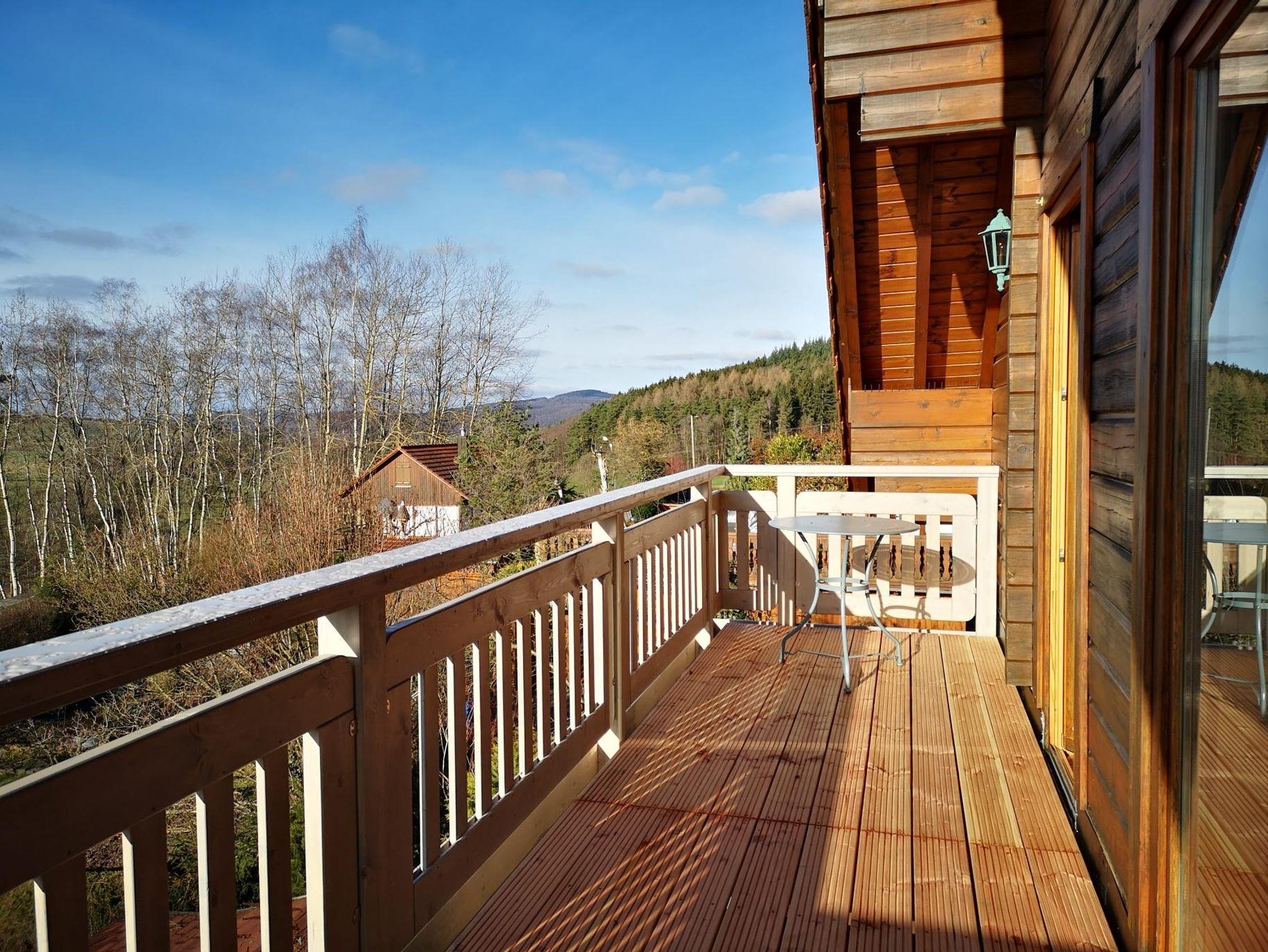 Genießen Sie die Aussicht auf Wiesen und Wald auf dem Balkon bzw. der Holzterrasse.