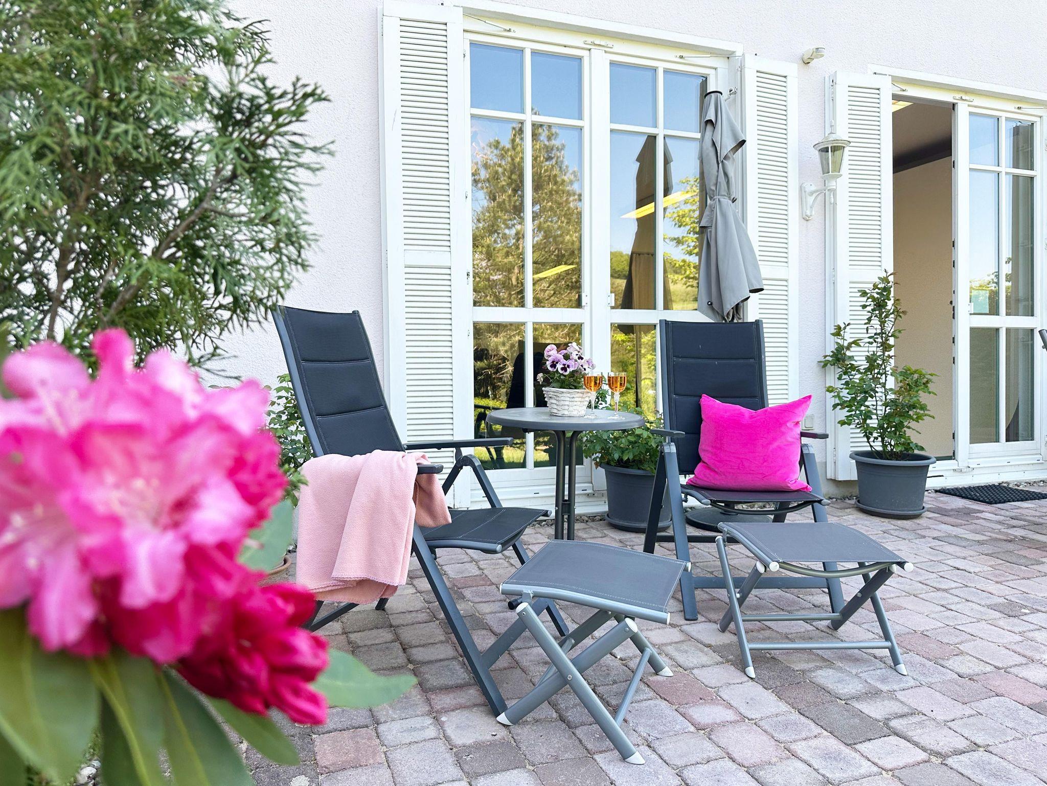 Gerne nutzen Sie im Sommer unseren großzügigen Garten mit Liegewiese und Gartenmöbeln. Über einen großzügigen Aufenthaltsraum mit 6-8 Plätzen erreichen Sie in unseren Garten.