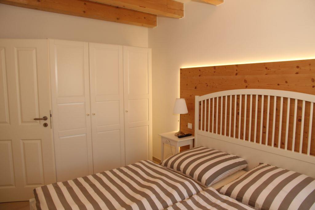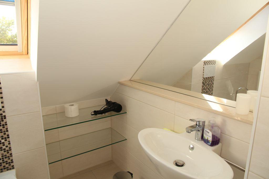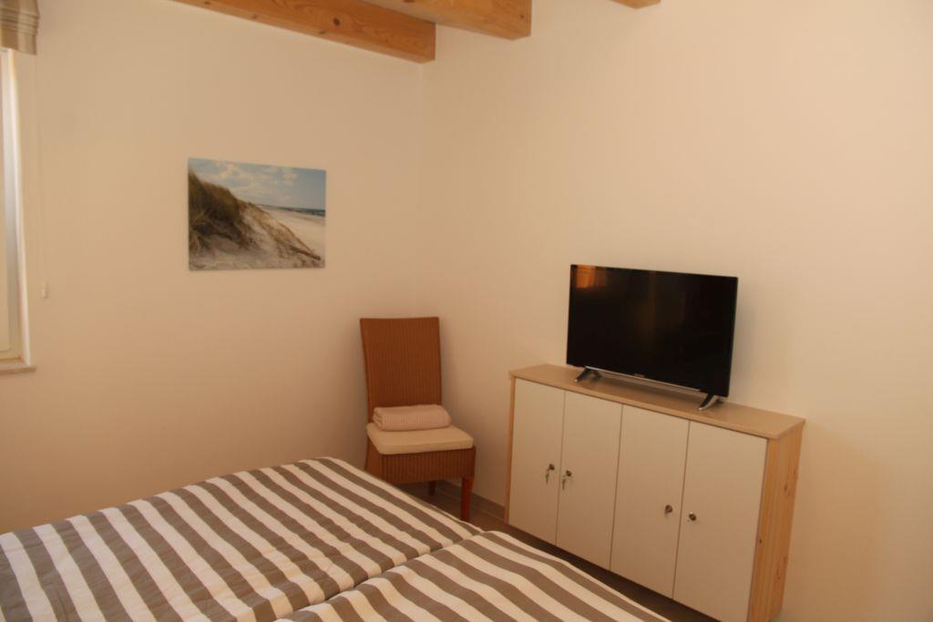 Ein Schlafzimmer mit Doppelbett, Kleiderschrank und Fernseher sowie ein Bad mit Badewanne, Dusche, WC, Waschbecken und Föhn sind noch im Erdgeschoss zu finden. Ebenso ein Abstellraum mit Waschmaschine und Trockner.